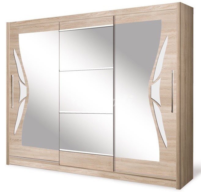 Moderní šatní skříň Dome s posuvnými dveřmi a zrcadlem je vyrobena z kvalitního lamina. Korpus a dveře jsou v dezénu sonoma a ozdobné prvky jsou v dezénu bílá lesk. Šatní skříň je vybavena policemi a šatní tyčí. Díky svému vnitřnímu vybavení nabízí tato šatní skříň velký úložný prostor. Je vhodná do ložnice, ale i např. do předsíně. Zboží dodáváme v demontu.