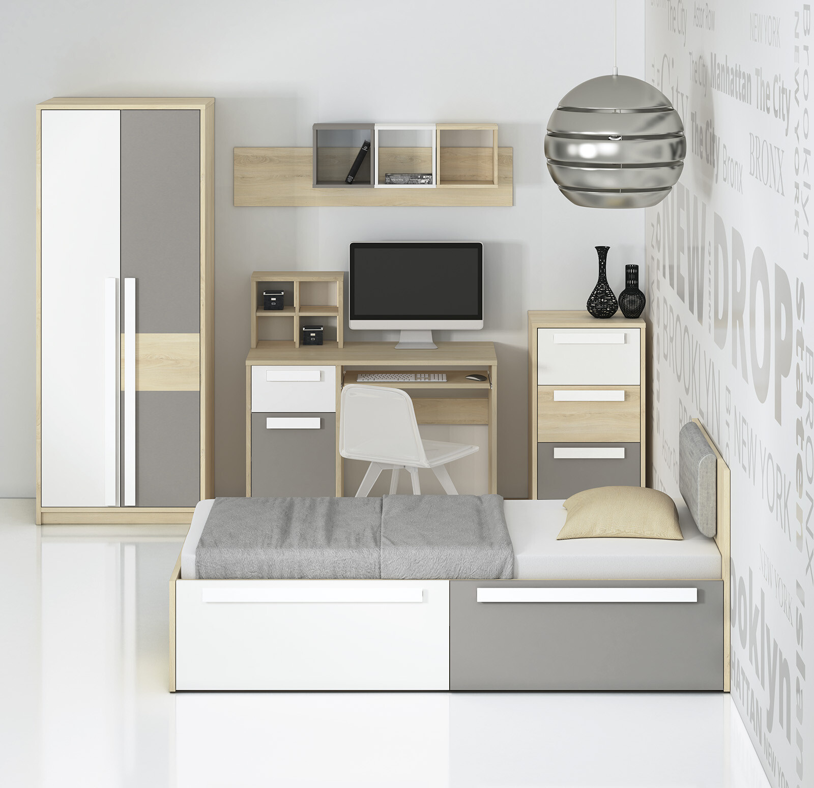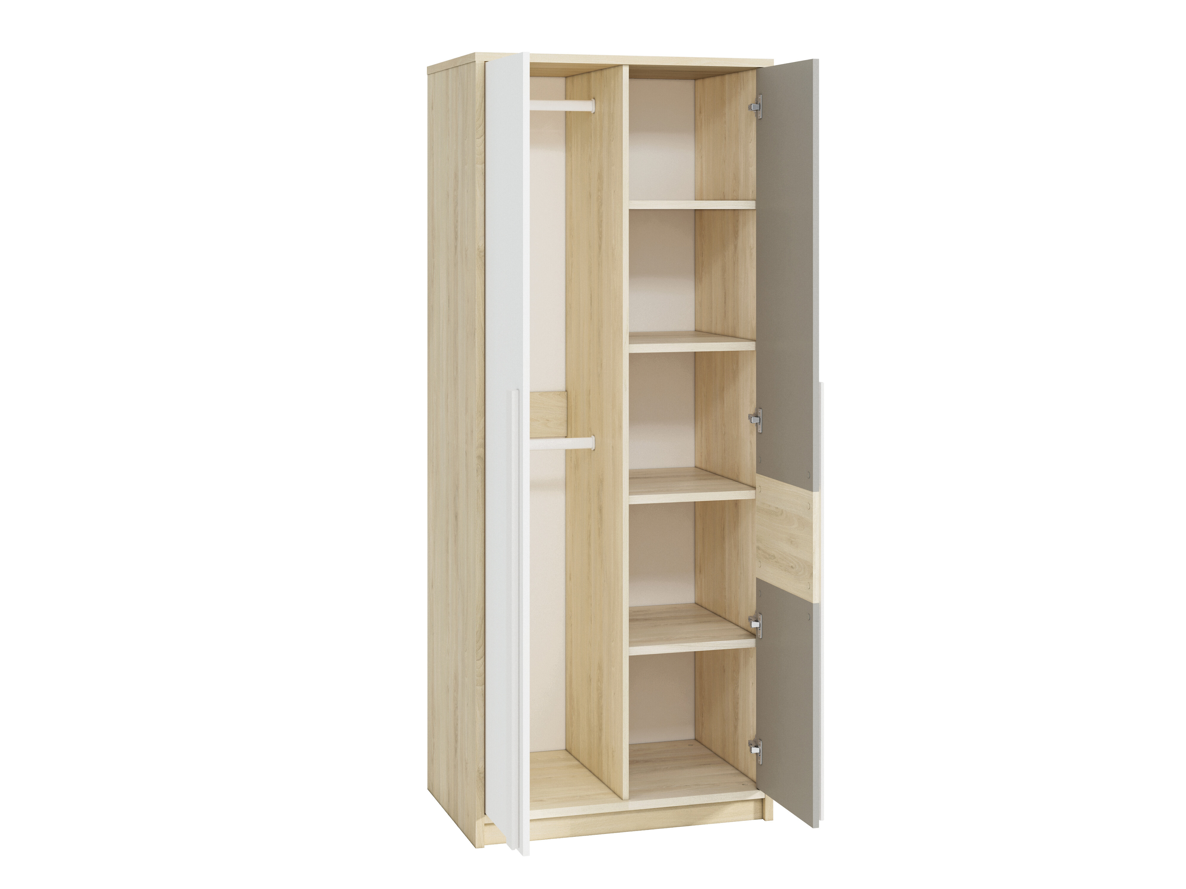 Šatní skříň Drop je vyrobena z kvalitního lamina korpus o korpusy o tl. 22mm, dvířka o tl. 16m s ABS hranami. Korpus je v provedení buk fjord a dvířka bílá/buk fjord/šedá platina. Úchyty jsou dřevěné. Zboží je dodáváno v demontu.