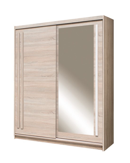 Moderní, prostorná a praktická šatní skříň s posuvnými dveřmi je vyrobena z kvalitní laminované LTD desky o tl.16 mm v dezénu dub sonoma doplněná o úchyt v barvě bílá andersen. Šatní skříň je opatřena velkým zrcadlem, které krásně prosvětlí a opticky zvětší prostor ve kterém se nachází. Skříň disponuje 5 policemi a šatní tyčí. Zboží dodáváme v demontu.