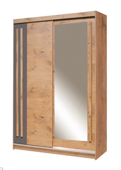 Moderní, prostorná a praktická šatní skříň s posuvnými dveřmi je vyrobena z kvalitní laminované LTD desky o tl.16 mm v dezénu dub lancelot doplněná o úchyt a efektní prvek v barvě cobalt. Šatní skříň je opatřena velkým zrcadlem, které krásně prosvětlí a opticky zvětší prostor ve kterém se nachází. Skříň disponuje 5 policemi a šatní tyčí. Zboží dodáváme v demontu.