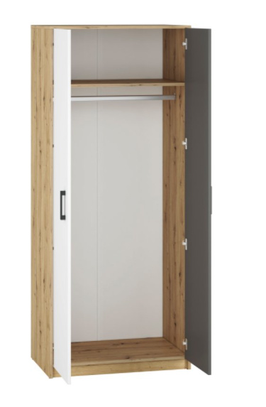 Šatní skříň FINI 01 je součástí systémového nábytku FINI ale lze ji použít i samostatně nebo k jinému nábytku. Konstrukce a přední díly jsou vyrobeny z kvalitního a odolného lamina v dekoru dřeva v kombinaci s bílou a antracitovou barvou. Úchytky jsou plastové v černé barvě.