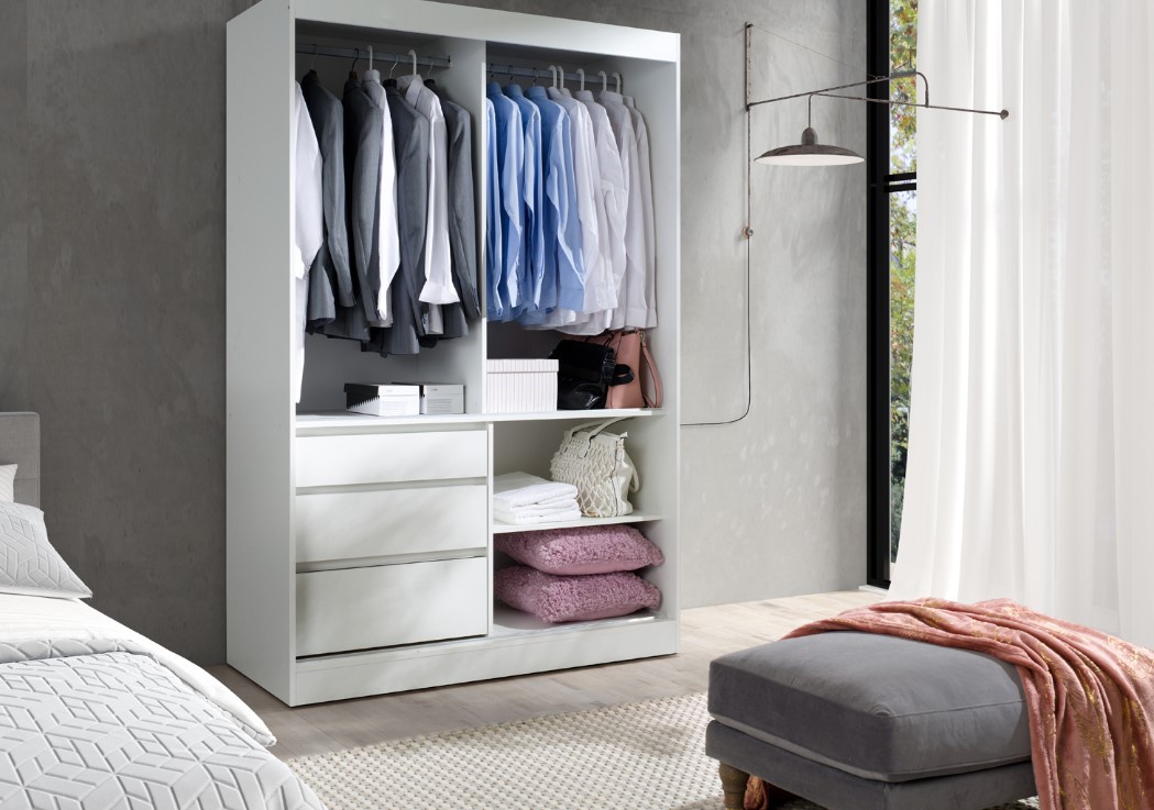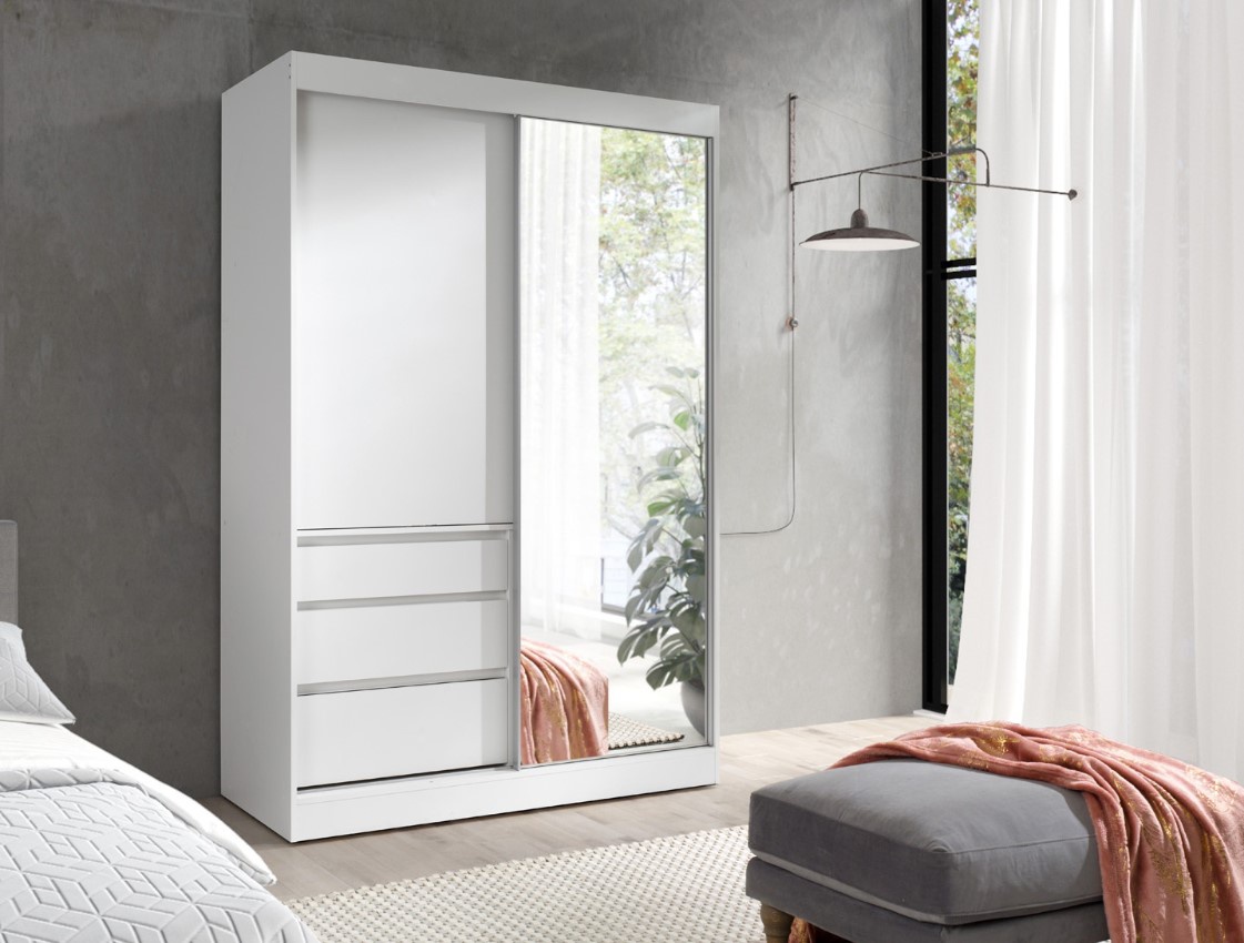 Praktická šatní skříň HAITI 140 se zrcadlem, s posuvnými dveřmi v moderním barevném provedení bílá. Skříň šíře 140 cm je rozdělena na dvě částí, v níž jsou police a šatní tyče. Pravá část této skříně je rozdělená na šatní tyč na ramínka a dvě police. Levá část skříně je s tyčí na ramínka a šuplíky. Díky vnitřnímu uspořádání skříně má každá věc své místo. Zboží dodáváme v demontu.