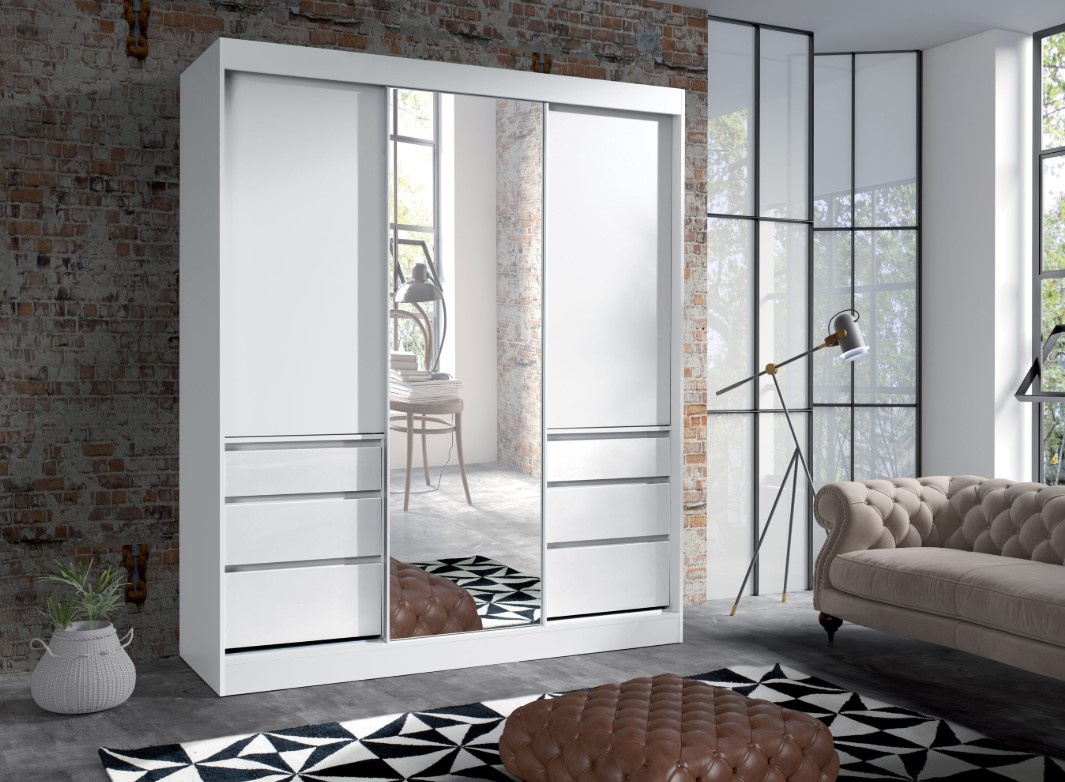 Praktická šatní skříň HAITI 180 se zrcadlem, s posuvnými dveřmi v moderním barevném provedení bílá. Skříň šíře 180 cm je rozdělena na tři části, v níž jsou police, zásuvky a šatní tyče. Díky vnitřnímu uspořádání skříně má každá věc své místo. Zboží dodáváme v demontu.