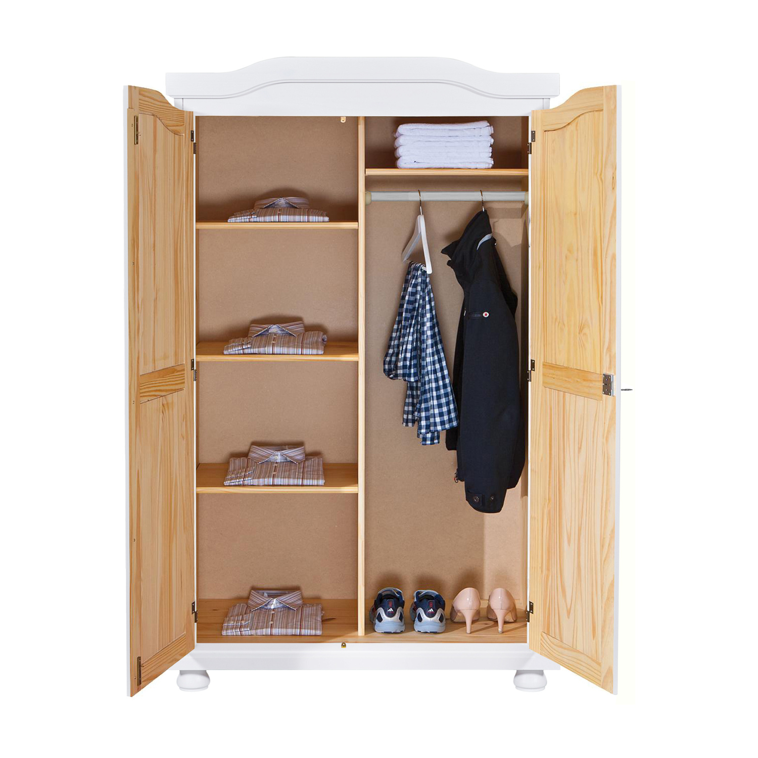 Šatní skříň HEDDA v provedení masiv borovice bíle lakovaný bude vypadat opravdu kouzelně jak v ložnici, tak v dětském pokojíčku či šatně. Okouzlující design skříně nás zavede do dob, kdy i krásné kousky nábytku byly především praktické a v místnosti vypadaly dokonale. Tato skříň v rustikálním stylu tak najde své uplatnění i na chalupách a chatách, myslíme si však, že takto unikátní nábytek by měl stát i ve vaší ložnici. Skříň má prostor dělený na dvě poloviny, v jedné nalezneme šatní tyč s policí a ve druhé tři variabilní police, oblečení bude vždy prakticky rozděleno. Zboží je dodáváno v demontu.