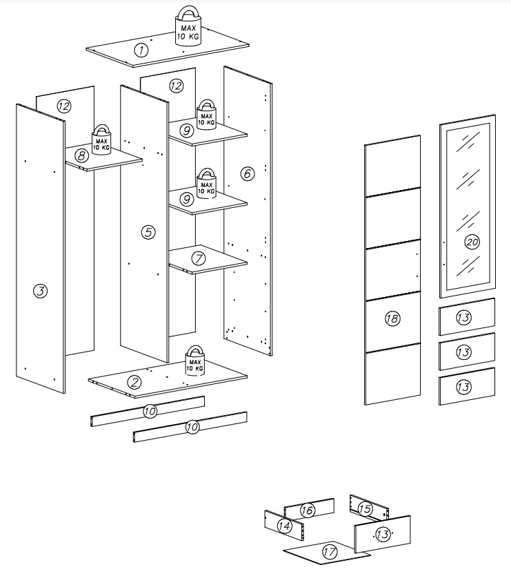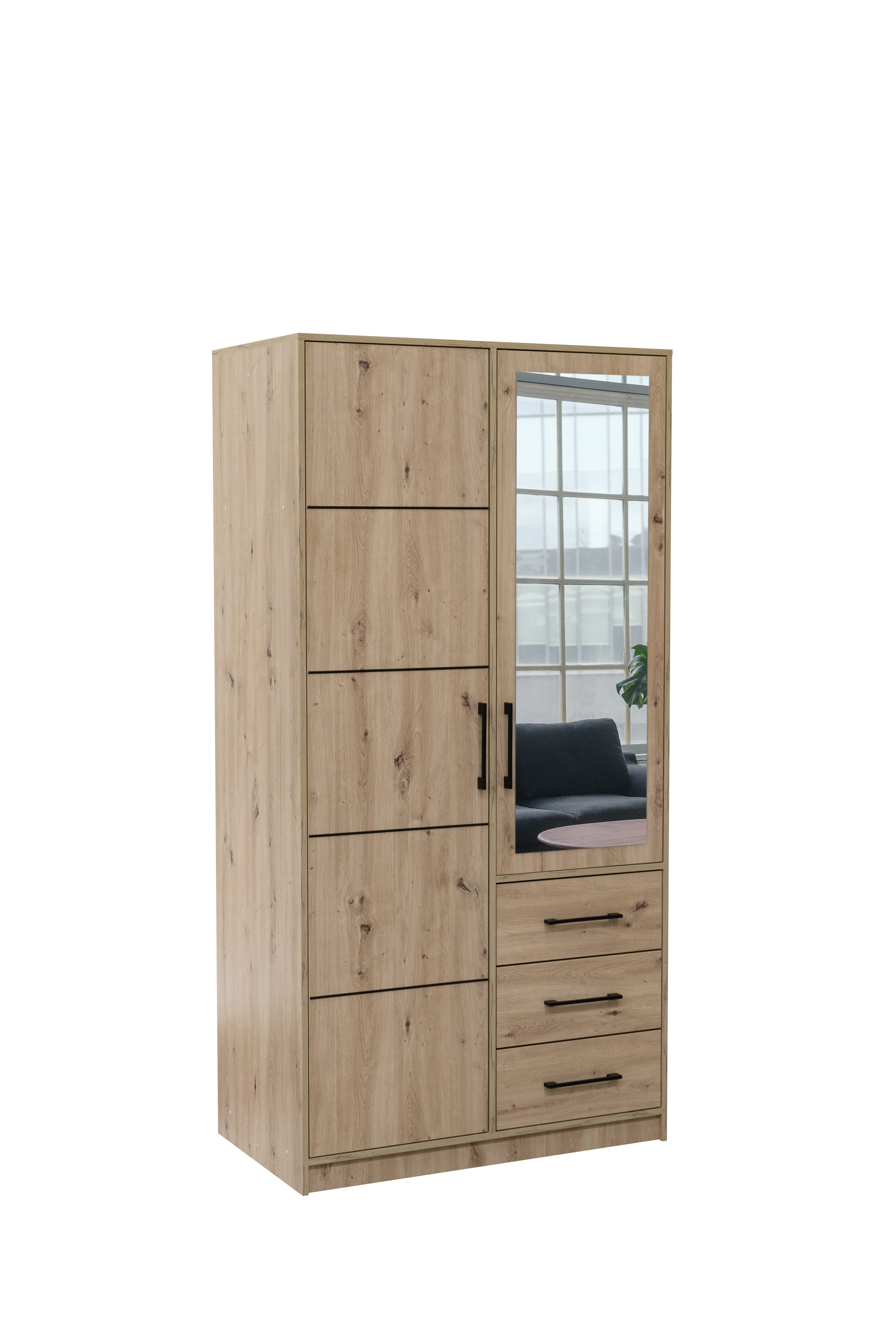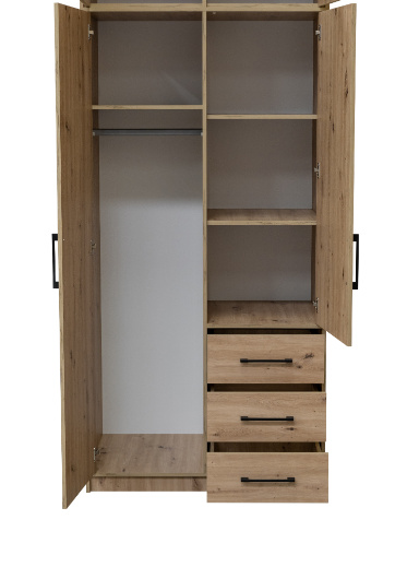Šatní skříň Kos je vyrobena z kvalitní laminované dřevotřísky o síle 16 mm v dezénu dub artisan. Hrany skříně jsou opatřeny ABS páskami. Černé kovové úchytky a černé ozdobné lišty. Zboží dodáváme v demontu.