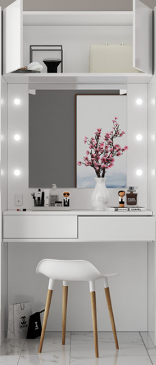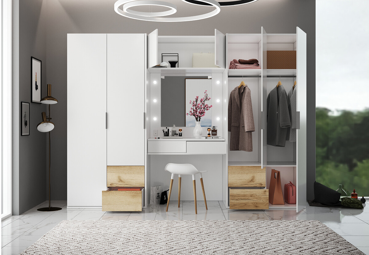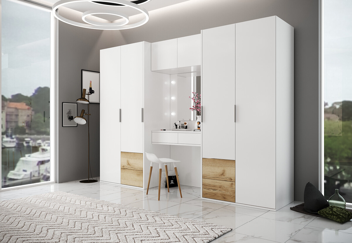 Šatní skříň Latina je vyrobena z kvalitní laminované dřevotřísky o síle 16 mm v bílé matné barvě v kombinaci dub grand přírodní. Hrany skříně jsou opatřeny ABS páskami. Tato šatní skříň nabízí mnoho úložného prostoru (4x šatní tyč, 7x police a 6 x zásuvka), toaletní stolek s Led osvětlením zrcadla a USB vstup. Zboží dodáváme v demontu.