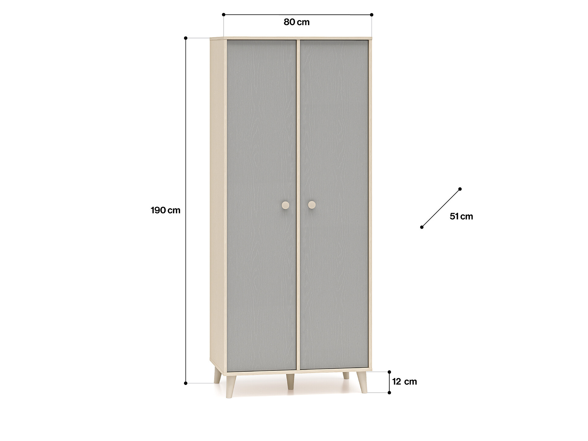 Šatní skříň Mevel je vyrobena z vysoce kvalitní laminované dřevotřískové desky s ABS hranou v elegatní kombinaci béžového ( pískového) korpsu a šedých (palland) dvířek v matném provedení. Dvířka s tichým dovíráním, pro bezpečné a tiché otevírání, s béžovými kulatými úchyty. Nosnost jedné police 10 kg. Zboží dodáváme v demontu.