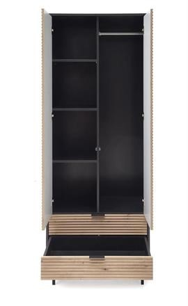 Šatn skříň je vyrobená z materiálu dýhovaná MDF/dýhovaná nábytková deska v barevném provedení dub artisan/černá. Nohy stolku z práškované lakované oceli v barevném provedení černá. Zboží dodáváme v demontu.