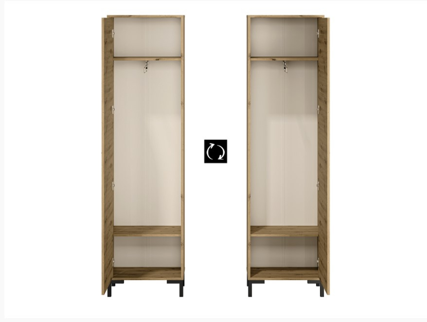 NEVIO je moderní a elegantní kolekce nábytku do předsíně. Kombinace výrazného dekoru dub artisan s černými úchytkami a nohami je dokonalým řešením pro moderní interiér. Díky rozmanitosti systému můžete snadno vybavit malou předsíň i velkou halu. Šatní skříň má dvě police a výsuvnou šatní tyč. Zboží je dodáváno v demontu.