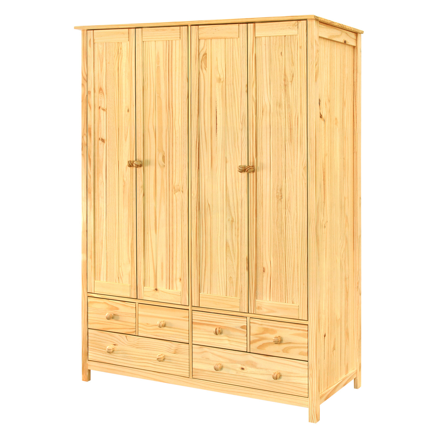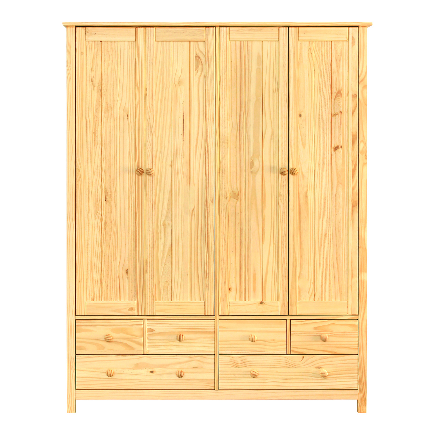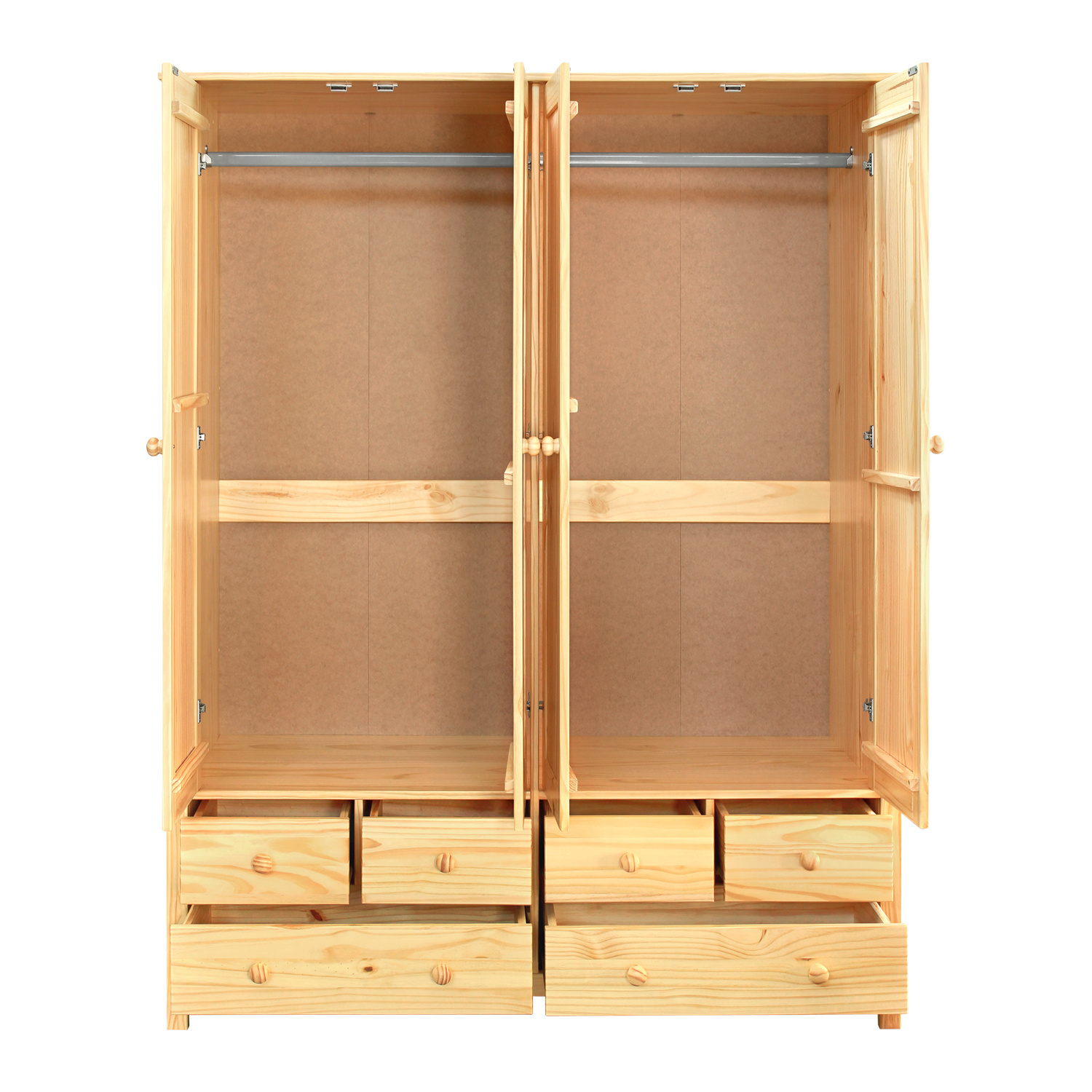Skříň je vyrobena z materiálu masiv borovice v lakovaném provedení. Prostor skříně je dělený na poloviny, v každé polovině najdeme šatní tyč. Pod tímto prostorem najdeme 4 menší a 2 větší zásuvky s kovovými pojezdy. Zboží dodáváme v demontu.