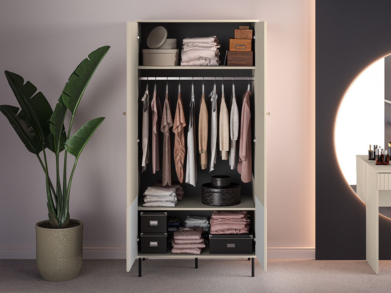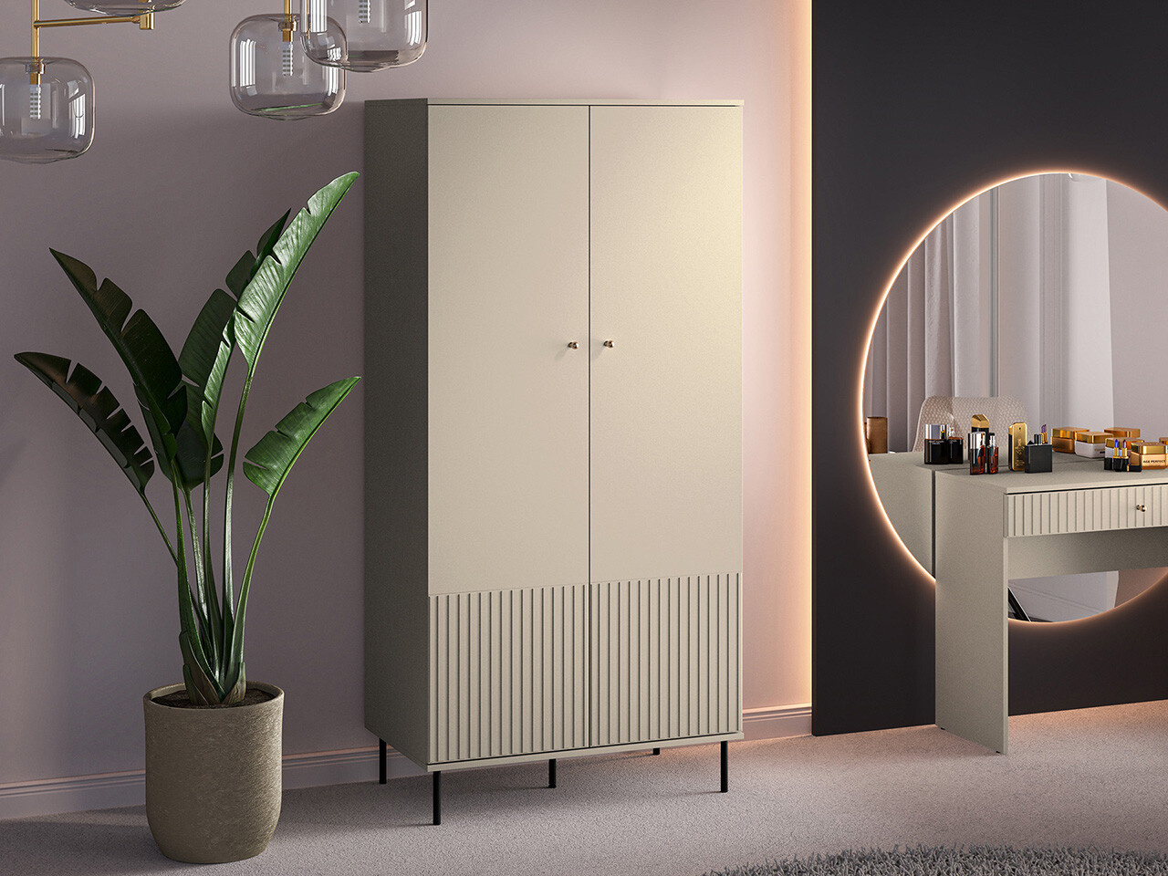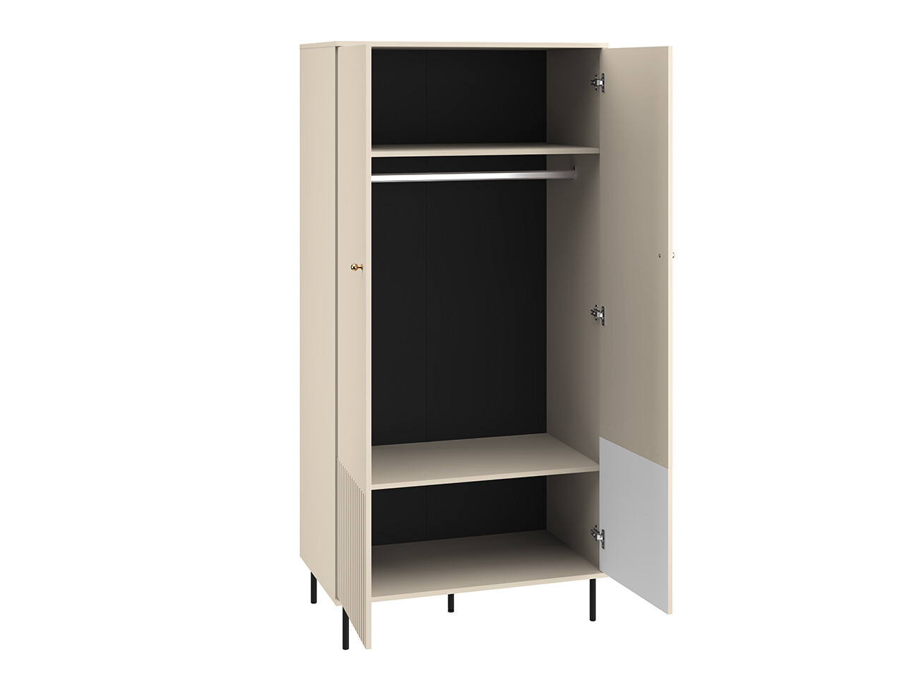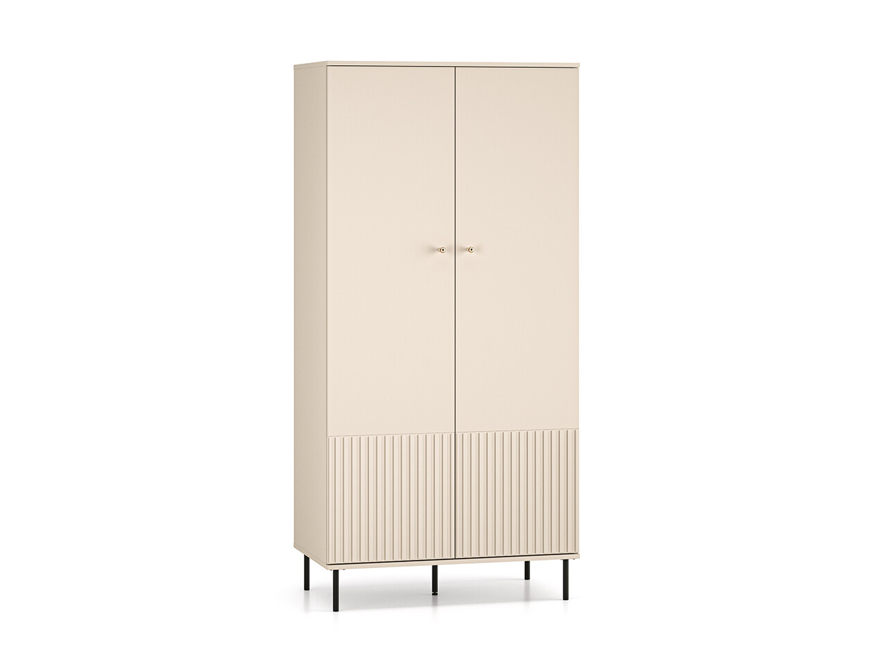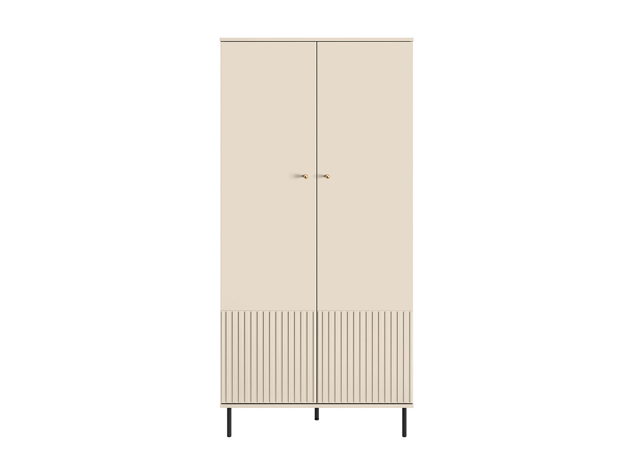 Šatní skříň SOPHIE je vyrobena z vysoce kvalitní laminované dřevotřískové desky s ABS hranou v kašmírové barvě.. Vyznačuje se stylovými černými kovovými nohami a drážkovanými předními čílky se zlatými úchytkami. Kuličkové vodítka a panty s tichým zavíráním zajišťují komfort používání. Zboží dodáváme v demontu.