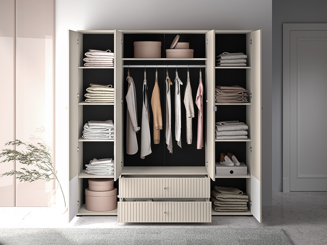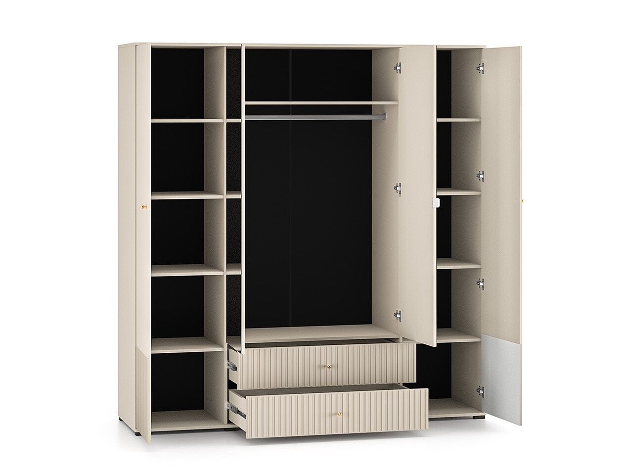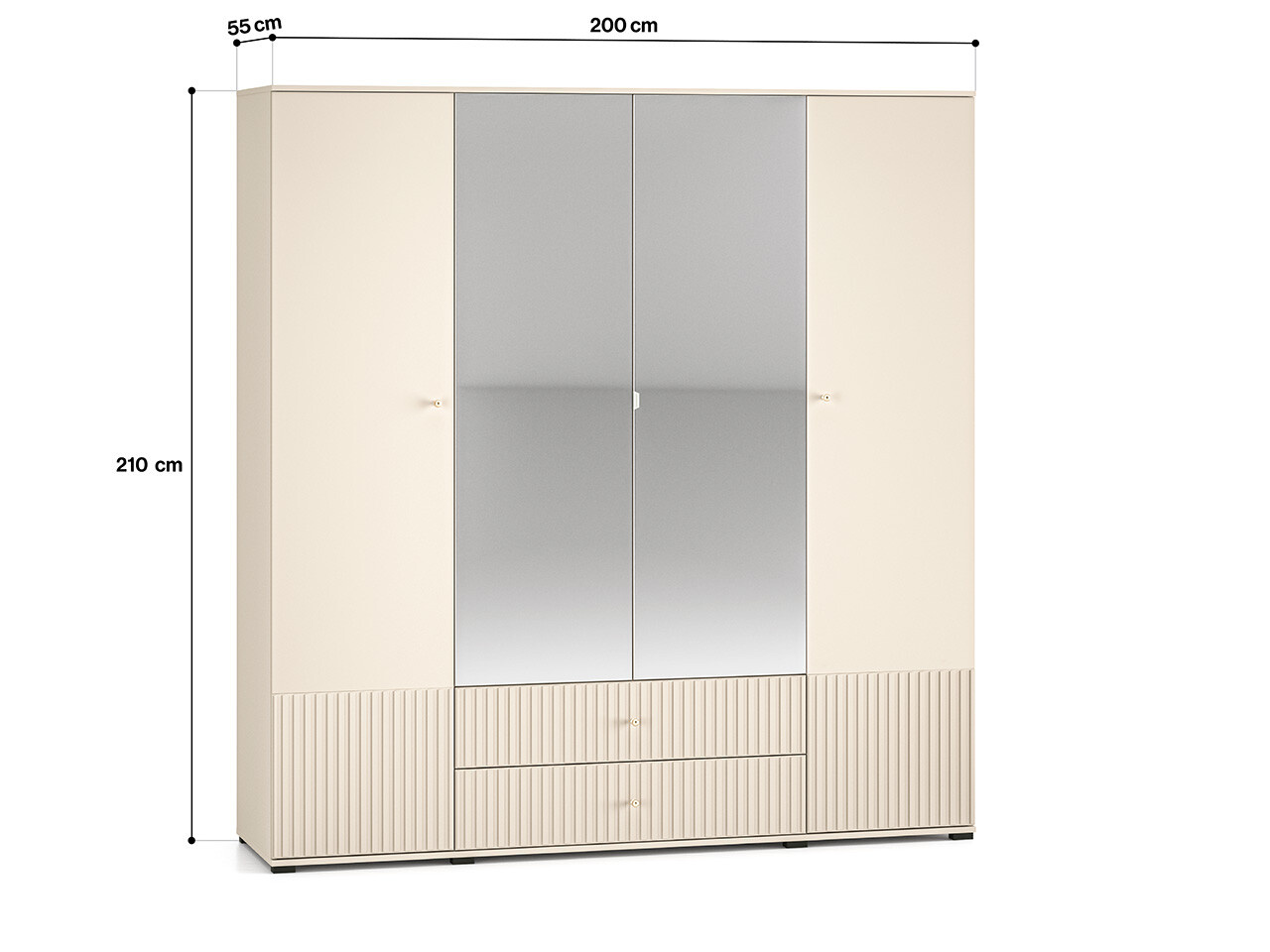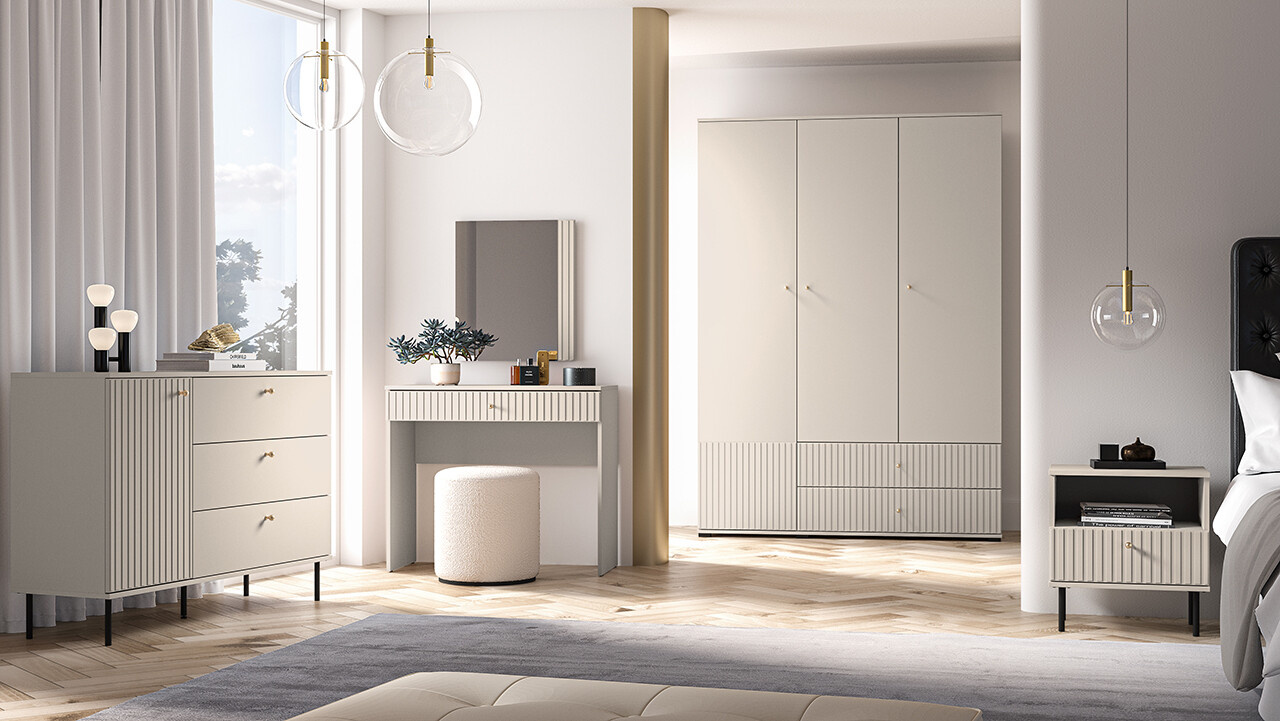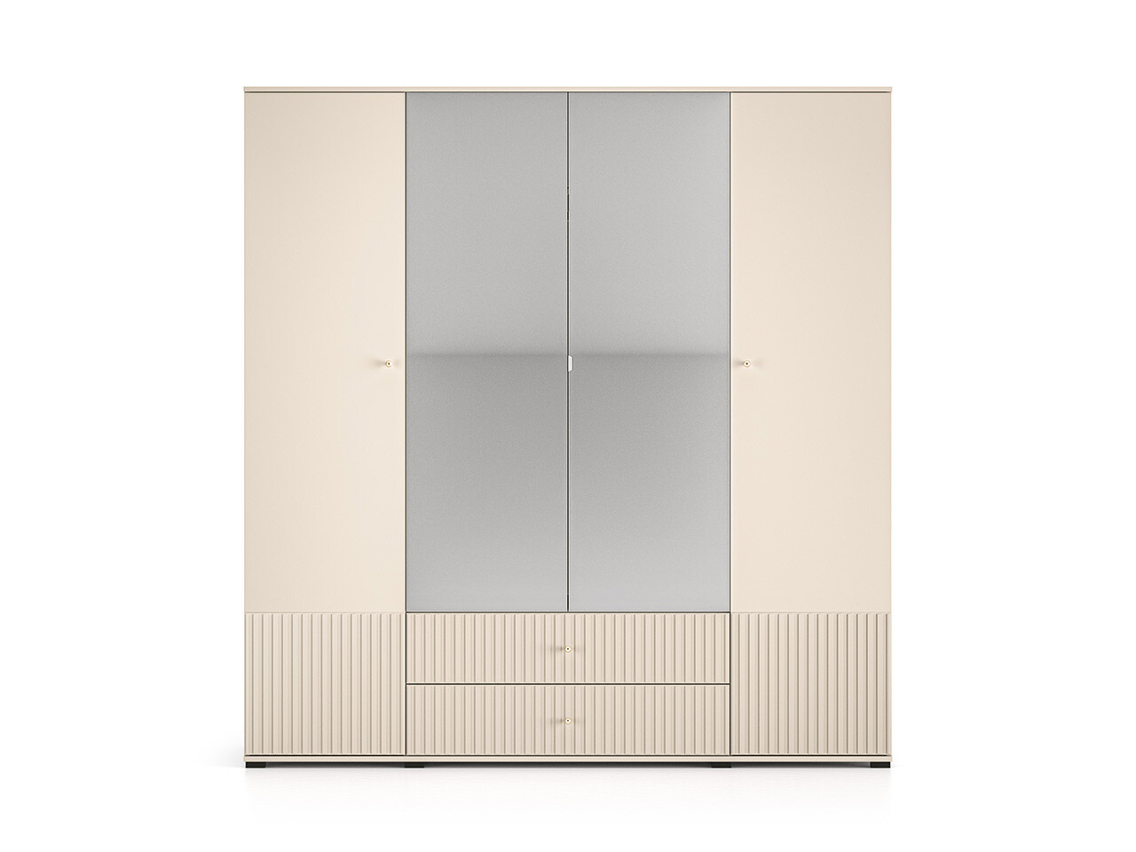 Šatní skříň SOPHIE je vyrobena z vysoce kvalitní laminované dřevotřískové desky s ABS hranou v kašmírové barvě. Vyznačuje se stylovými černými kovovými nohami a drážkovanými předními čílky se zlatými úchytkami. Kuličkové vodítka a panty s tichým zavíráním zajišťují komfort používání. Zboží dodáváme v demontu.