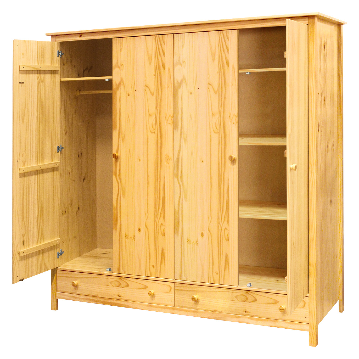 Skříň z materiálu masiv borovice v lakovaném provedení. Prostor skříně dělený na poloviny, v levé polovině šatní tyč a police, v pravé polovině 3 police. Ve spodní části 2 zásuvky s kovovými pojezdy. Zboží dodáváme v demontu.