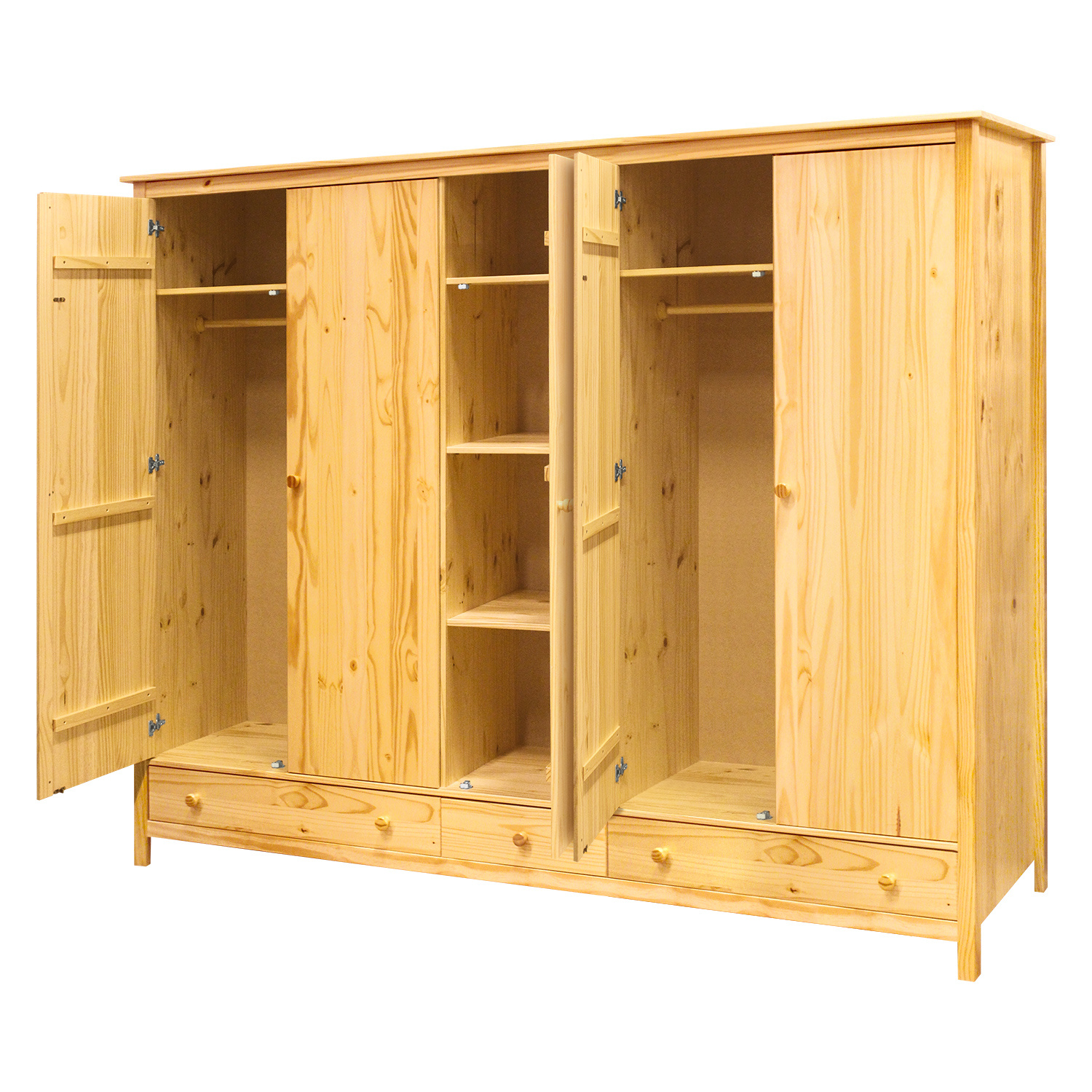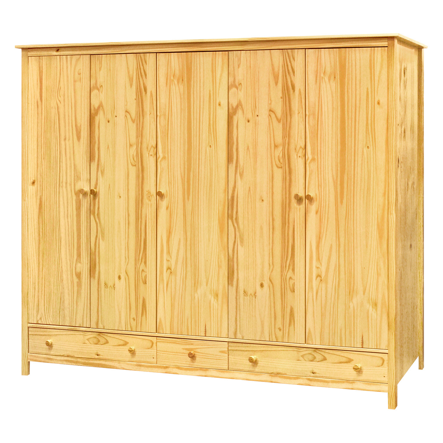 Skříň z materiálu masiv borovice v lakovaném provedení. Prostor dělený v poměru 2:1:2 ,v levé a pravé širší části šatní tyč a police na klobouky ve střední úzké části 3 police. Ve spodní části 3 zásuvky s kovovými pojezdy. Zboží dodáváme v demontu.
