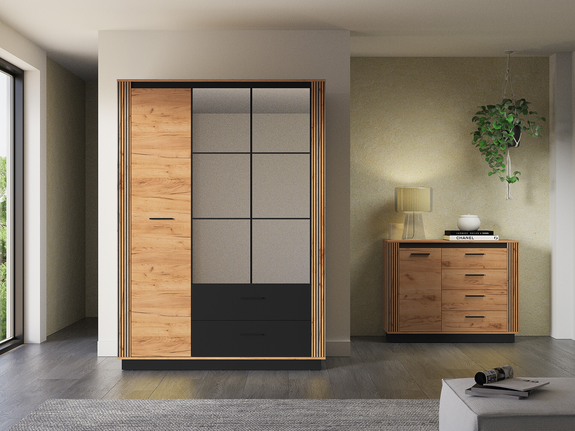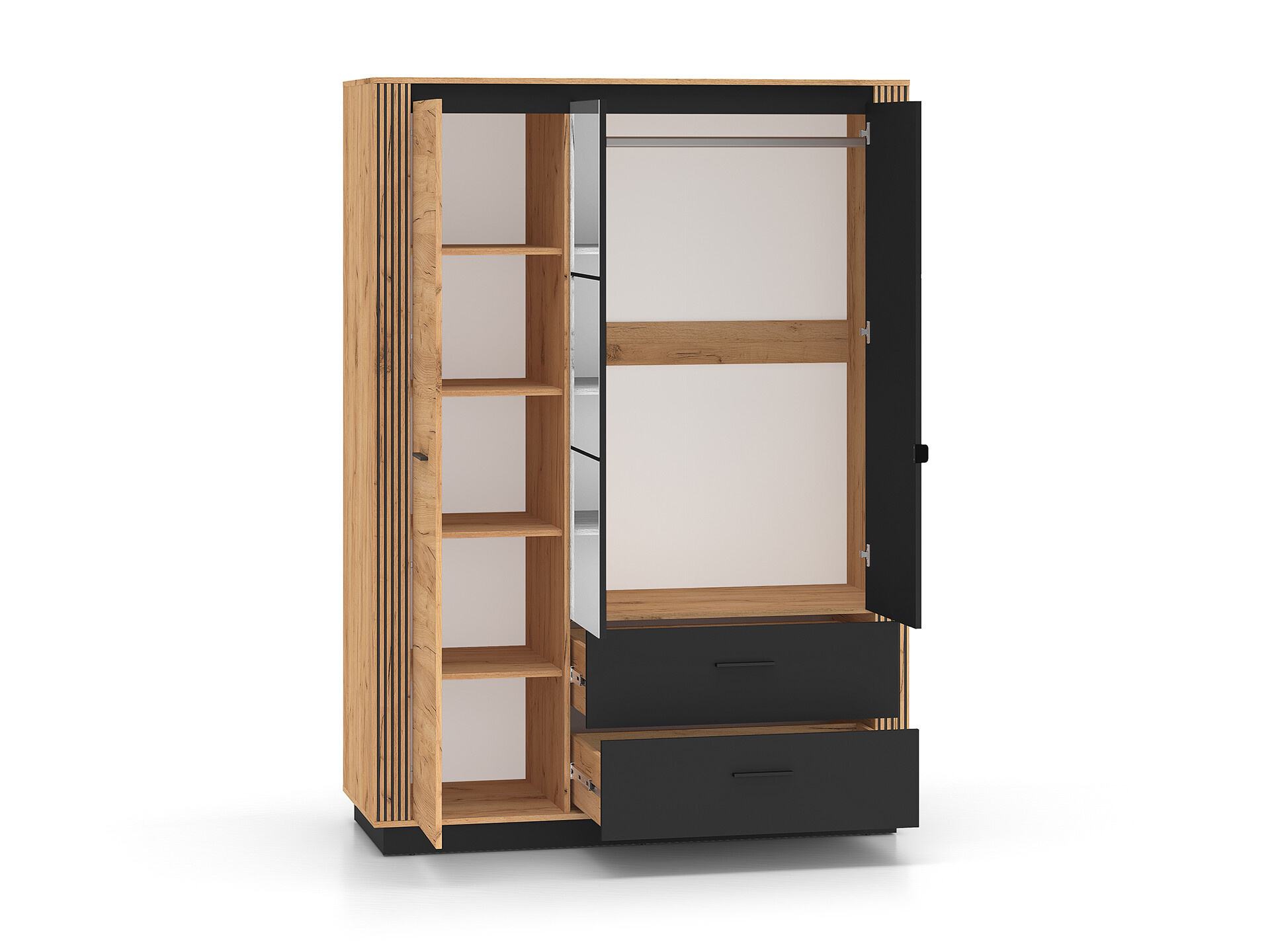 Šatní skříň Urso je vyrobena z vysoce kvalitní laminované dřevotřískové desky s ABS hranou v provedení dub craft zlatý/ černá. Zboží dodáváme v demontu.