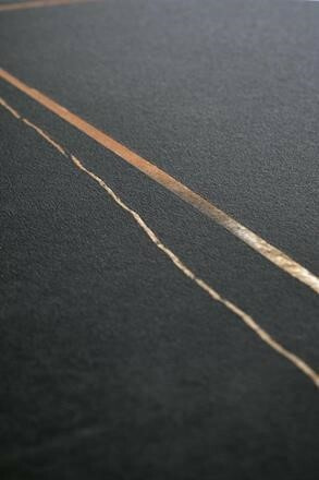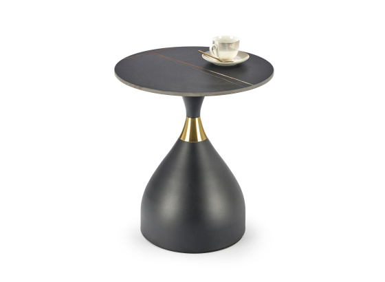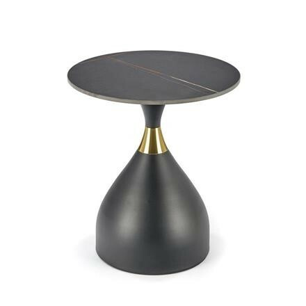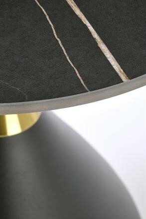 Konferenční stolek Scalita ma desku vyrobenou z keramiky v dezénu černý mramor. Noha stolu z lakované černé oceli je ozdobena zlatým páskem. Zboží dodáváme v demontu.