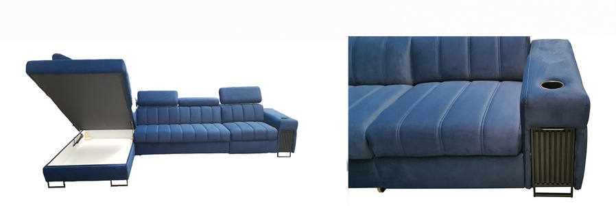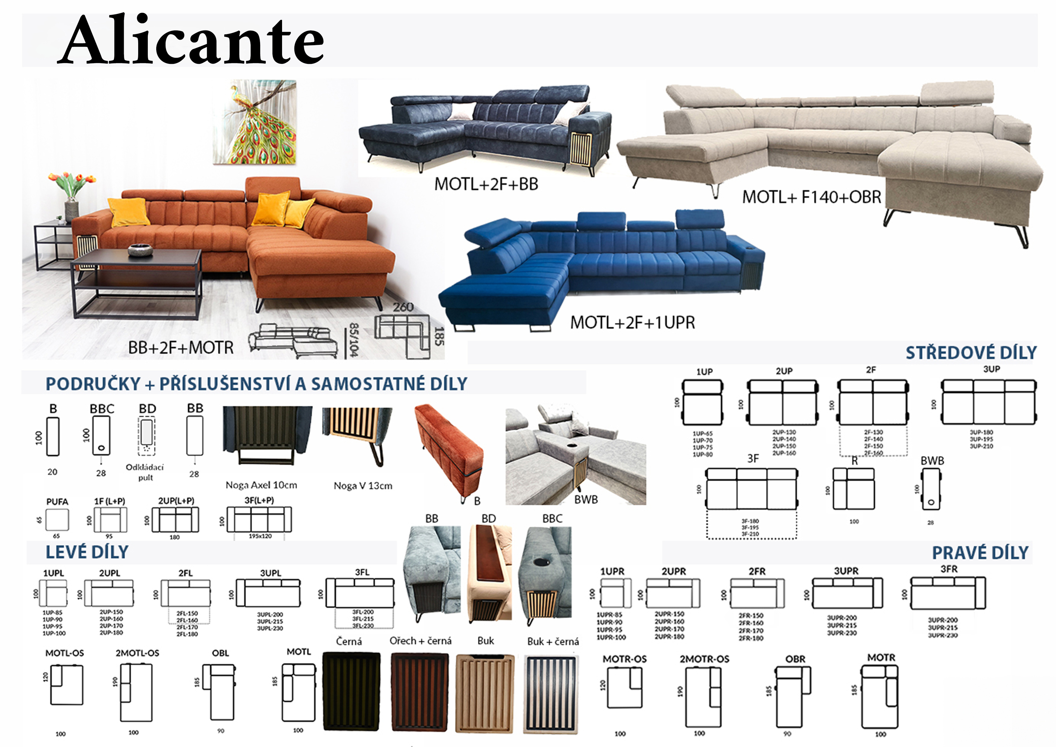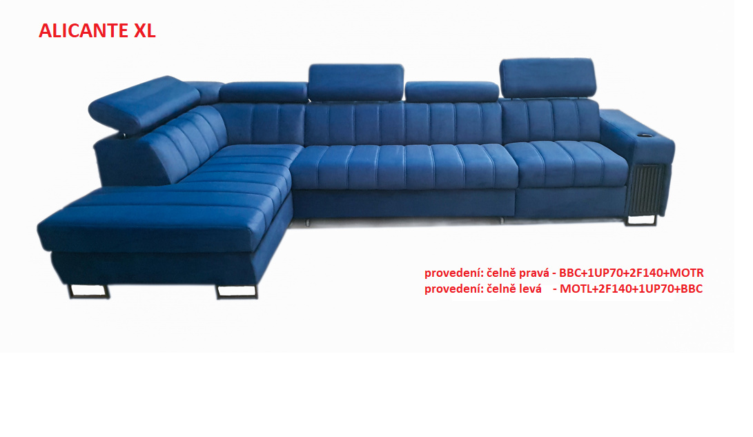 Moderní modulová rozkládací sedací souprava ALICANTE XL s úložným prostorem a možností nastavení polohovací opěrky hlavy. Sedáky jsou plněny vlnitými pružinami a kvalitní studenou HR pěnou, která Vám zajistí pohodlné sezení. Sedací souprava má snadnou funkci rozkladu, která slouží k občasnému přespání. Sedací souprava je určena do prostoru. V područce je k dispozici úložný prostor a držák na nápoje v černé barvě. Rohovou sedací soupravu si můžete objednat v provedení levý nebo pravý roh, takže se přizpůsobí vašemu interiéru. Nožky jsou kovové v černé barvě o výšce 10 cm. Tuto sedací soupravu doporučujeme v potahové látce VOGUE.