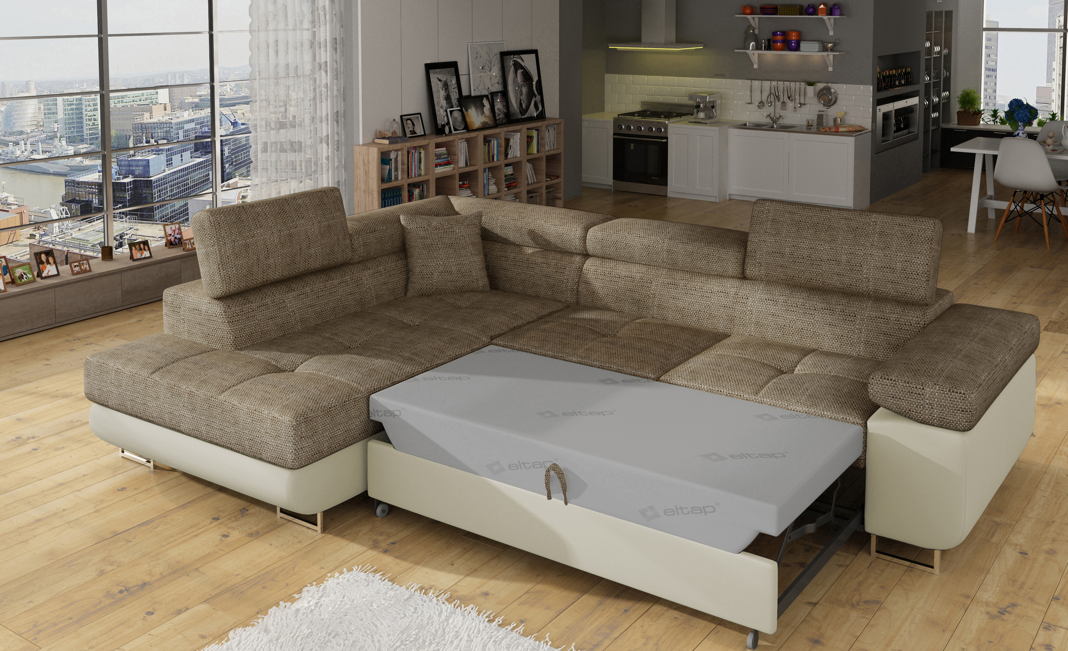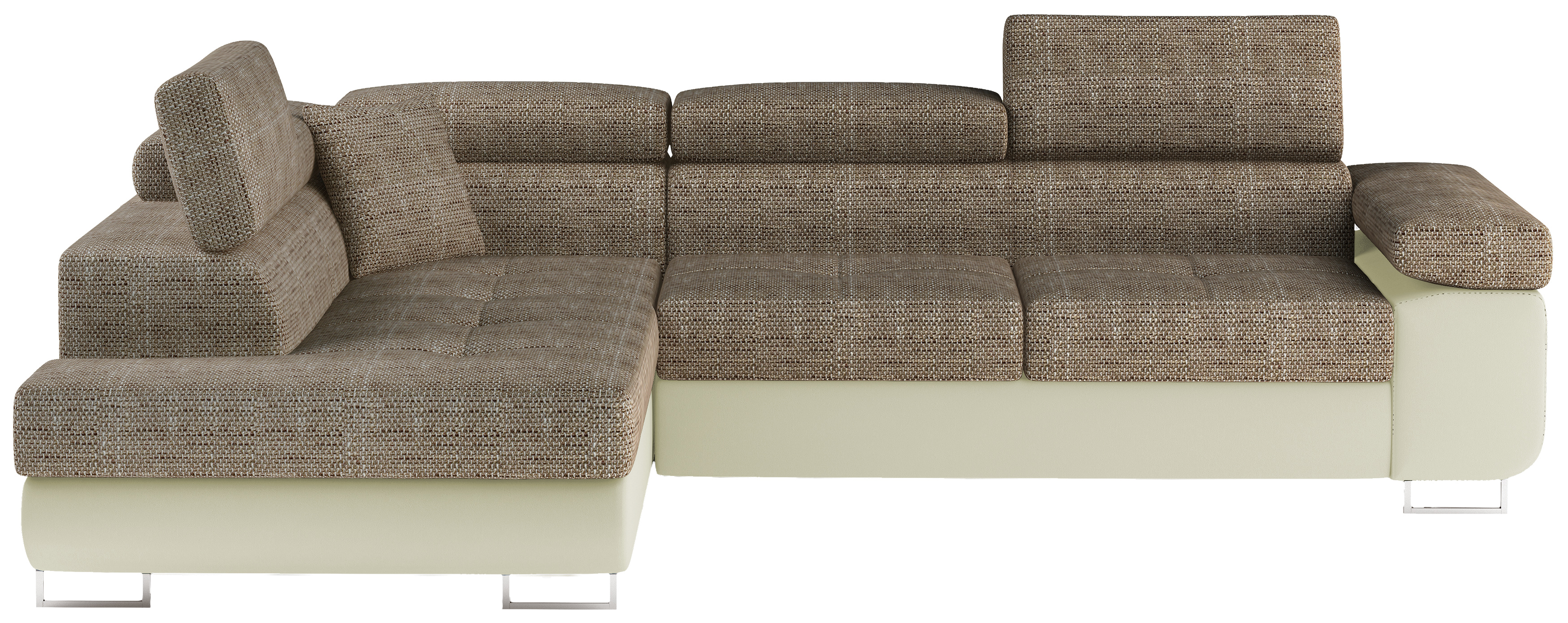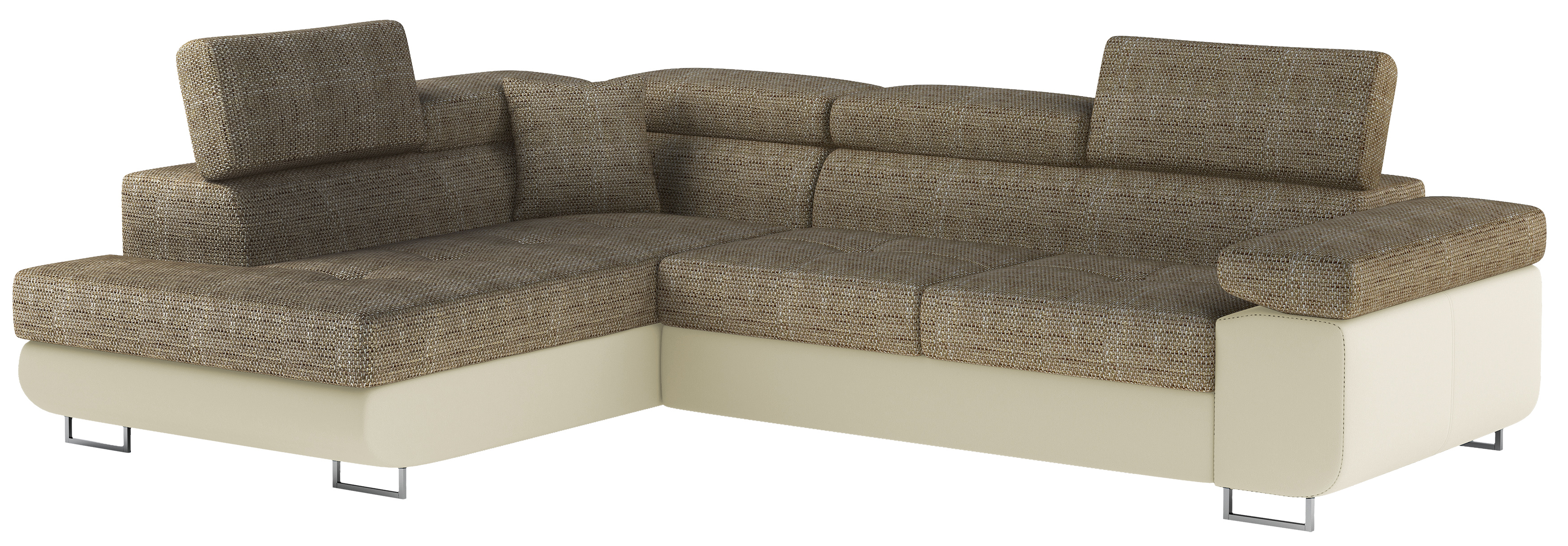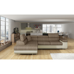 Rozkládací souprava Anton v barevném provedení látka Berlin 03/ eko kůže Soft 33. Výplň sedáků je vyrobena z vlnité pružiny a kvalitní PUR pěny T30. Souprava disponuje nastavitelnými opěrkami hlavy a úložným prostorem. Vytažení spodní části vznikne spací plocha 123x210 cm. Šířka područky 31 cm. Kovové nožky o šířce 20 cm a výšce 9 cm. Provedení levé.
