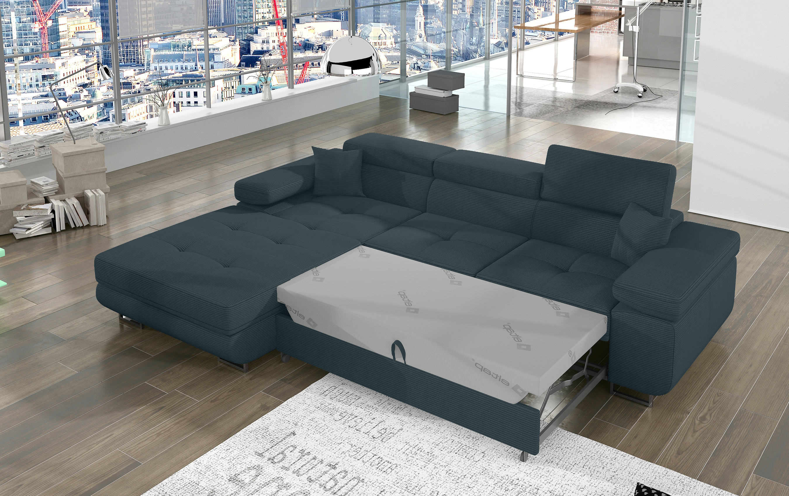 Sedací souprava Armando v barevném provedení Jarell 38 má sedák z vlnité pružiny a kvalitní PUR pěny T30. Disponuje vysokými chromovanými nožkami o výšce 9 cm a šířce 20 cm. Rozkladem spací plochy 123x210 cm. Provedení levé.
