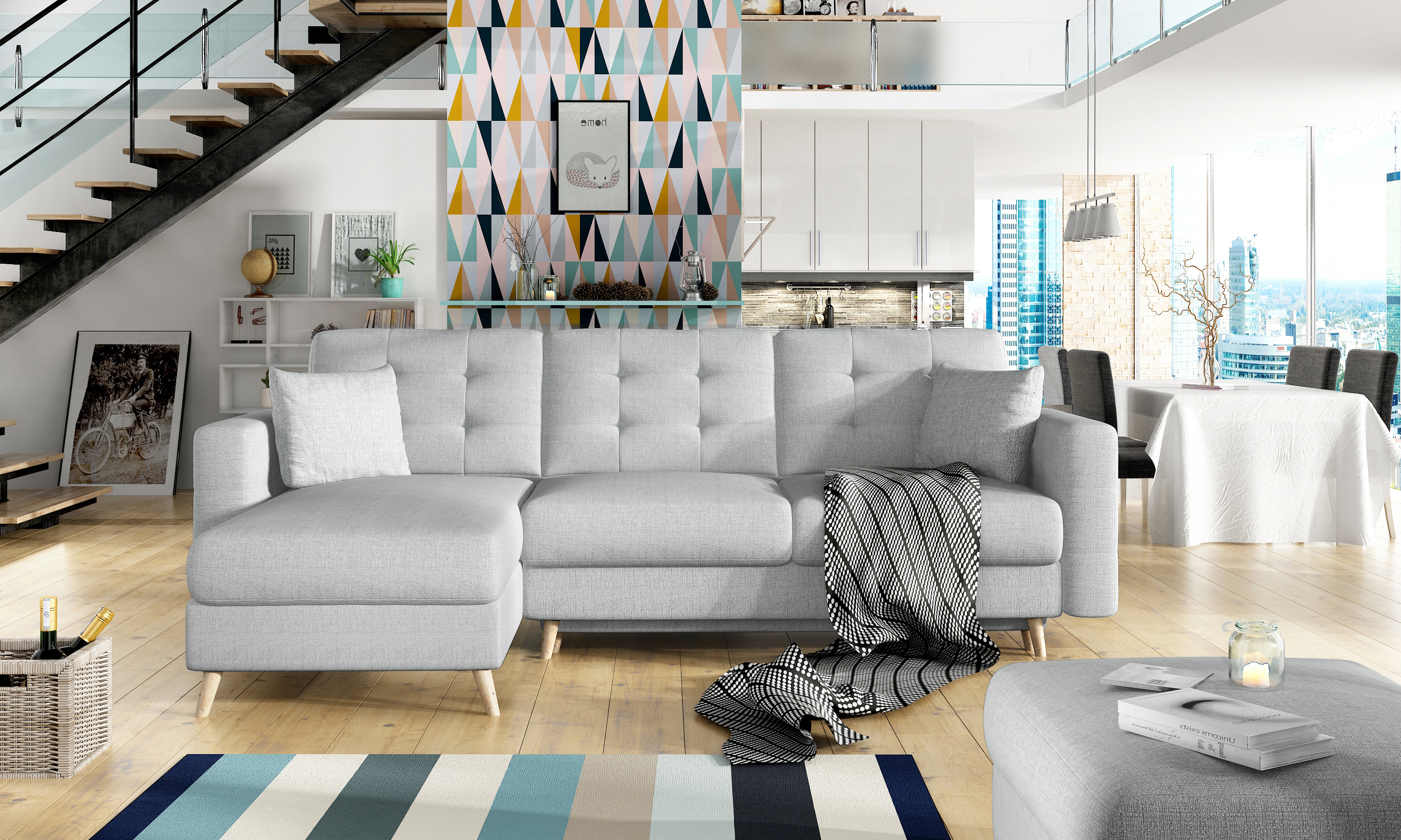 Sedací souprava v provedení Solid 09 má sedáky z odolné vlnové pružiny a elastické pěny T30. Disponuje úložným prostorem. Rozkladem vznikne spací plocha 210x120 cm. Tato sedací souprava je variabilní. Vysoké, soustružené dřevěné nohy.