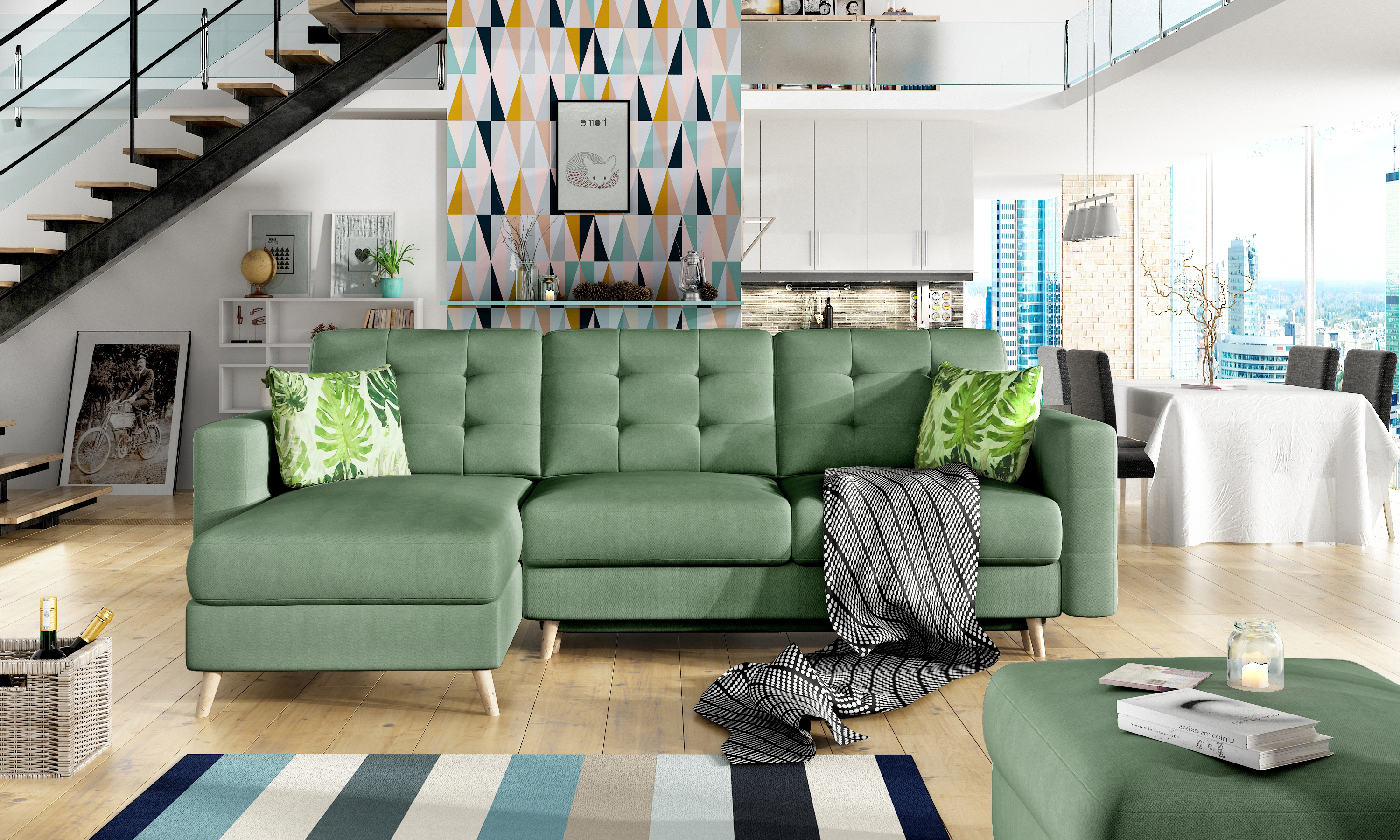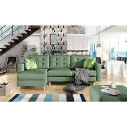 Sedací souprava v provedení Soro 34, polštářky Jungle 32 má sedáky z odolné vlnové pružiny a elastické pěny T30. Disponuje úložným prostorem. Rozkladem vznikne spací plocha 210x120 cm. Tato sedací souprava je variabilní. Vysoké, soustružené dřevěné nohy.