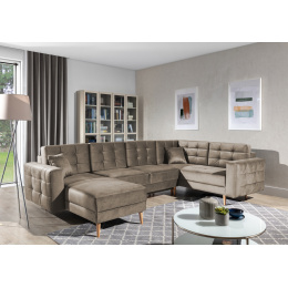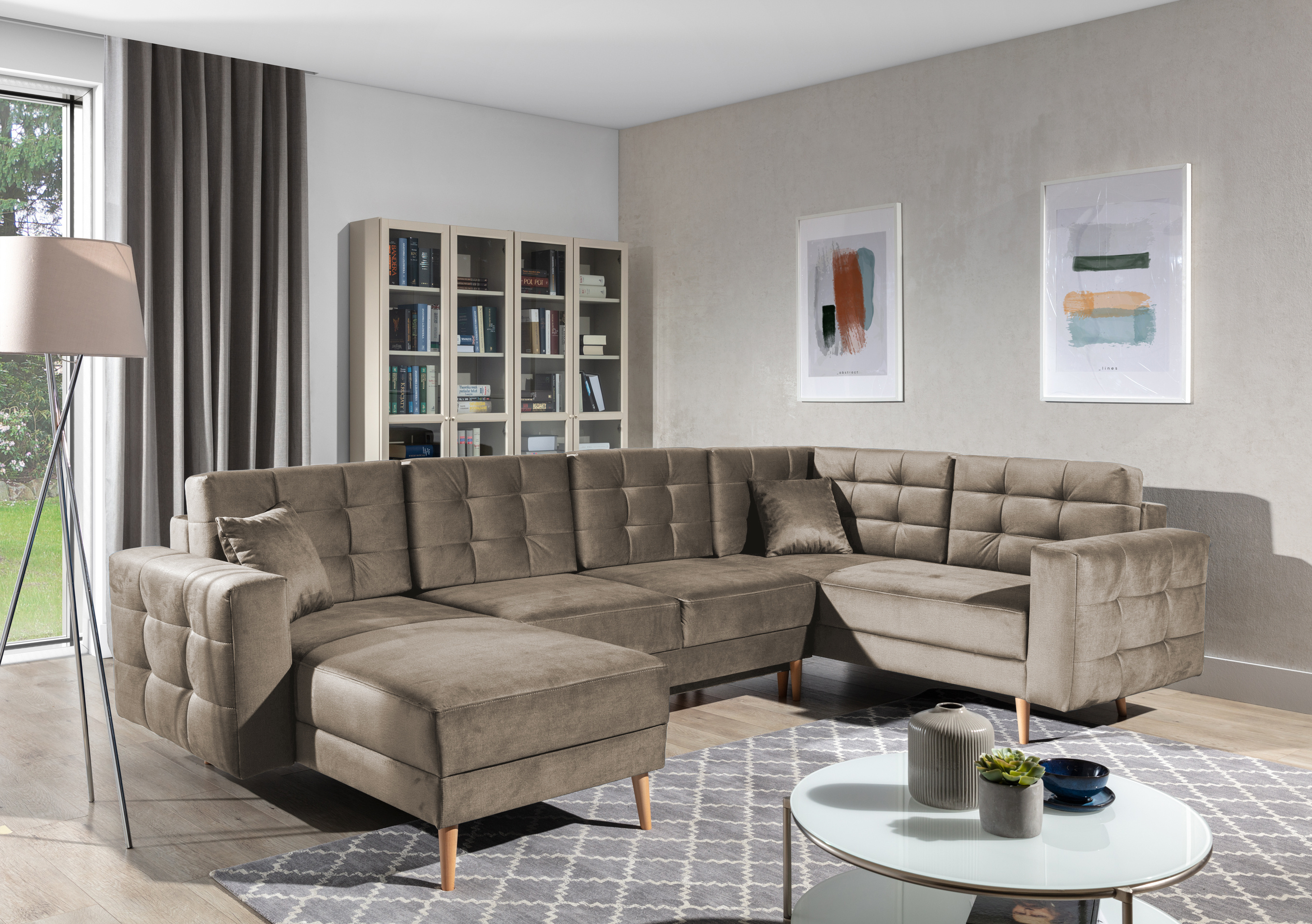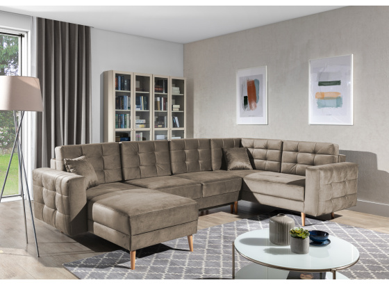 Sedací souprava v provedení Monolith 9 má sedáky z odolné vlnové pružiny a elastické pěny T30. Disponuje úložným prostorem. Rozkladem vznikne spací plocha 282x120 cm. Tato sedací souprava je variabilní. Vysoké, soustružené dřevěné nohy.