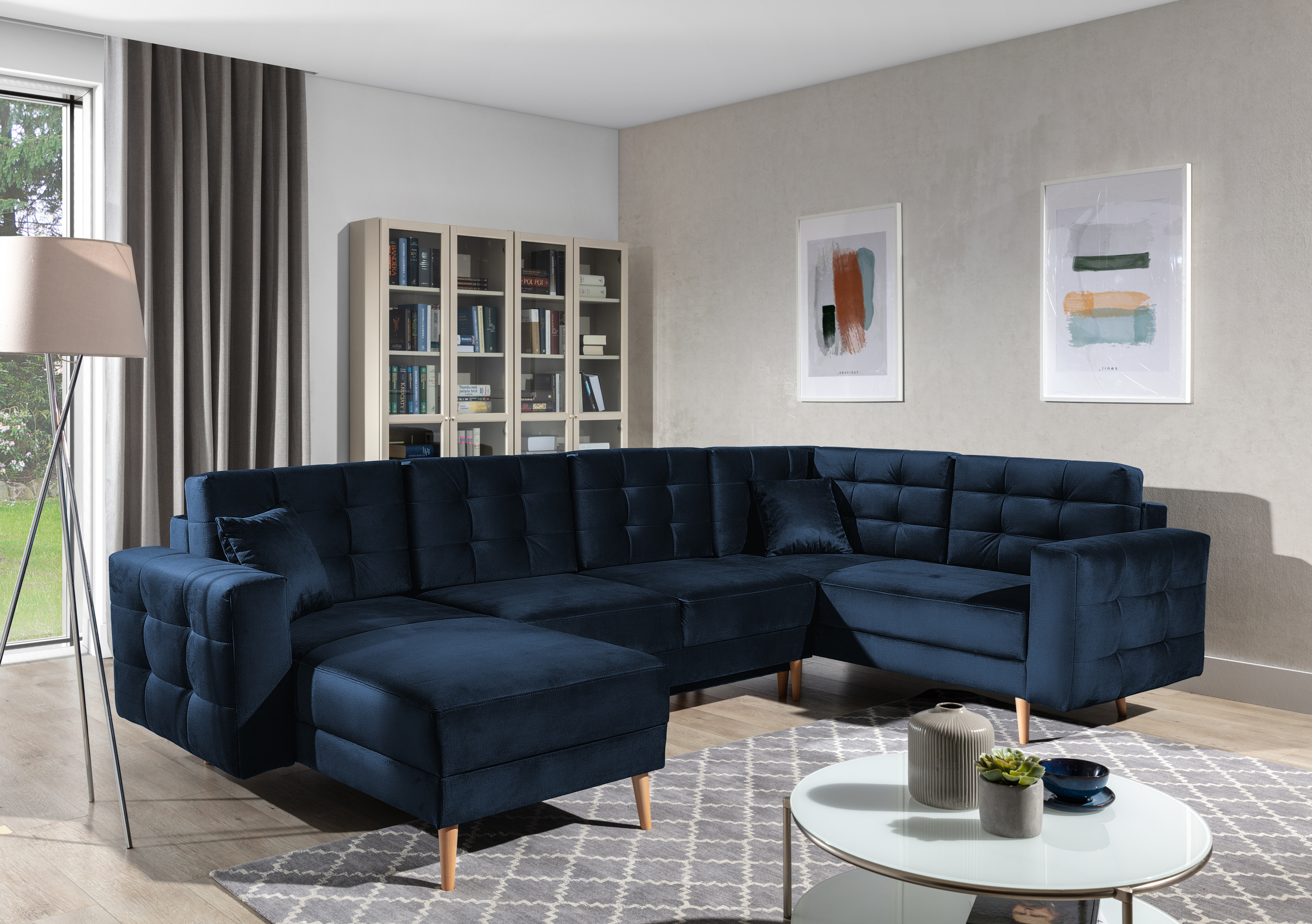 Sedací souprava v provedení Monolith 79 má sedáky z odolné vlnové pružiny a elastické pěny T30. Disponuje úložným prostorem. Rozkladem vznikne spací plocha 282x120 cm. Tato sedací souprava je variabilní. Vysoké, soustružené dřevěné nohy.