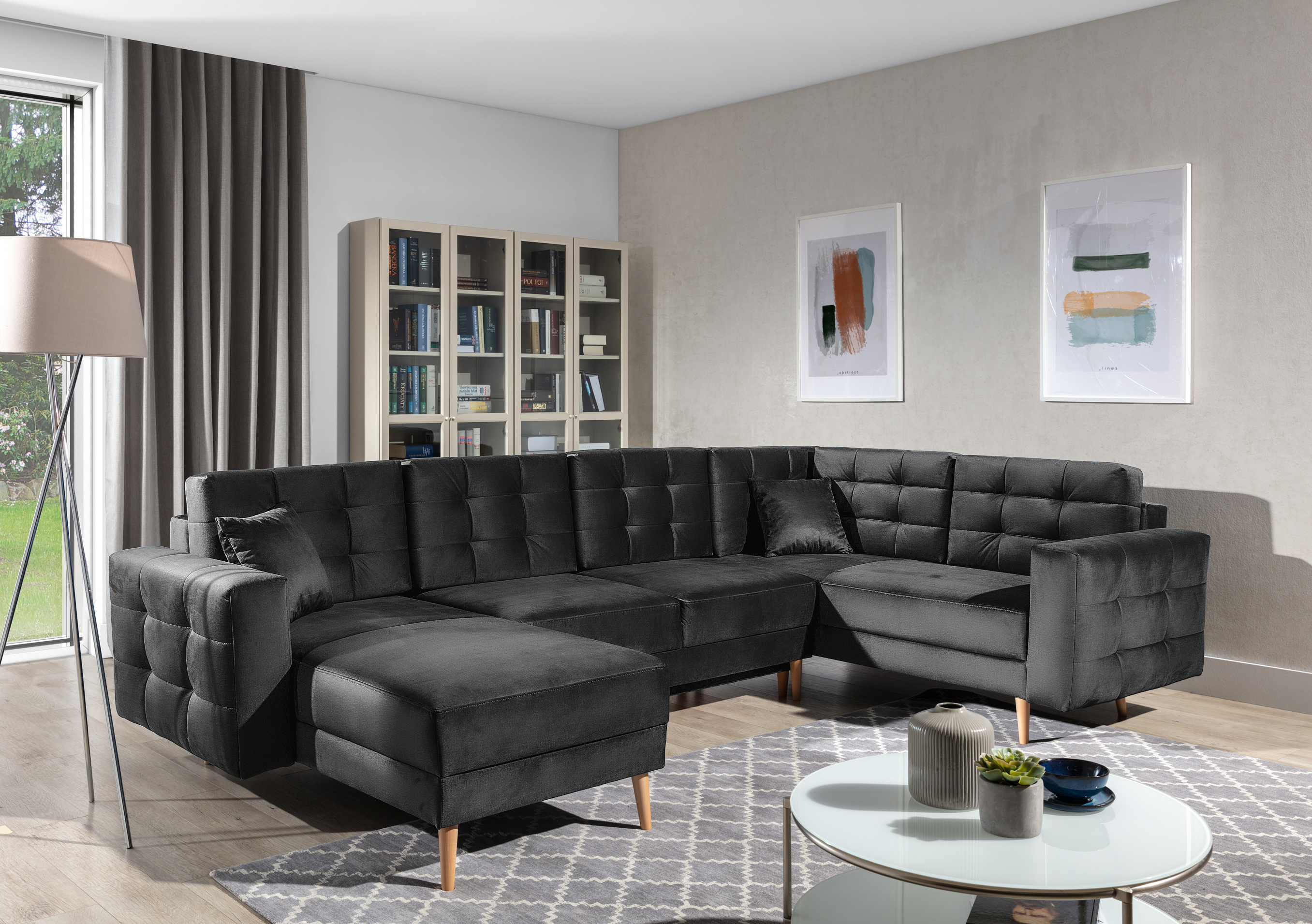 Sedací souprava v provedení Monolith 97 má sedáky z odolné vlnové pružiny a elastické pěny T30. Disponuje úložným prostorem. Rozkladem vznikne spací plocha 282x120 cm. Tato sedací souprava je variabilní. Vysoké, soustružené dřevěné nohy.