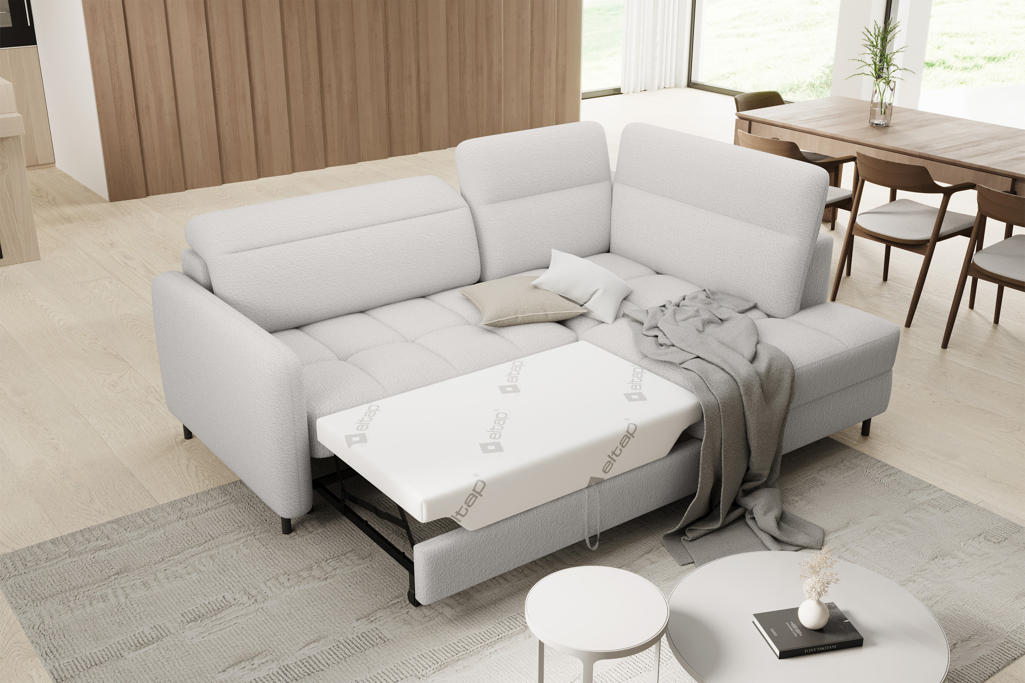 Rohová sedací souprava Barea v provedení Royal 01 má sedák vyrobený z HR pěny, vlnové pružina typu B, T2540 pěnové úpravy. Opěrka je vyrobena z T2540 pěny, T2130 pěna. Rozkladem vznikne spací plocha 128x160 cm cm. Nohy o výšce 10 cm jsou z černé oceli.