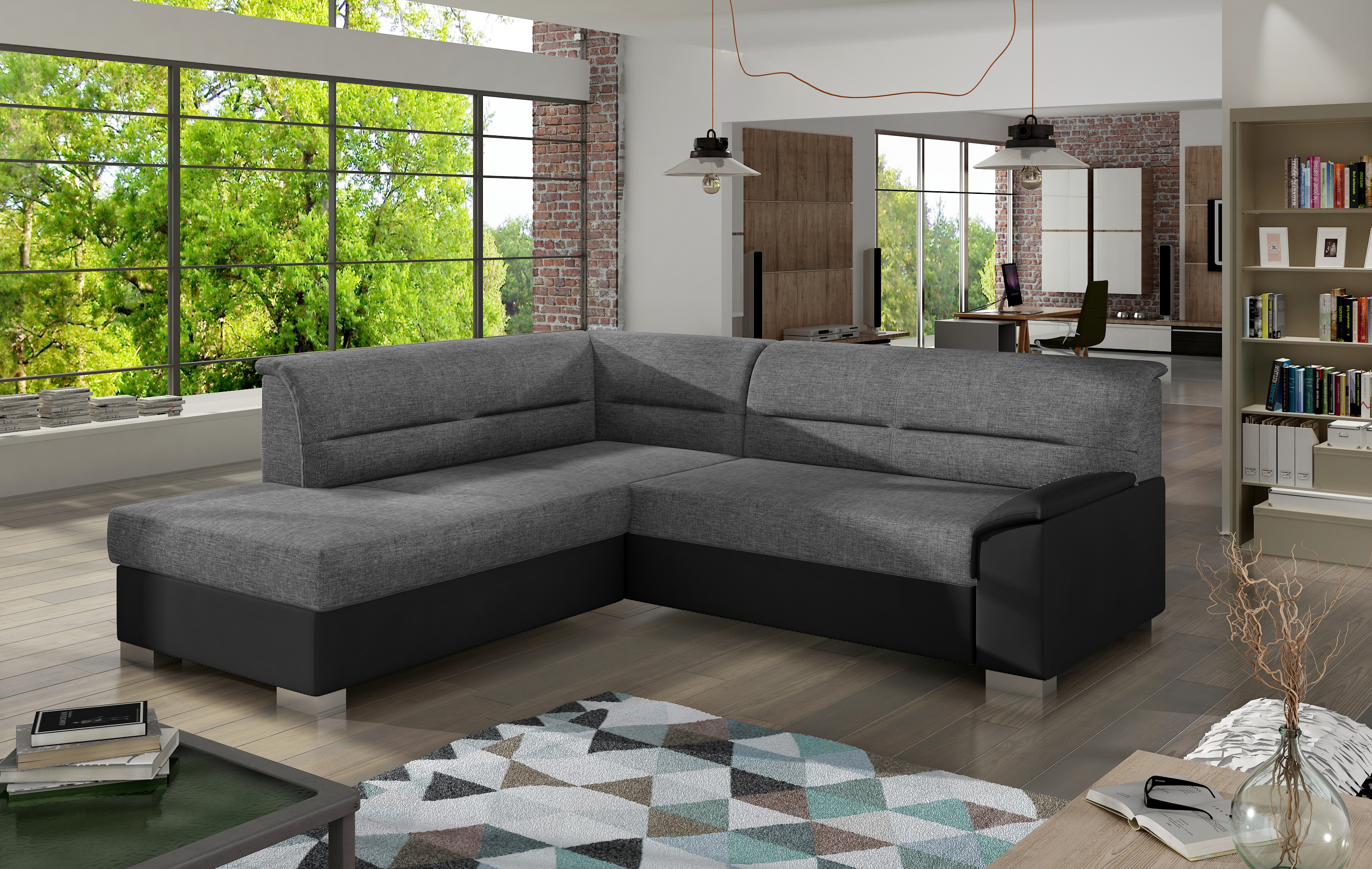 Sedací souprava Bergen v provedení Sawana 21/ eko kůže Soft 11 má rám vyroben z borovicového dřeva. Sedák tvoří vlnité pružiny faliste a HR pěna T30. Opěradla jsou vyplněny pěnou T2542. Rozkladem vznikne spací plocha 195 x 135 cm. Disponuje úložným prostorem. Nožky jsou plastové ve stříbrném provedení o výšce 7 cm. Nosnost sedací soupravy 315 kg. Provedené rohu levé.