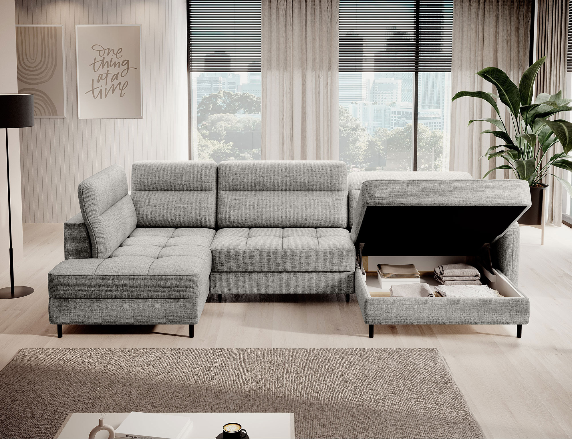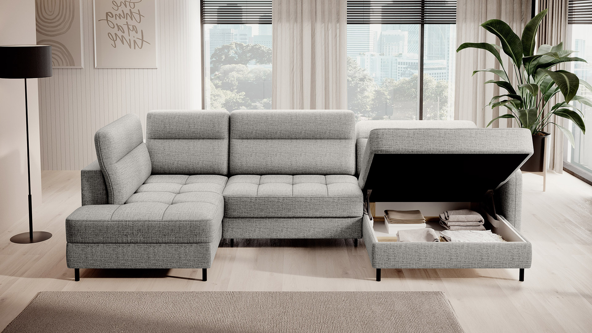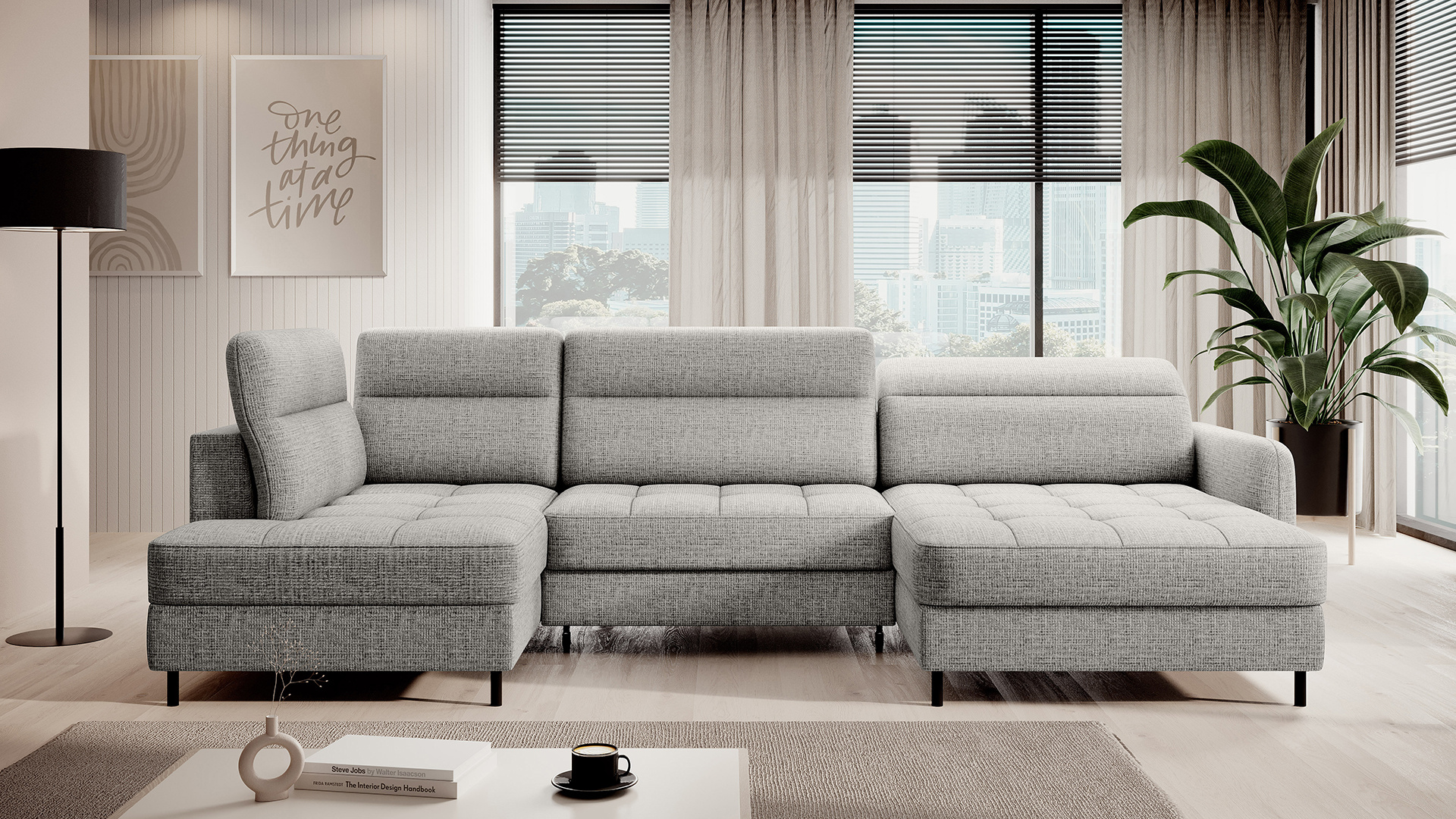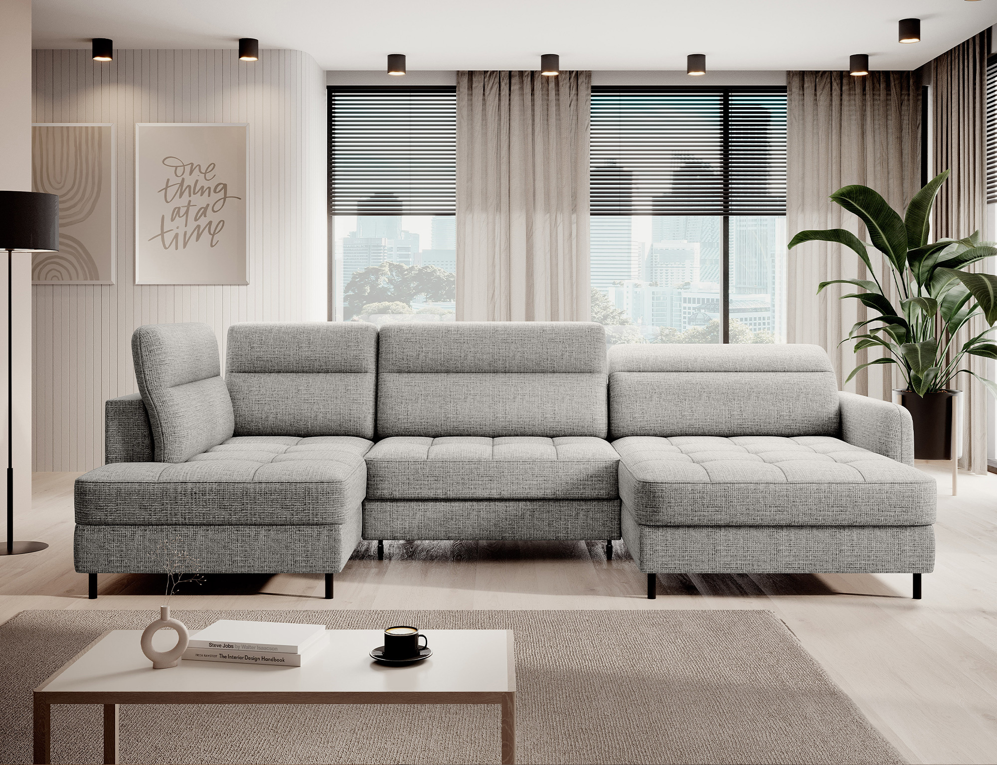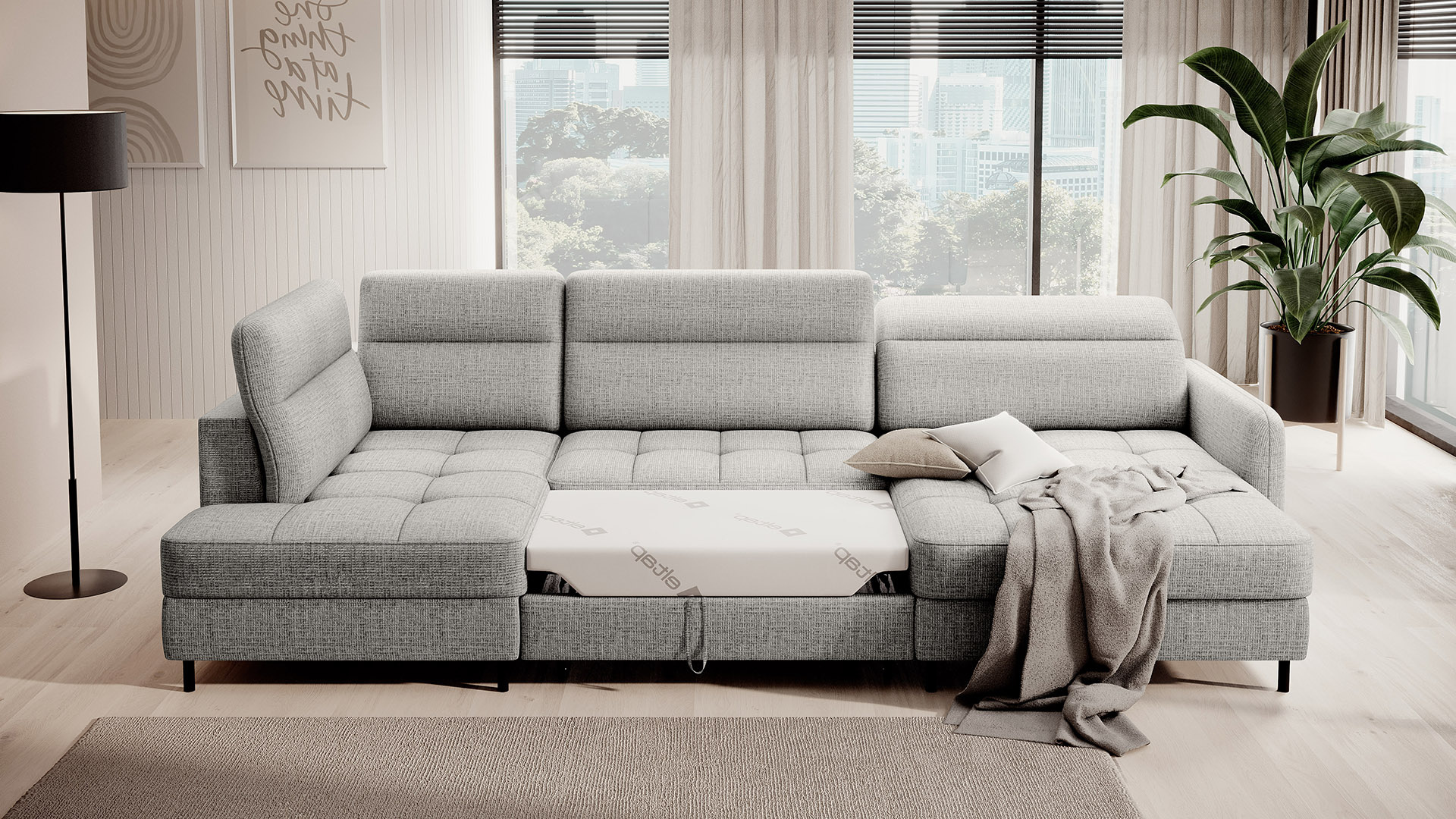 Sedací souprava Berrto v provedení Aubron 04 má sedák vybaven vlnitými pružinami typu B, které v kombinaci s vysoce elastickou pěnou HR + T2130. Opěradla jsou vyplněny čalouněnými popruhy a pěnou T2130. Rozkladem vznikne spací plocha 300x130 cm. Disponuje úložným prostorem. Černé ocelové nohy o výšce 10 cm. Nosnost soupravy je 390 kg. Provedení rohu pravé.