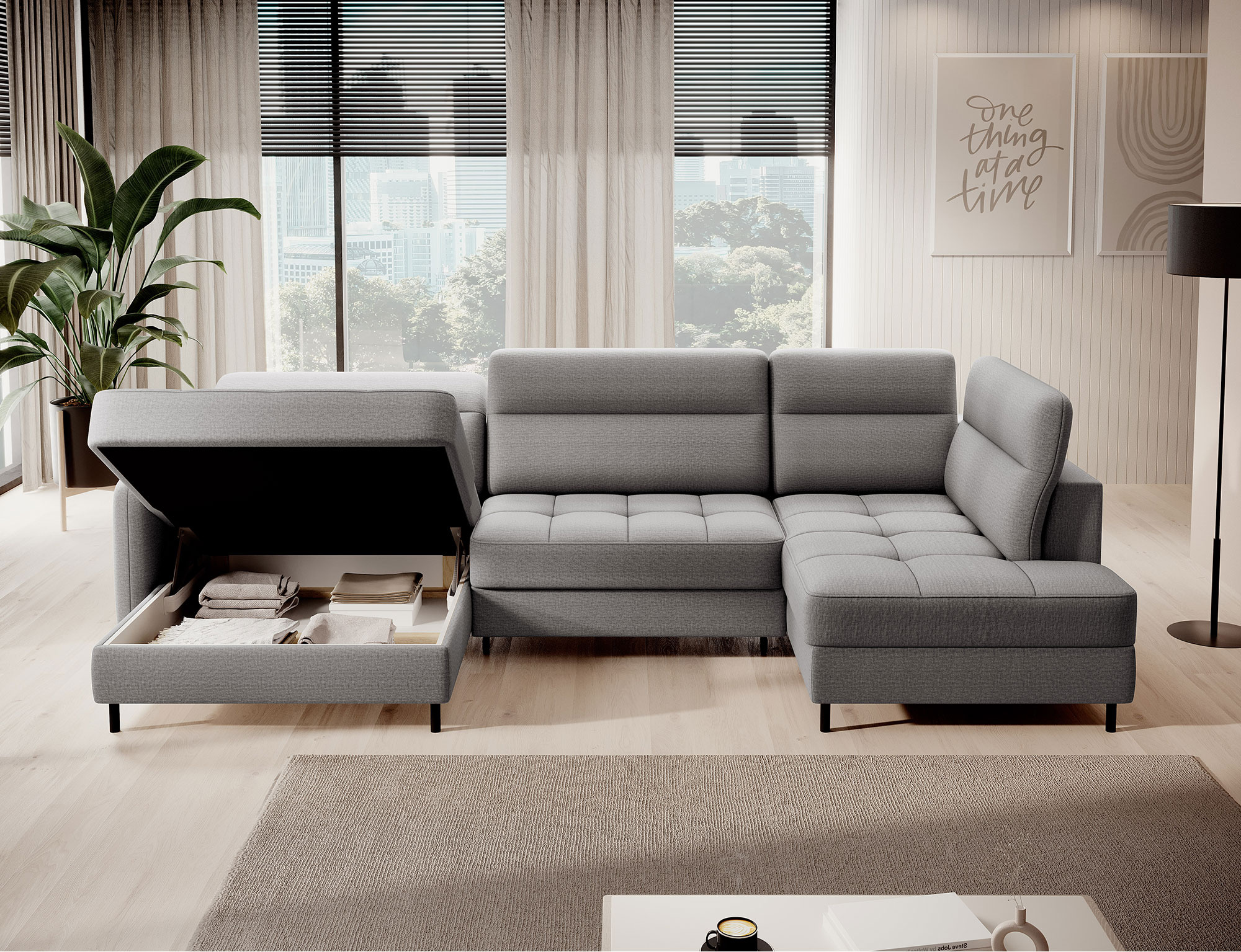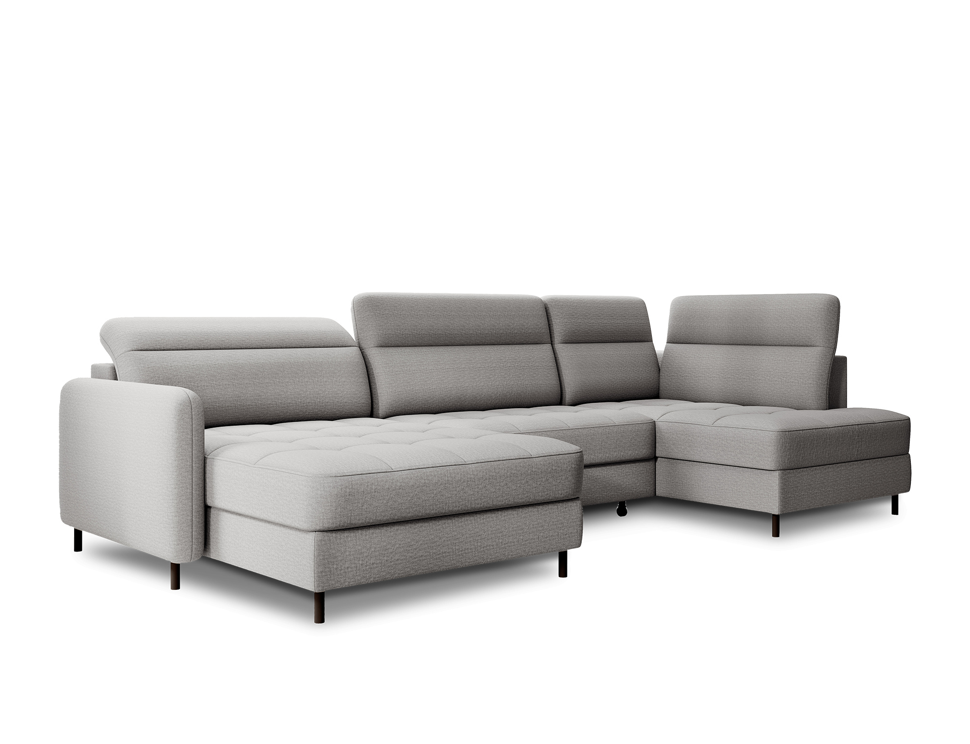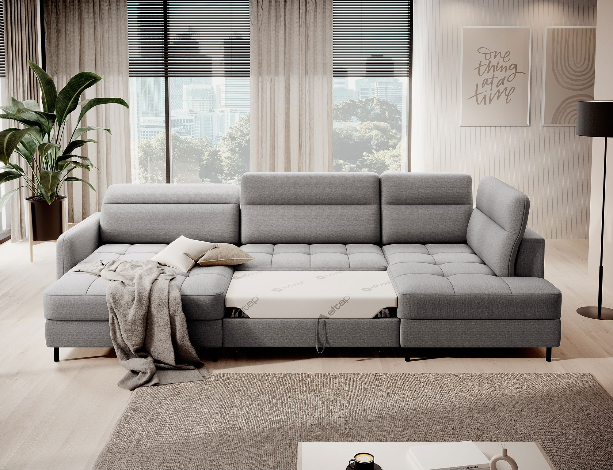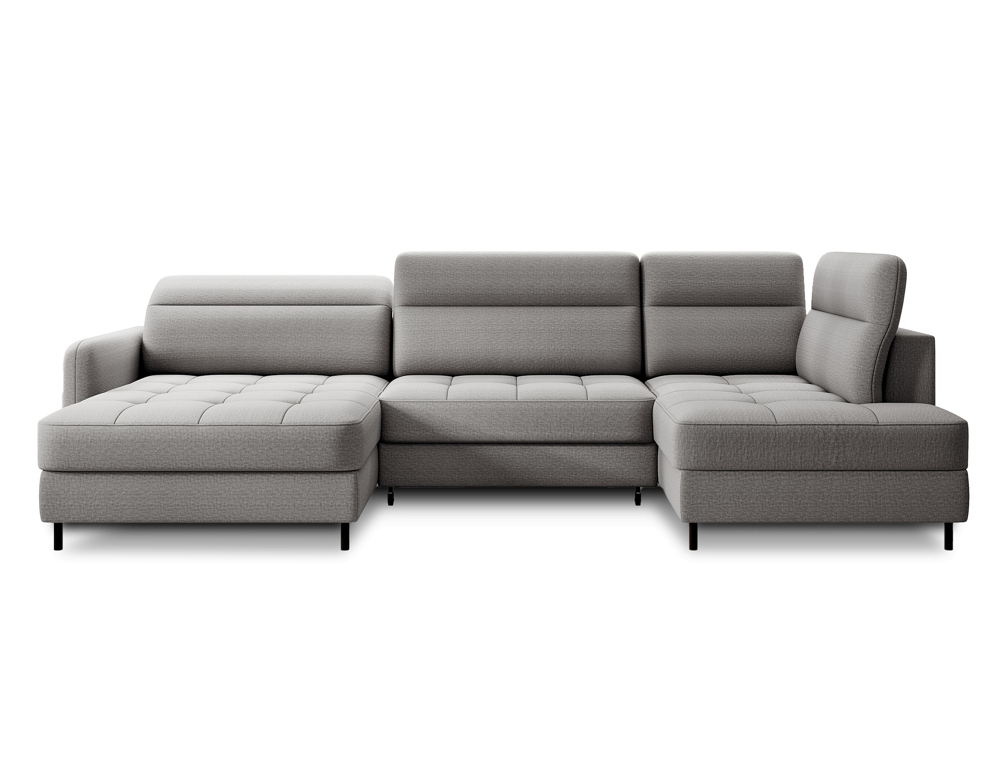 Sedací souprava Berrto v provedení Manhattan 03 má sedák vybaven vlnitými pružinami typu B, které v kombinaci s vysoce elastickou pěnou HR + T2130. Opěradla jsou vyplněny čalouněnými popruhy a pěnou T2130. Rozkladem vznikne spací plocha 300x130 cm. Disponuje úložným prostorem. Černé ocelové nohy o výšce 10 cm. Nosnost soupravy je 390 kg. Provedení rohu levé.