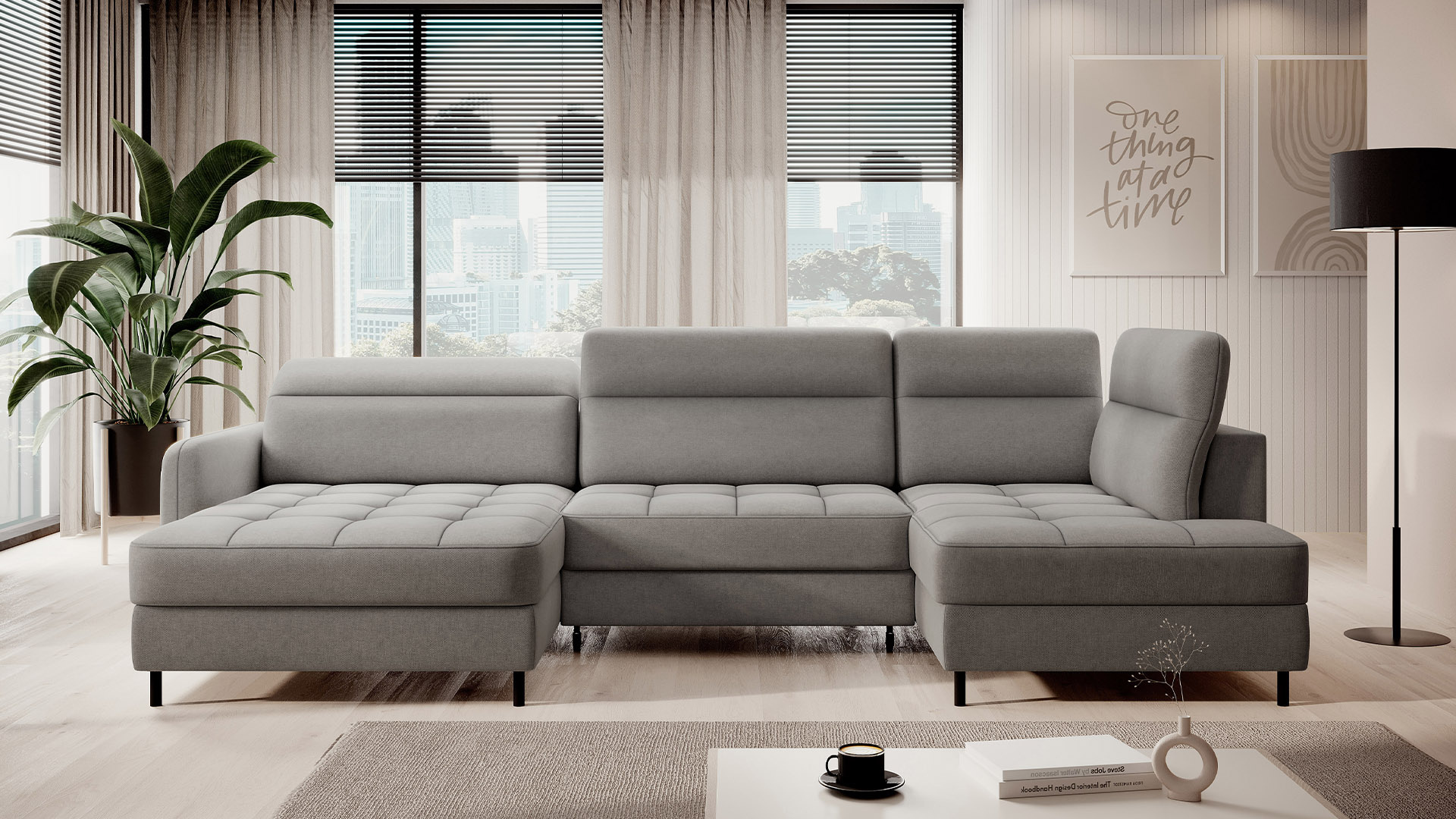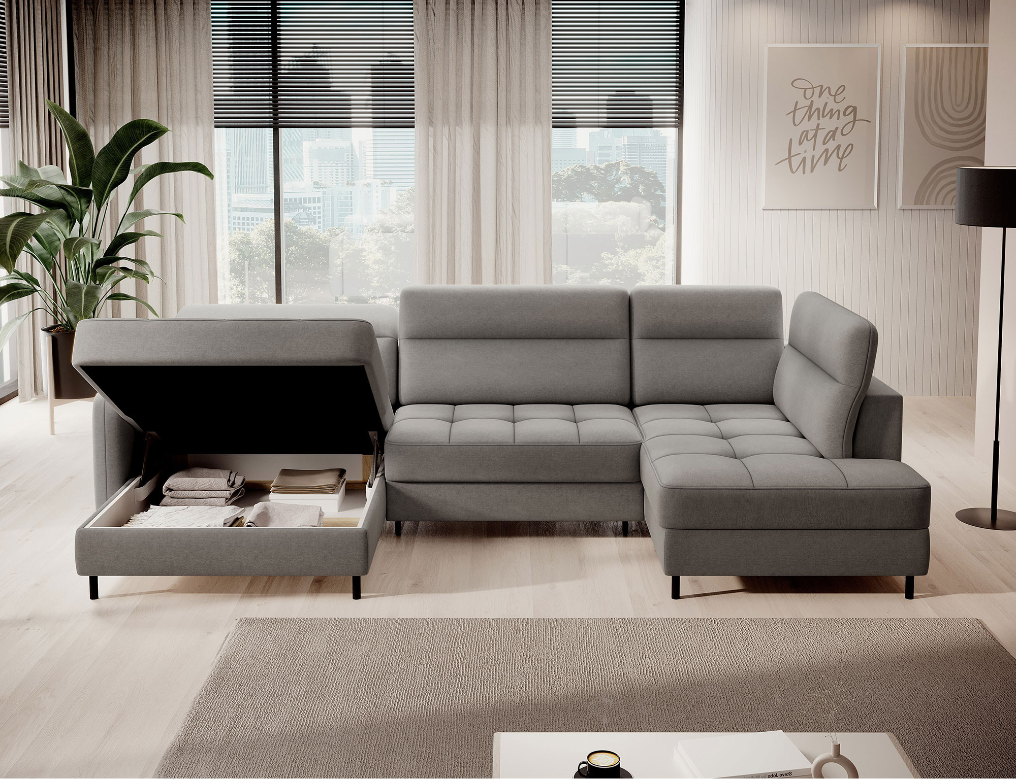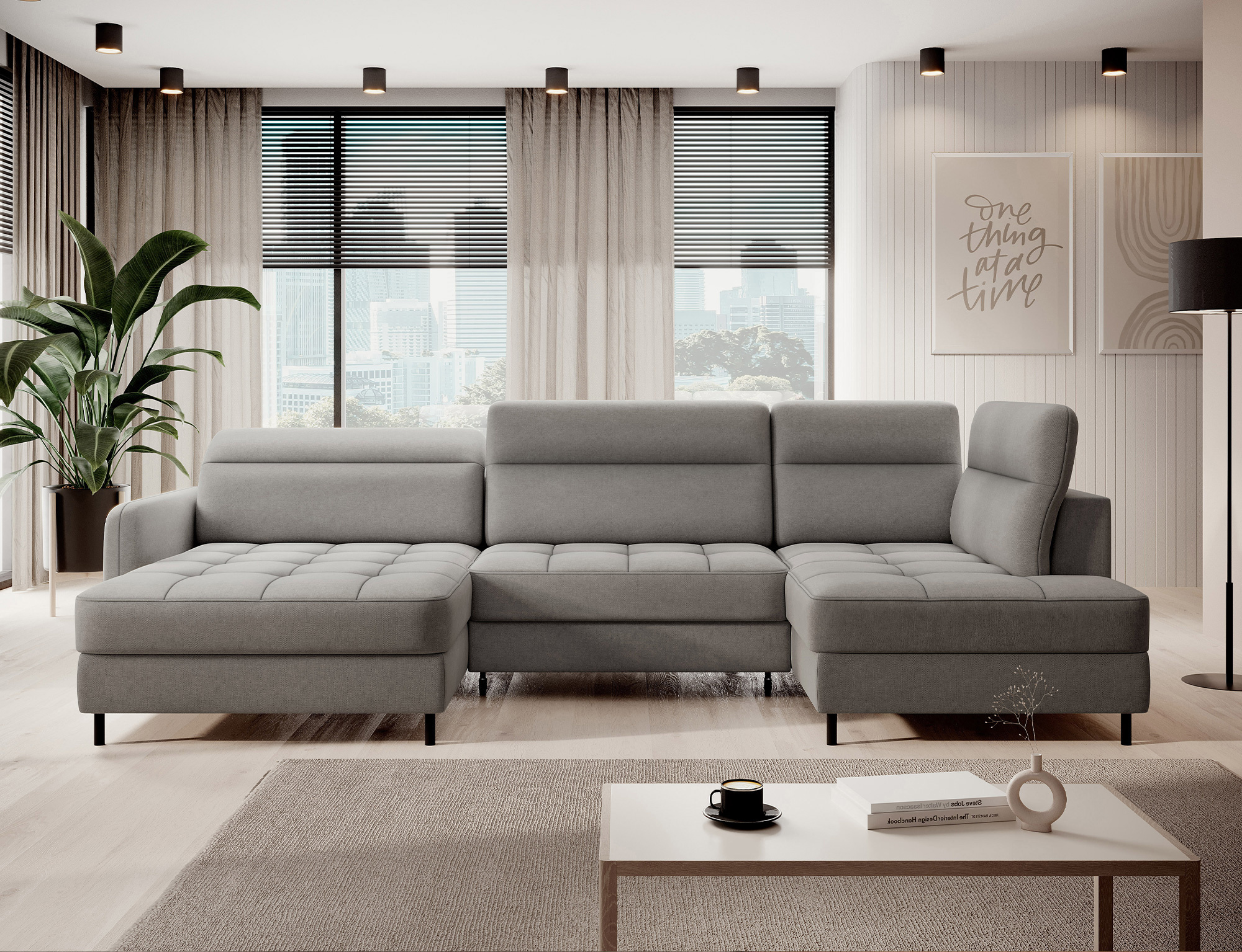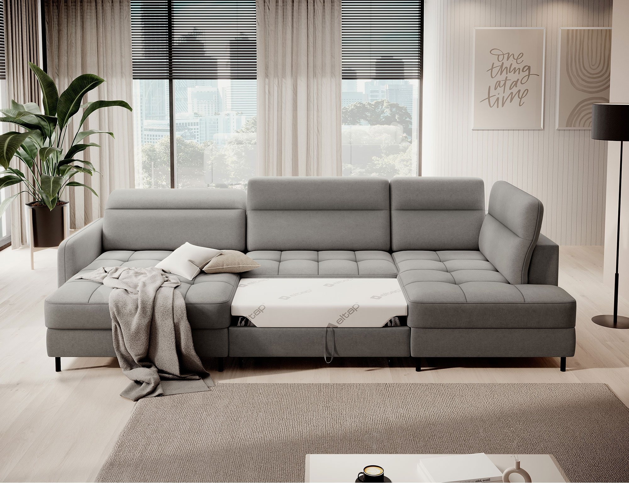 Sedací souprava Berrto v provedení Raquel 04 má sedák vybaven vlnitými pružinami typu B, které v kombinaci s vysoce elastickou pěnou HR + T2130. Opěradla jsou vyplněny čalouněnými popruhy a pěnou T2130. Rozkladem vznikne spací plocha 300x130 cm. Disponuje úložným prostorem. Černé ocelové nohy o výšce 10 cm. Nosnost soupravy je 390 kg. Provedení rohu levé.