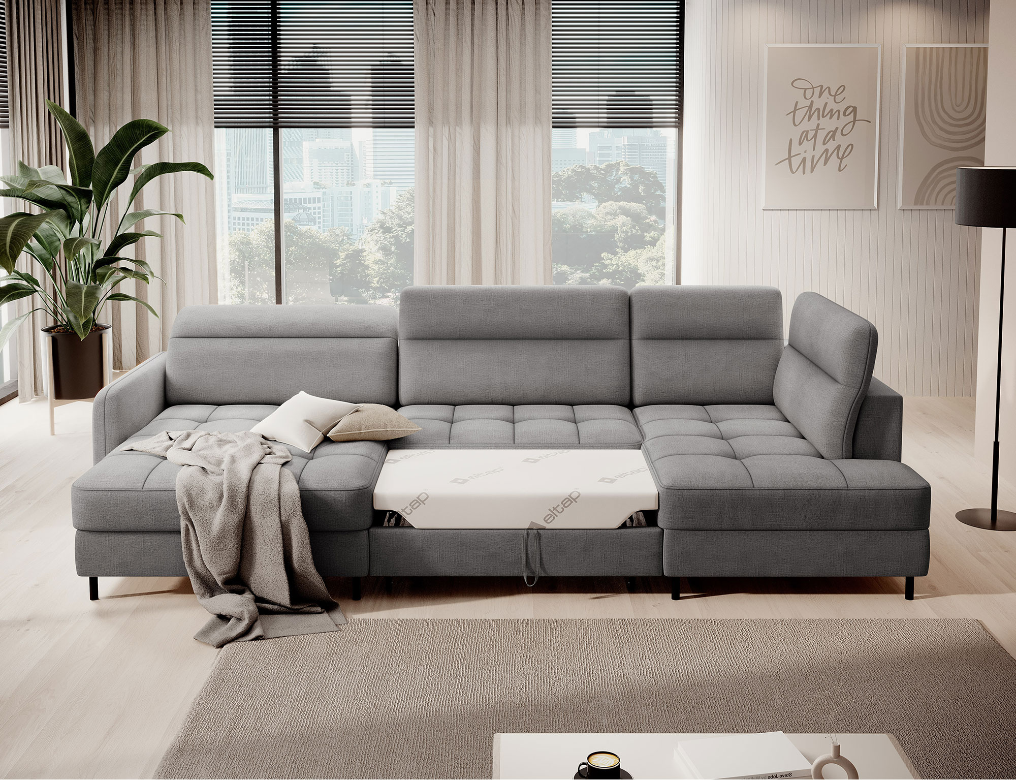 Sedací souprava Berrto v provedení Toscany 03 má sedák vybaven vlnitými pružinami typu B, které v kombinaci s vysoce elastickou pěnou HR + T2130. Opěradla jsou vyplněny čalouněnými popruhy a pěnou T2130. Rozkladem vznikne spací plocha 300x130 cm. Disponuje úložným prostorem. Černé ocelové nohy o výšce 10 cm. Nosnost soupravy je 390 kg. Provedení rohu levé.