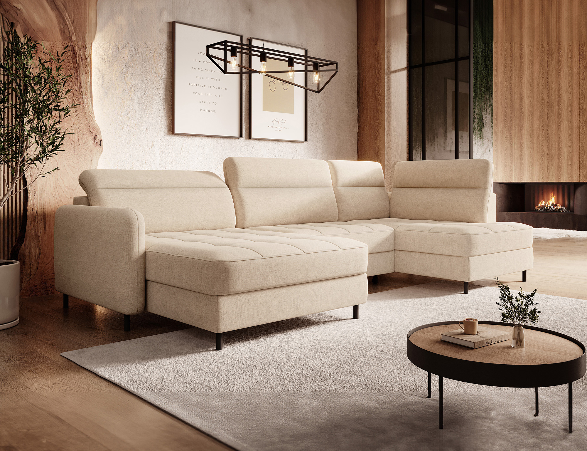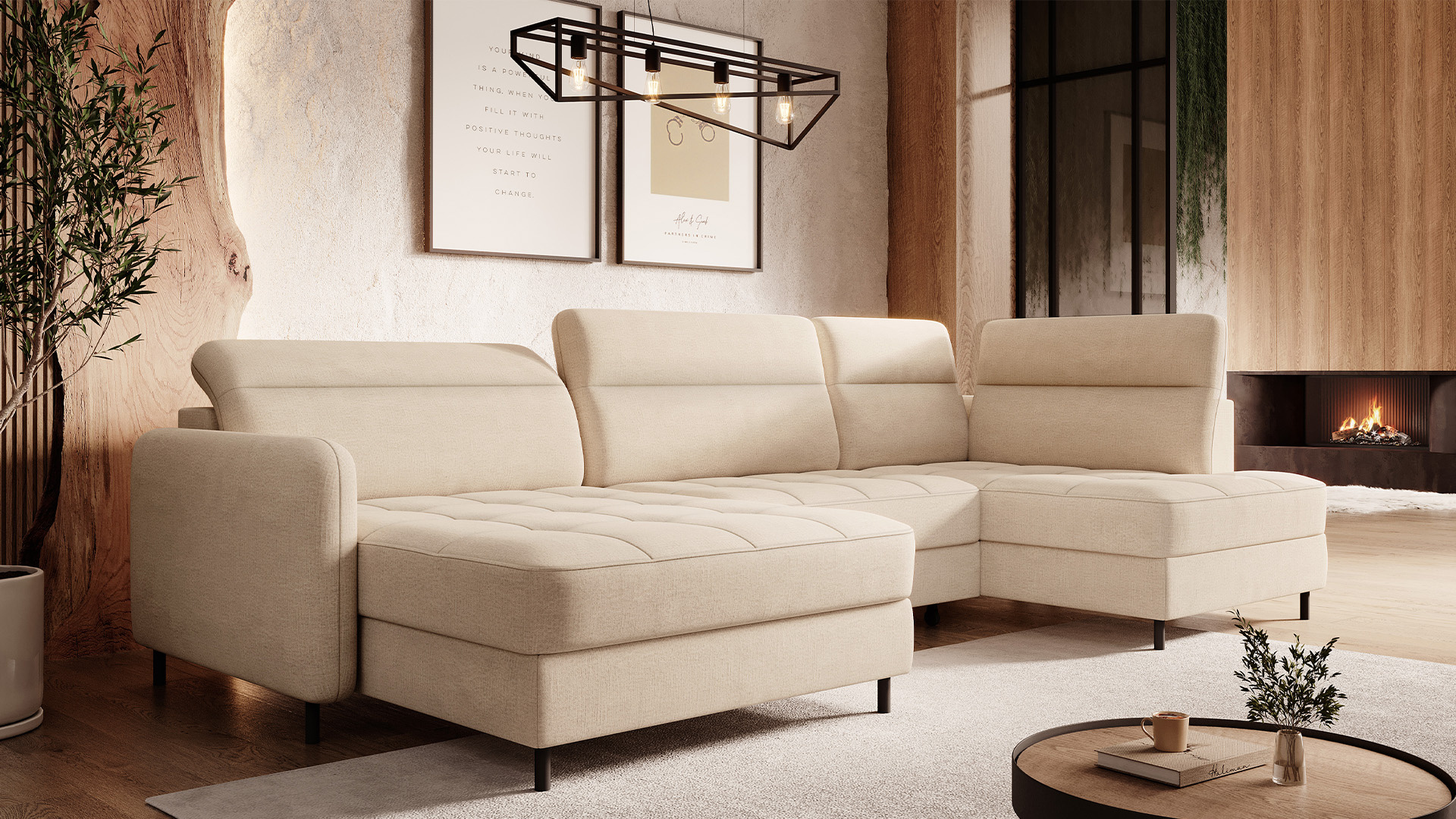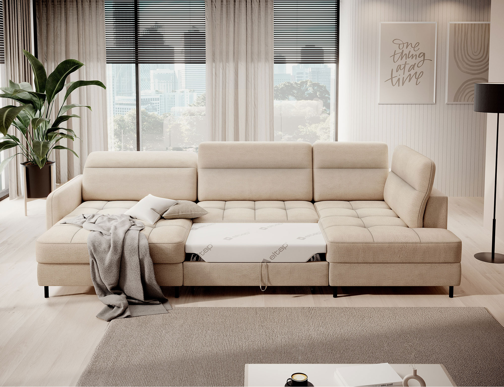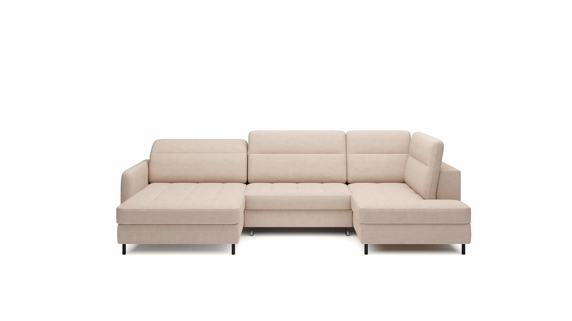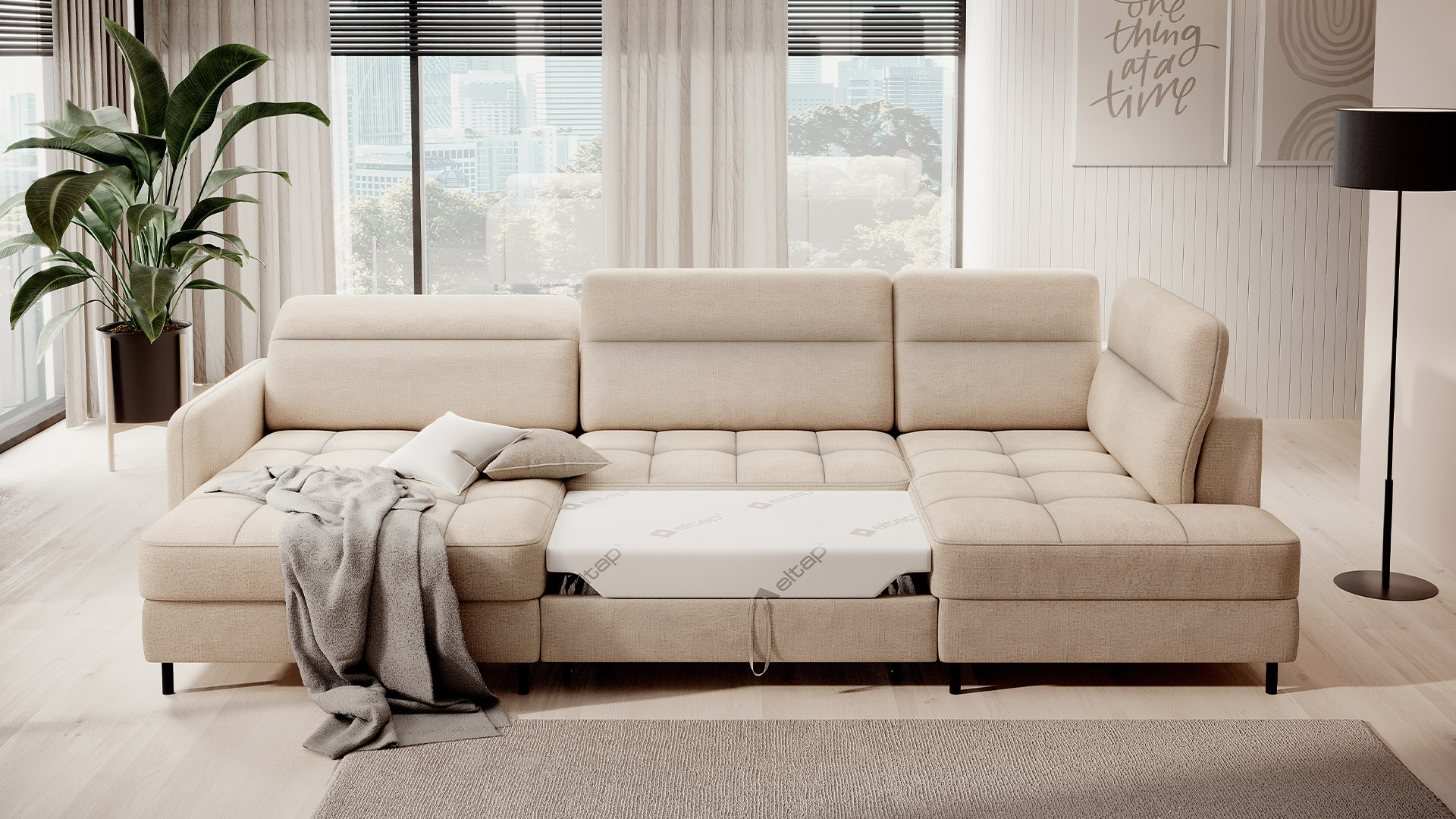 Sedací souprava Berrto v provedení Toscany 18 má sedák vybaven vlnitými pružinami typu B, které v kombinaci s vysoce elastickou pěnou HR + T2130. Opěradla jsou vyplněny čalouněnými popruhy a pěnou T2130. Rozkladem vznikne spací plocha 300x130 cm. Disponuje úložným prostorem. Černé ocelové nohy o výšce 10 cm. Nosnost soupravy je 390 kg. Provedení rohu levé.