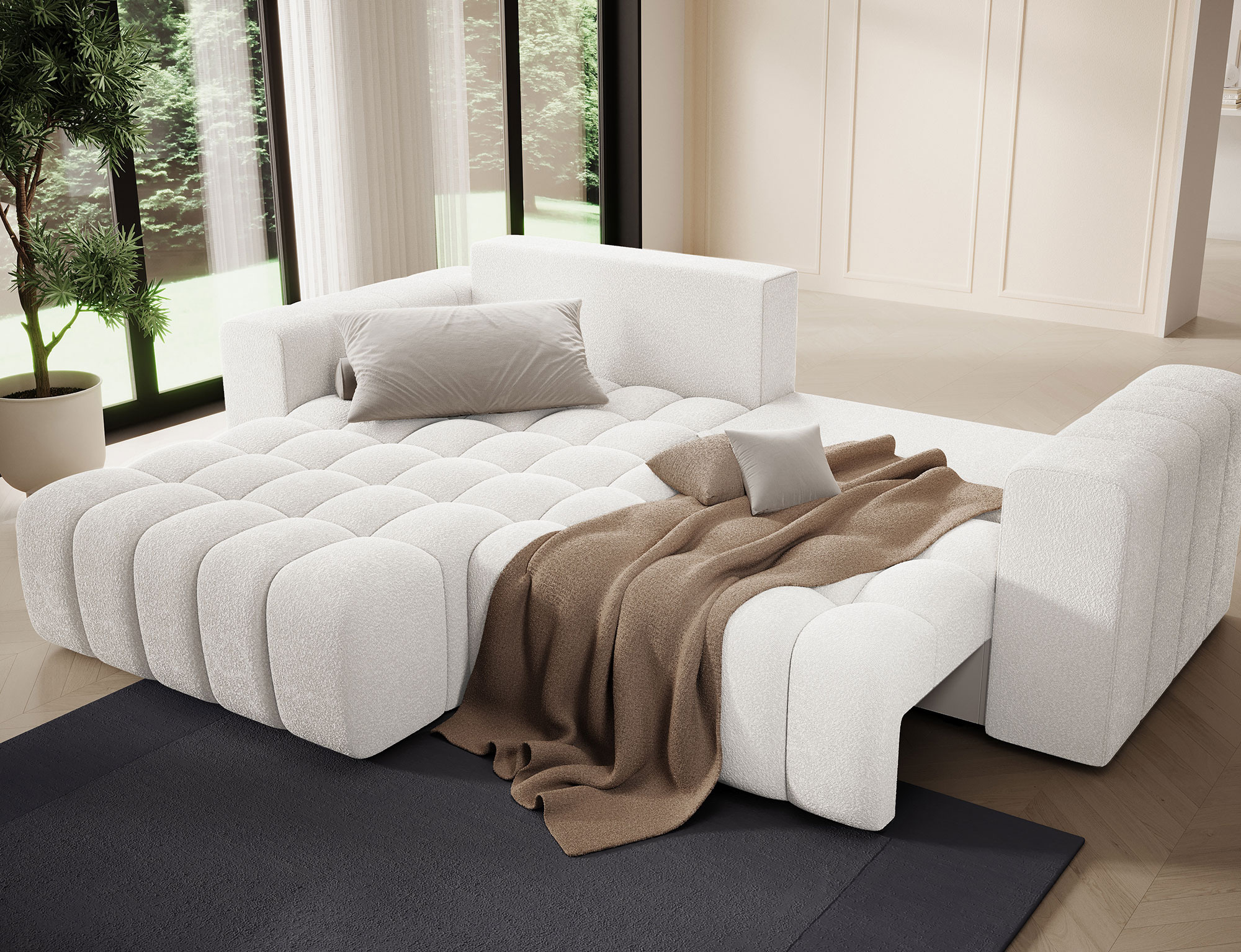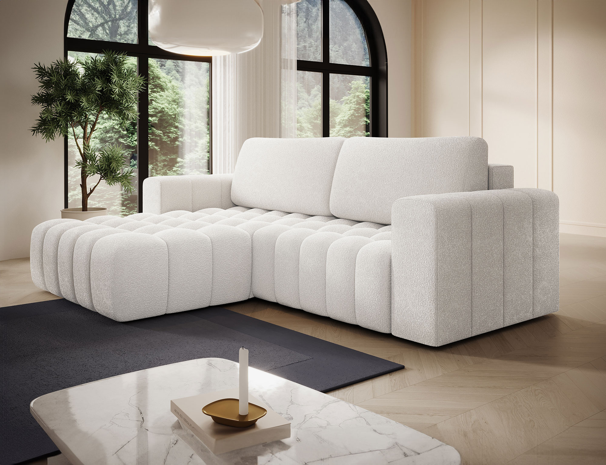 Sedací souprava Bonett v provedení Jaffray 01 má kostru z masivního dřeva a dřevotřísky. Sedák tvoří vlnité pružiny faliste a HR pěna+ T2130. Pomocí rozkladu systému DL vznikne spací plocha 200 x 130 cm. Disponuje úložným prostorem, ukrytým pod funkcí spaní. Záda jsou čalouněná, takže ji můžete umístit i do prostoru. Nohy jsou plastové v černé barvě o výšce 2,5 cm. Nosnost 315 kg. Provedení rohu levé.