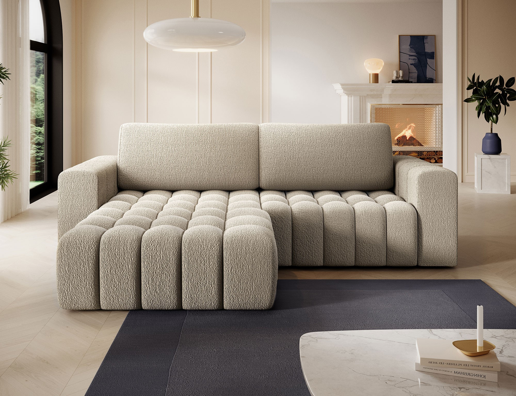 Sedací souprava Bonett v provedení Royal 20 má kostru z masivního dřeva a dřevotřísky. Sedák tvoří vlnité pružiny faliste a HR pěna+ T2130. Pomocí rozkladu systému DL vznikne spací plocha 200 x 130 cm. Disponuje úložným prostorem, ukrytým pod funkcí spaní. Záda jsou čalouněná, takže ji můžete umístit i do prostoru. Nohy jsou plastové v černé barvě o výšce 2,5 cm. Nosnost 315 kg. Provedení rohu levé.