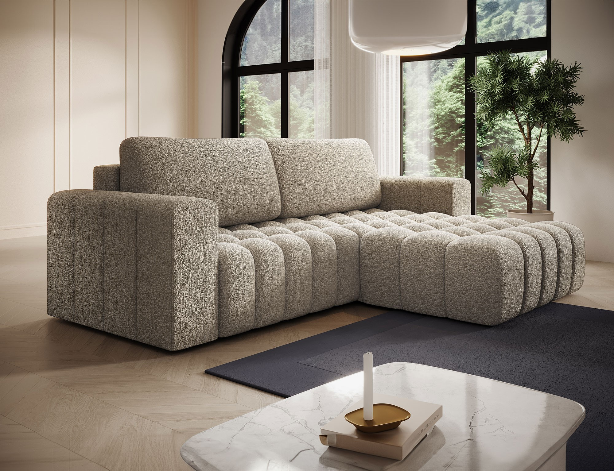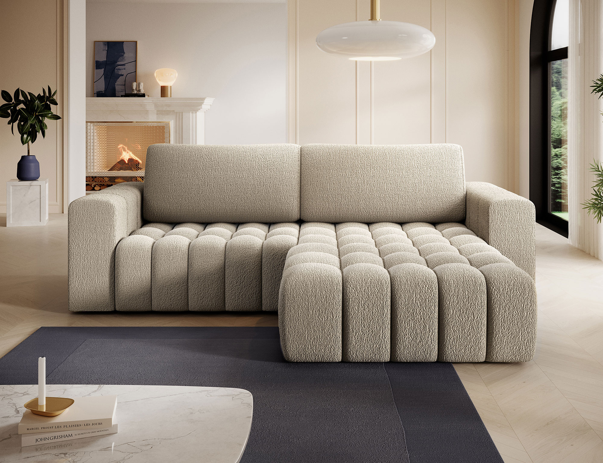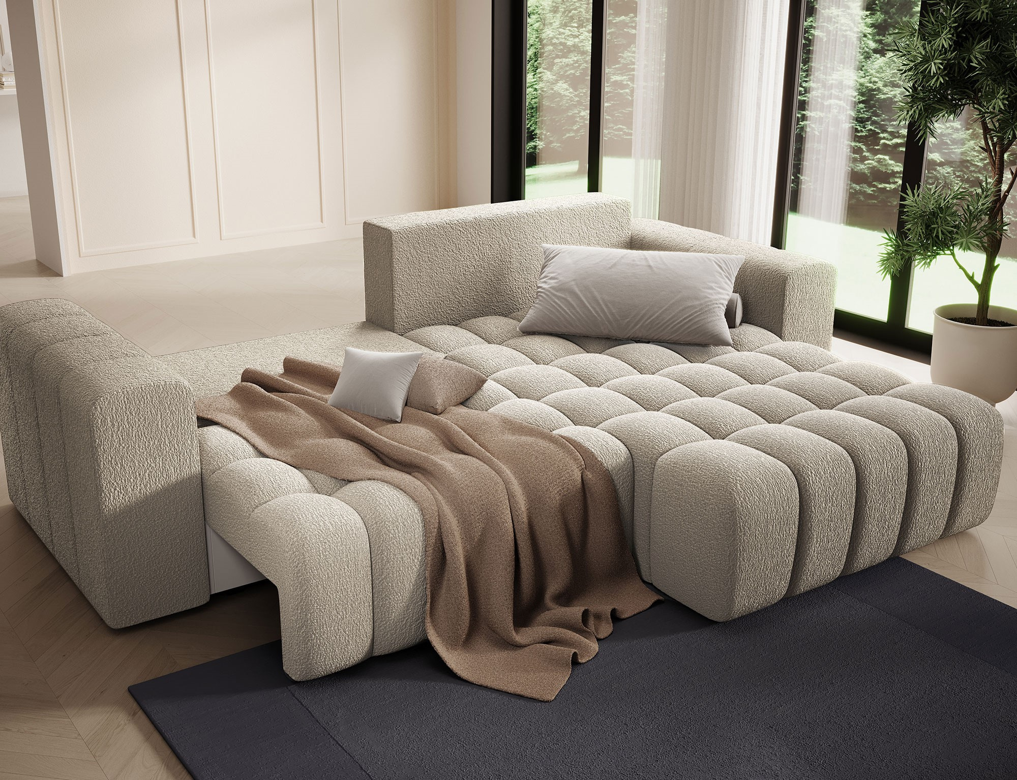 Sedací souprava Bonett v provedení Royal 20 má kostru z masivního dřeva a dřevotřísky. Sedák tvoří vlnité pružiny faliste a HR pěna+ T2130. Pomocí rozkladu systému DL vznikne spací plocha 200 x 130 cm. Disponuje úložným prostorem, ukrytým pod funkcí spaní. Záda jsou čalouněná, takže ji můžete umístit i do prostoru. Nohy jsou plastové v černé barvě o výšce 2,5 cm. Nosnost 315 kg. Provedení rohu pravé.