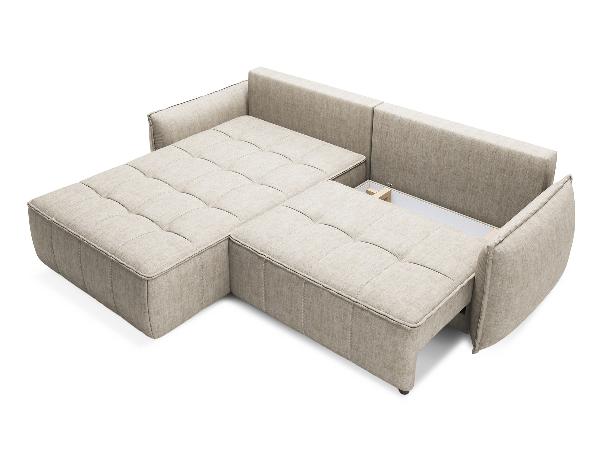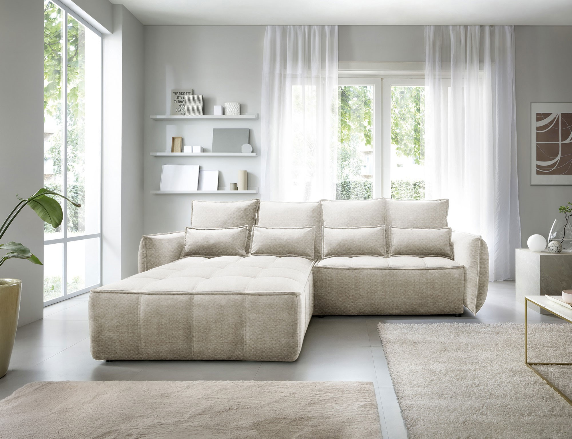 Sedací souprava Campo v provedení Manhattan 18 má rám z borovicového dřeva. Sedadlo je vyplněno pěnou T2130, HR pěnou, nadýchaným flísem. Je vybavena 4 opěrnými polštáři a 4 bederními polštáři, které jsou vyplněny pěnovým granulátem. Pomocí mechanismu DL vznikne spací plocha o rozměru 222x122 cm. Nožky jsou černé plastové o výšce 2,5 cm. Nosnost soupravy 315 kg. Provedení rohu levé. Zboží je částečně smontováno.