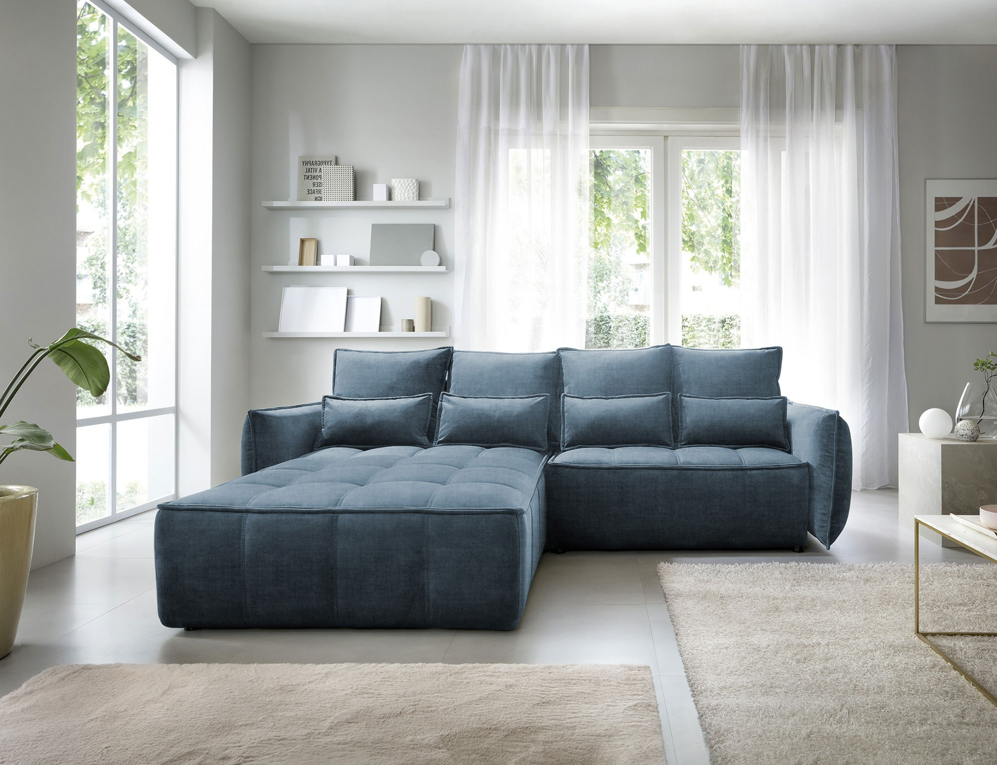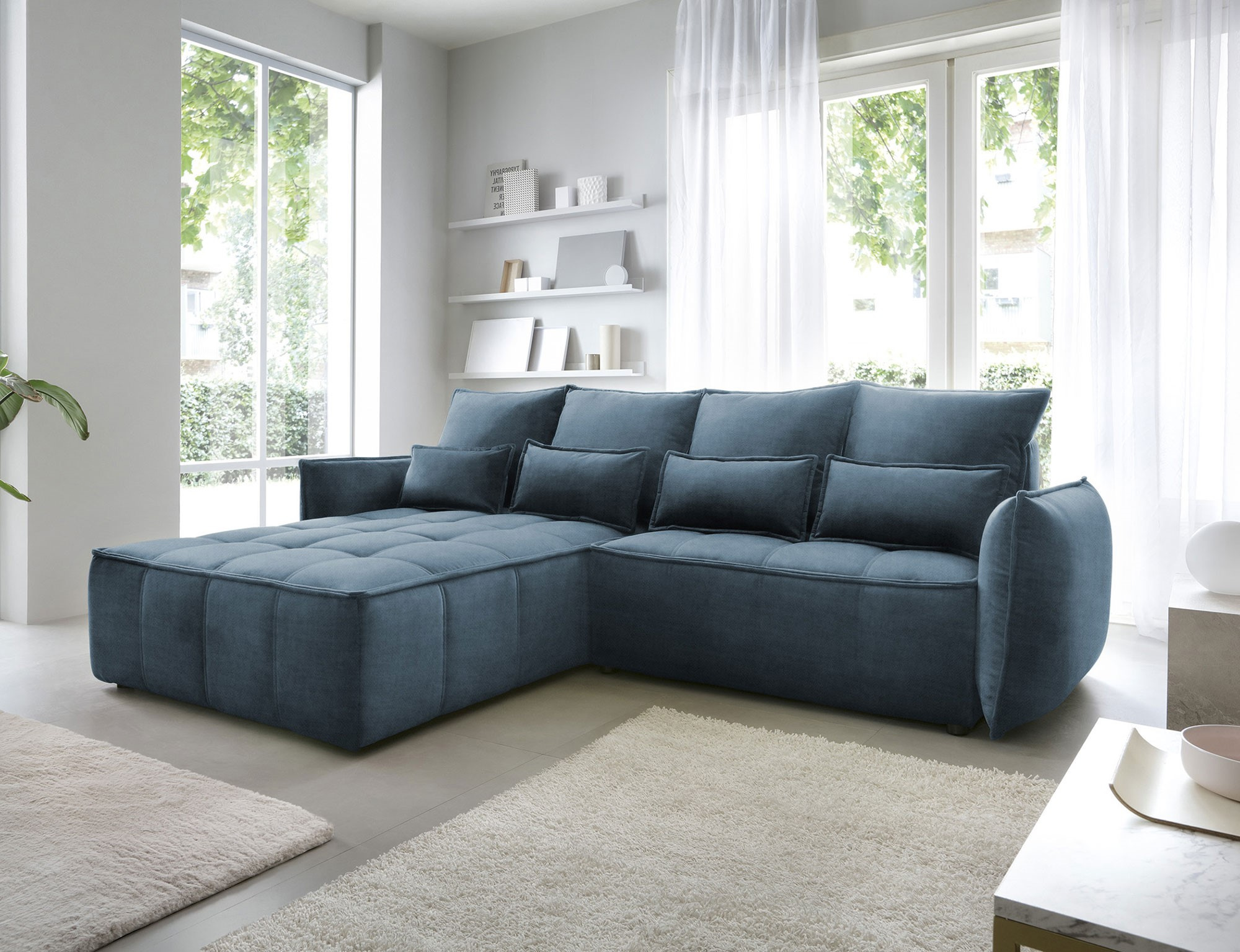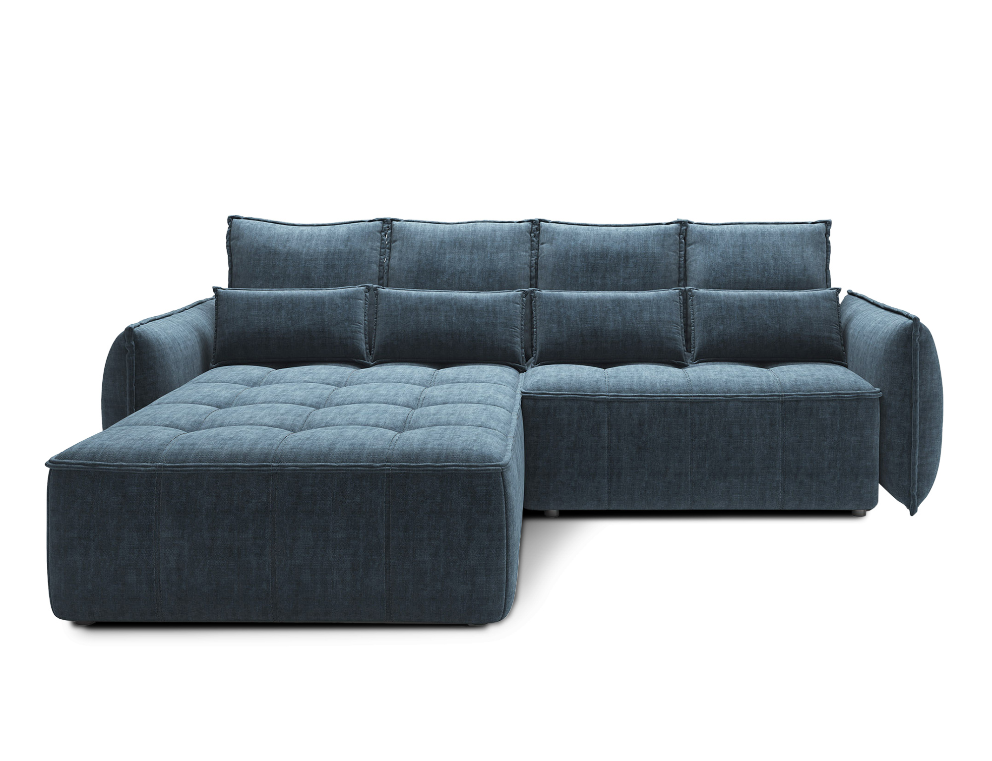 Sedací souprava Campo v provedení Manhattan 40 má rám z borovicového dřeva. Sedadlo je vyplněno pěnou T2130, HR pěnou, nadýchaným flísem. Je vybavena 4 opěrnými polštáři a 4 bederními polštáři, které jsou vyplněny pěnovým granulátem. Pomocí mechanismu DL vznikne spací plocha o rozměru 222x122 cm. Nožky jsou černé plastové o výšce 2,5 cm. Nosnost soupravy 315 kg. Provedení rohu levé. Zboží je částečně smontováno.