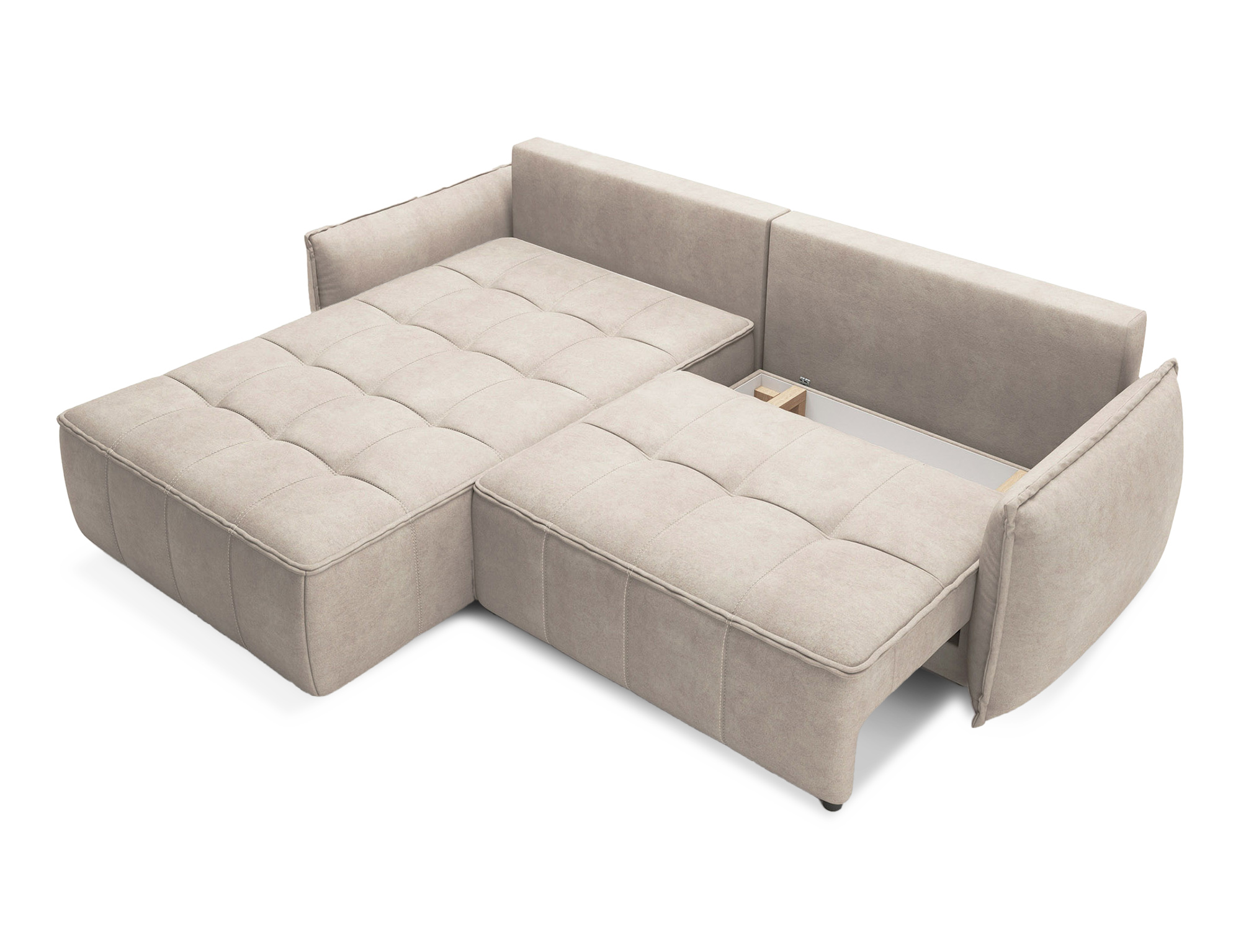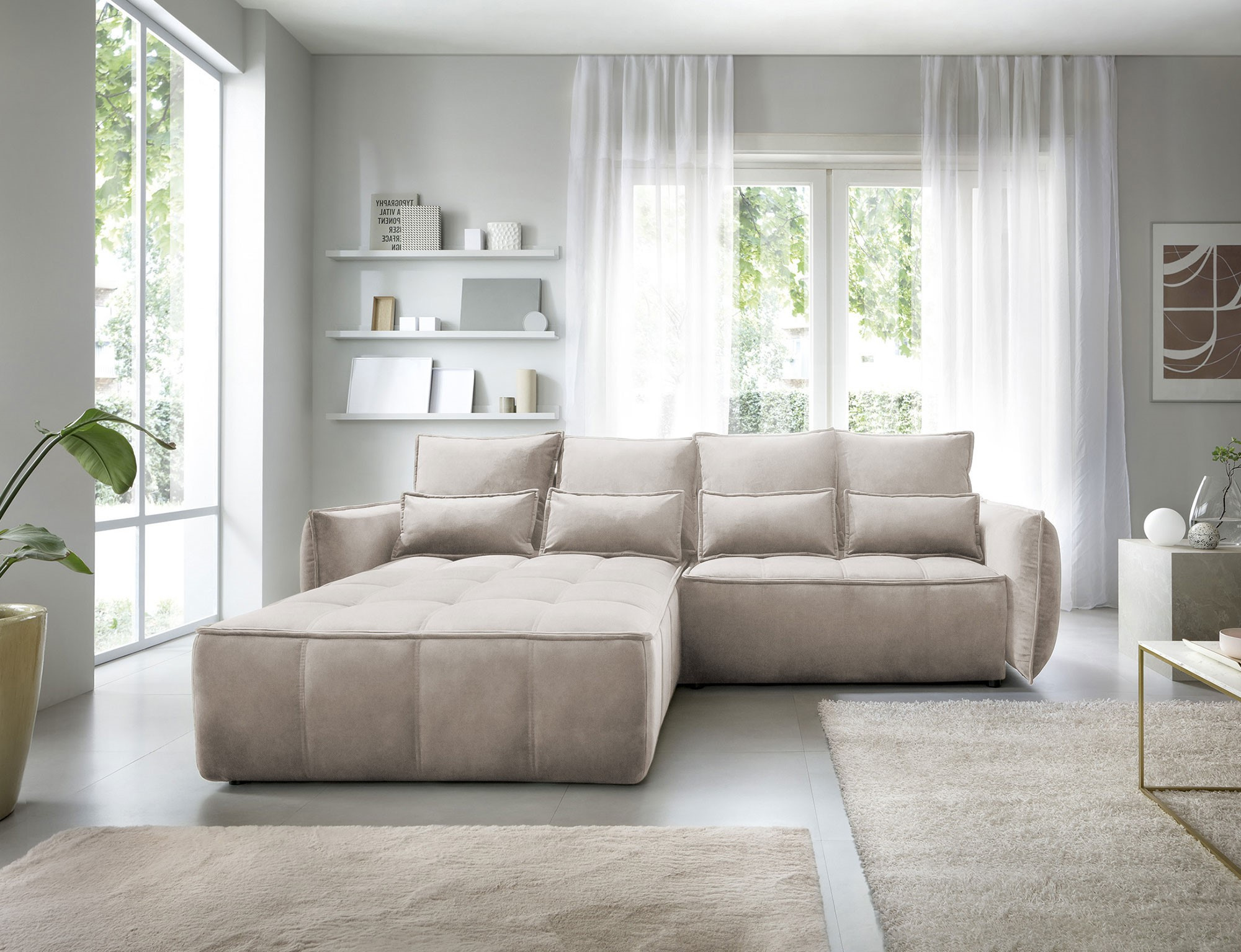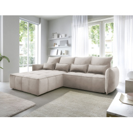 Sedací souprava Campo v provedení Relax 20 má rám z borovicového dřeva. Sedadlo je vyplněno pěnou T2130, HR pěnou, nadýchaným flísem. Je vybavena 4 opěrnými polštáři a 4 bederními polštáři, které jsou vyplněny pěnovým granulátem. Pomocí mechanismu DL vznikne spací plocha o rozměru 222x122 cm. Nožky jsou černé plastové o výšce 2,5 cm. Nosnost soupravy 315 kg. Provedení rohu levé. Zboží je částečně smontováno.
