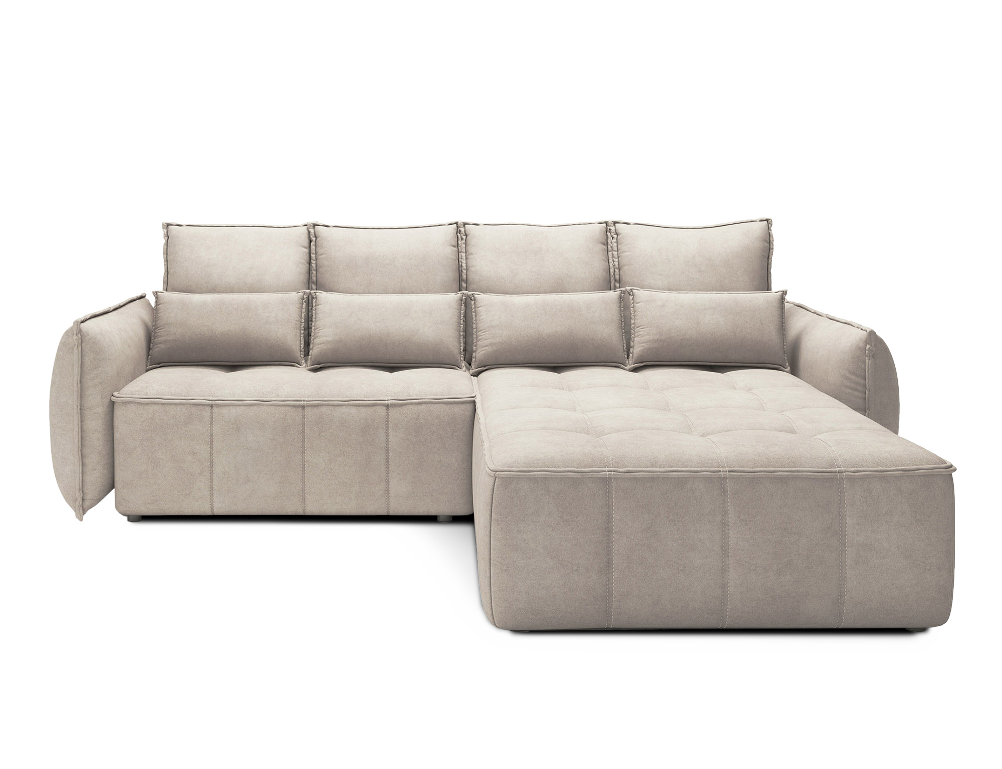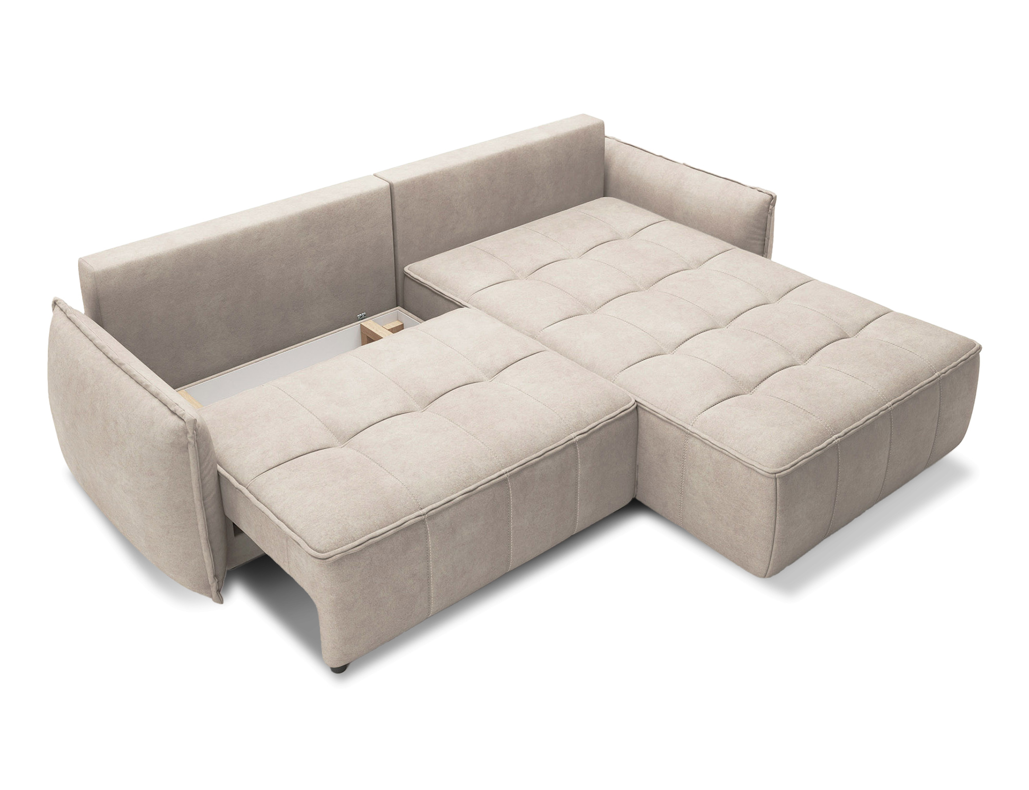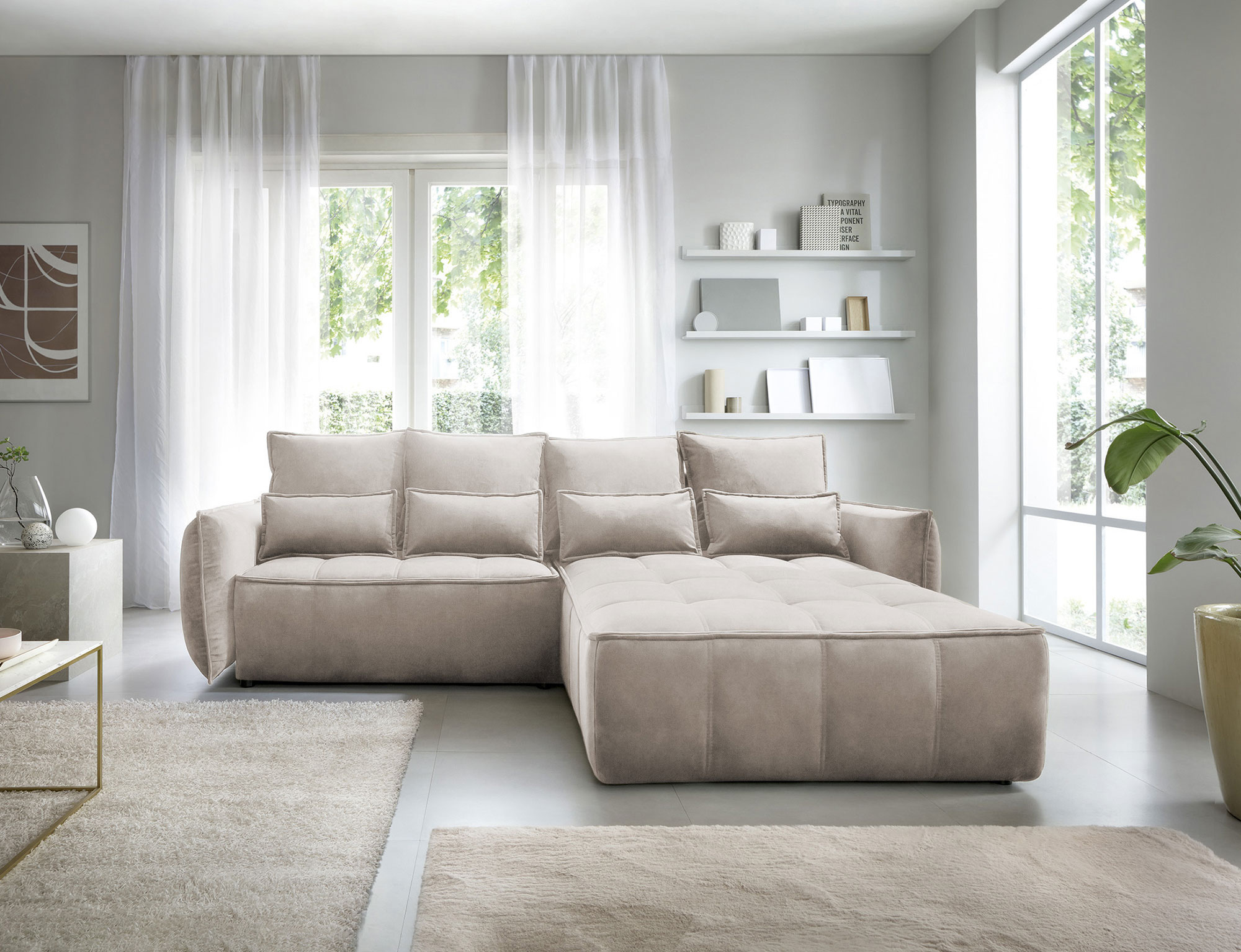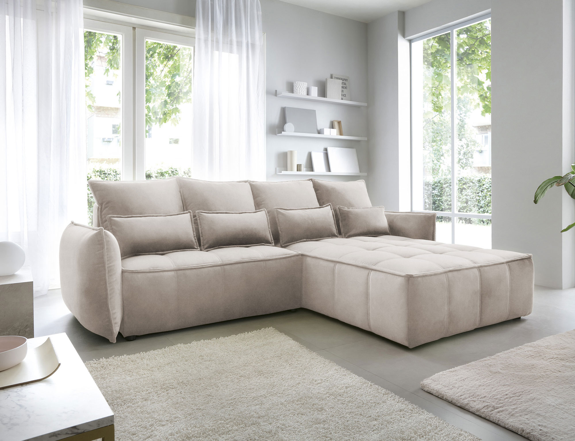 Sedací souprava Campo v provedení Relax 20 má rám z borovicového dřeva. Sedadlo je vyplněno pěnou T2130, HR pěnou, nadýchaným flísem. Je vybavena 4 opěrnými polštáři a 4 bederními polštáři, které jsou vyplněny pěnovým granulátem. Pomocí mechanismu DL vznikne spací plocha o rozměru 222x122 cm. Nožky jsou černé plastové o výšce 2,5 cm. Nosnost soupravy 315 kg. Provedení rohu pravé. Zboží je částečně smontováno.
