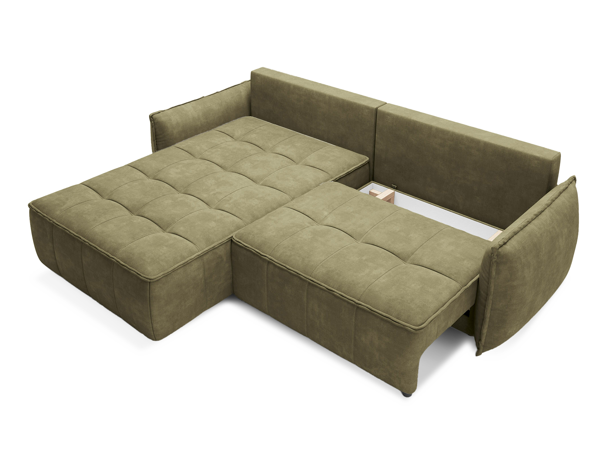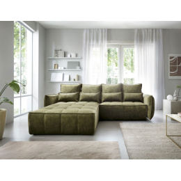 Sedací souprava Campo v provedení Toscany 33 má rám z borovicového dřeva. Sedadlo je vyplněno pěnou T2130, HR pěnou, nadýchaným flísem. Je vybavena 4 opěrnými polštáři a 4 bederními polštáři, které jsou vyplněny pěnovým granulátem. Pomocí mechanismu DL vznikne spací plocha o rozměru 222x122 cm. Nožky jsou černé plastové o výšce 2,5 cm. Nosnost soupravy 315 kg. Provedení rohu levé. Zboží je částečně smontováno.