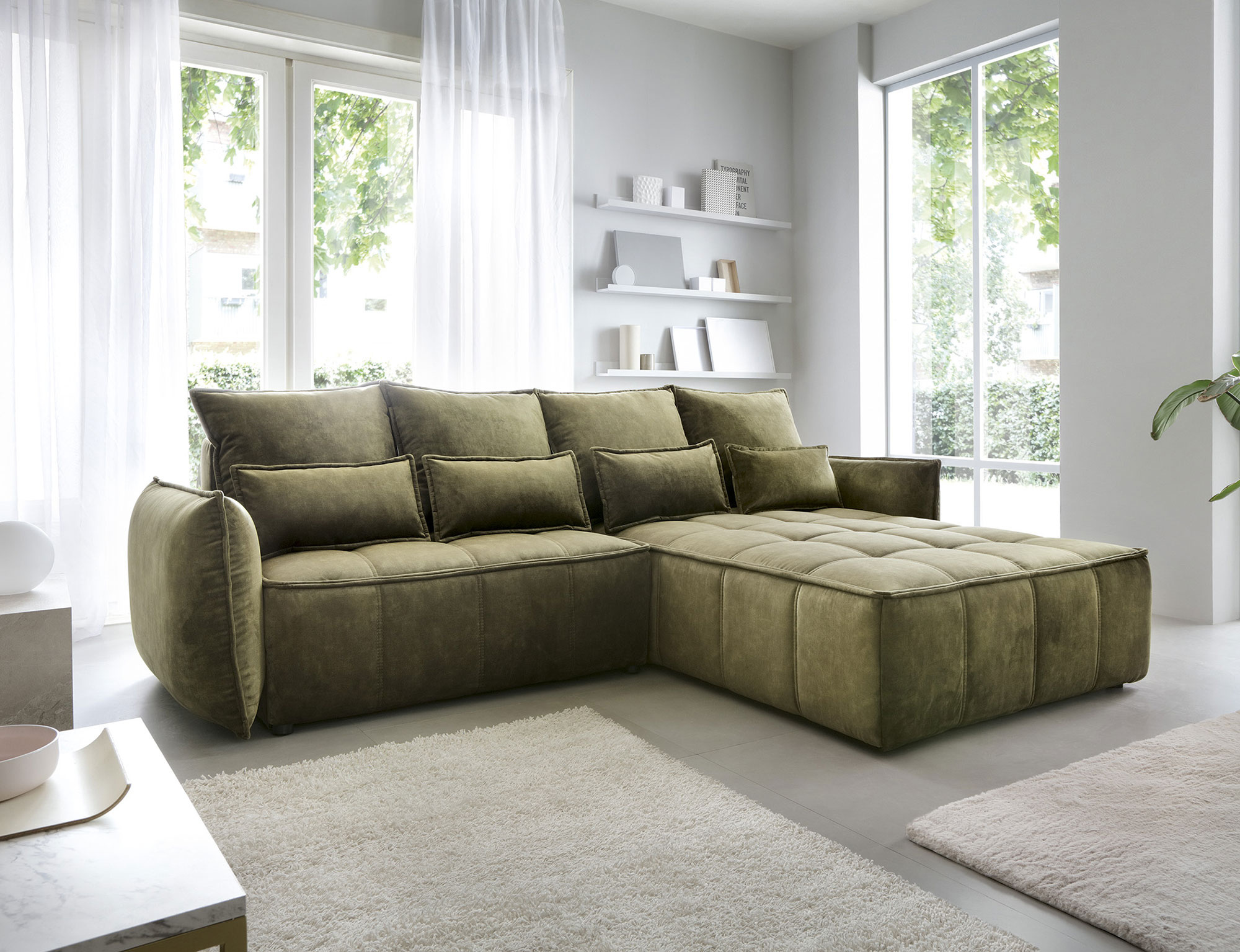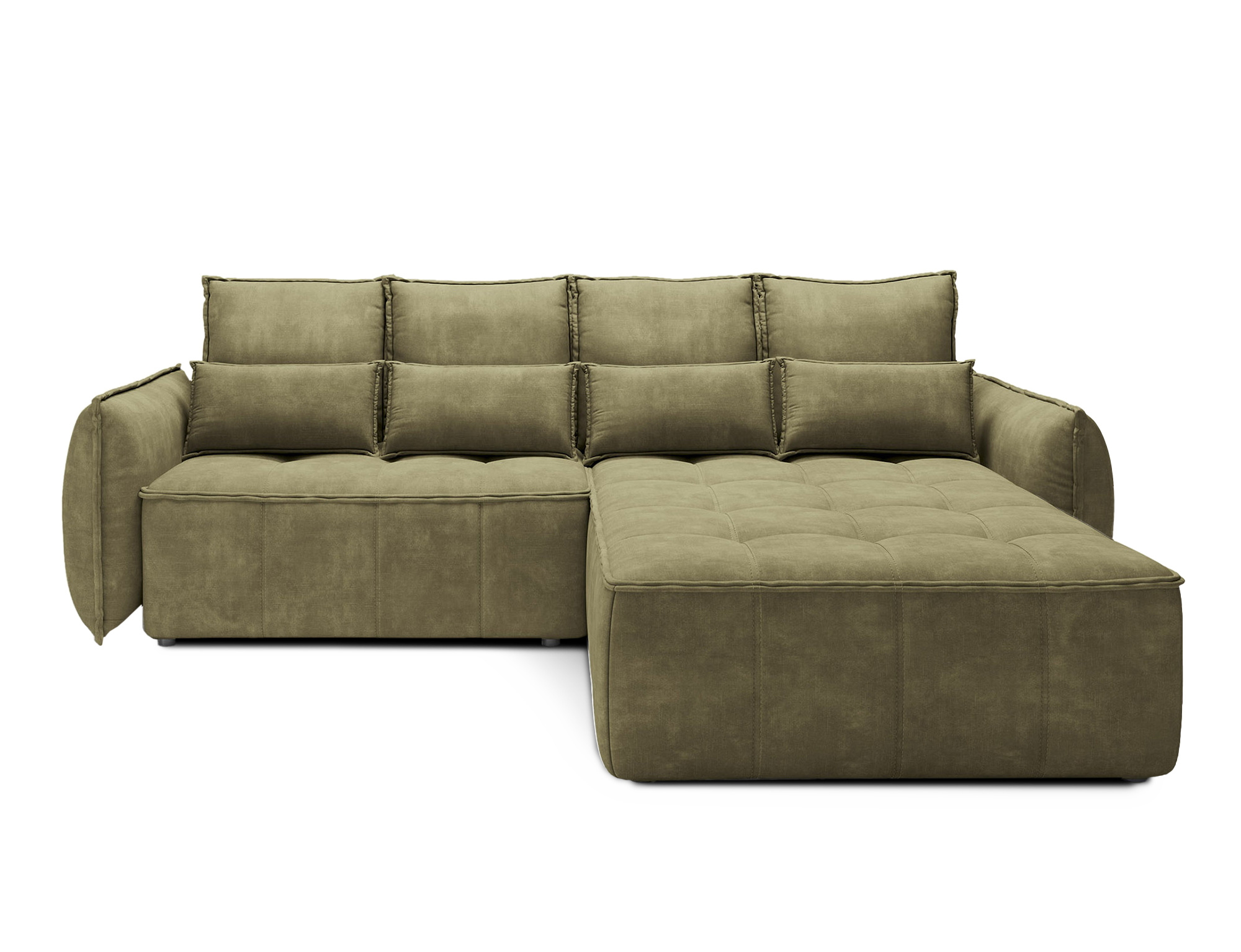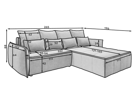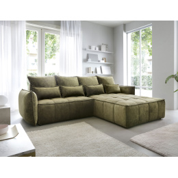 Sedací souprava Campo v provedení Toscany 33 má rám z borovicového dřeva. Sedadlo je vyplněno pěnou T2130, HR pěnou, nadýchaným flísem. Je vybavena 4 opěrnými polštáři a 4 bederními polštáři, které jsou vyplněny pěnovým granulátem. Pomocí mechanismu DL vznikne spací plocha o rozměru 222x122 cm. Nožky jsou černé plastové o výšce 2,5 cm. Nosnost soupravy 315 kg. Provedení rohu pravé. Zboží je částečně smontováno.