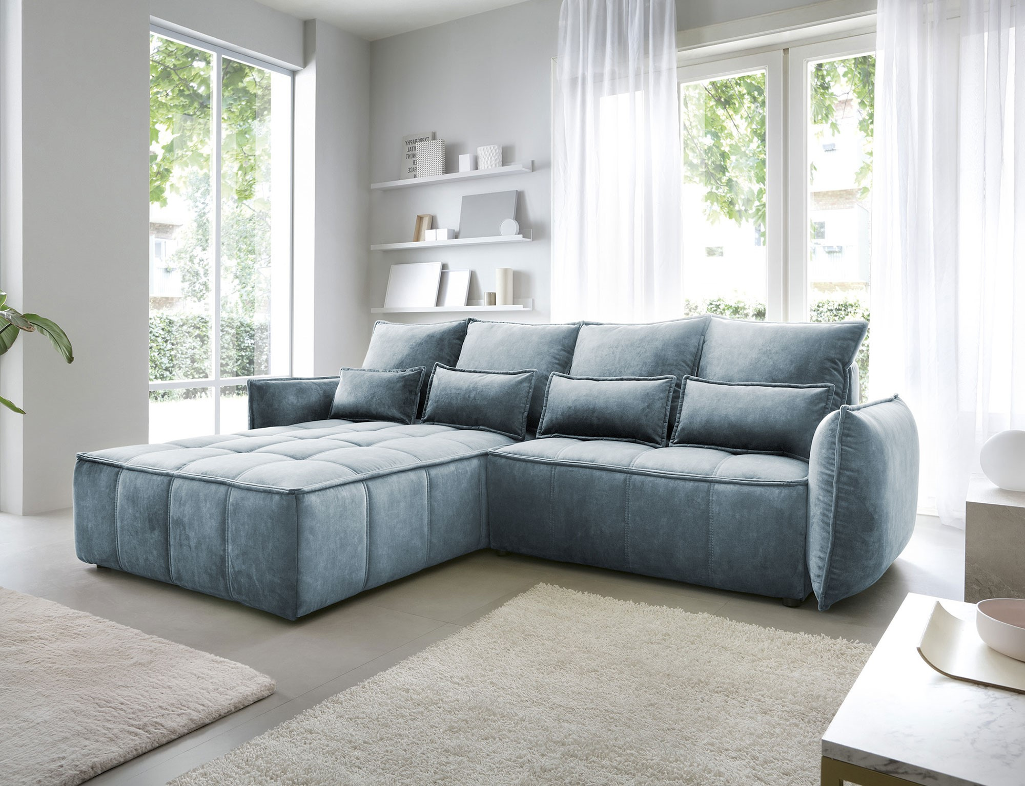 Sedací souprava Campo v provedení Toscany 40 má rám z borovicového dřeva. Sedadlo je vyplněno pěnou T2130, HR pěnou, nadýchaným flísem. Je vybavena 4 opěrnými polštáři a 4 bederními polštáři, které jsou vyplněny pěnovým granulátem. Pomocí mechanismu DL vznikne spací plocha o rozměru 222x122 cm. Nožky jsou černé plastové o výšce 2,5 cm. Nosnost soupravy 315 kg. Provedení rohu levé. Zboží je částečně smontováno.