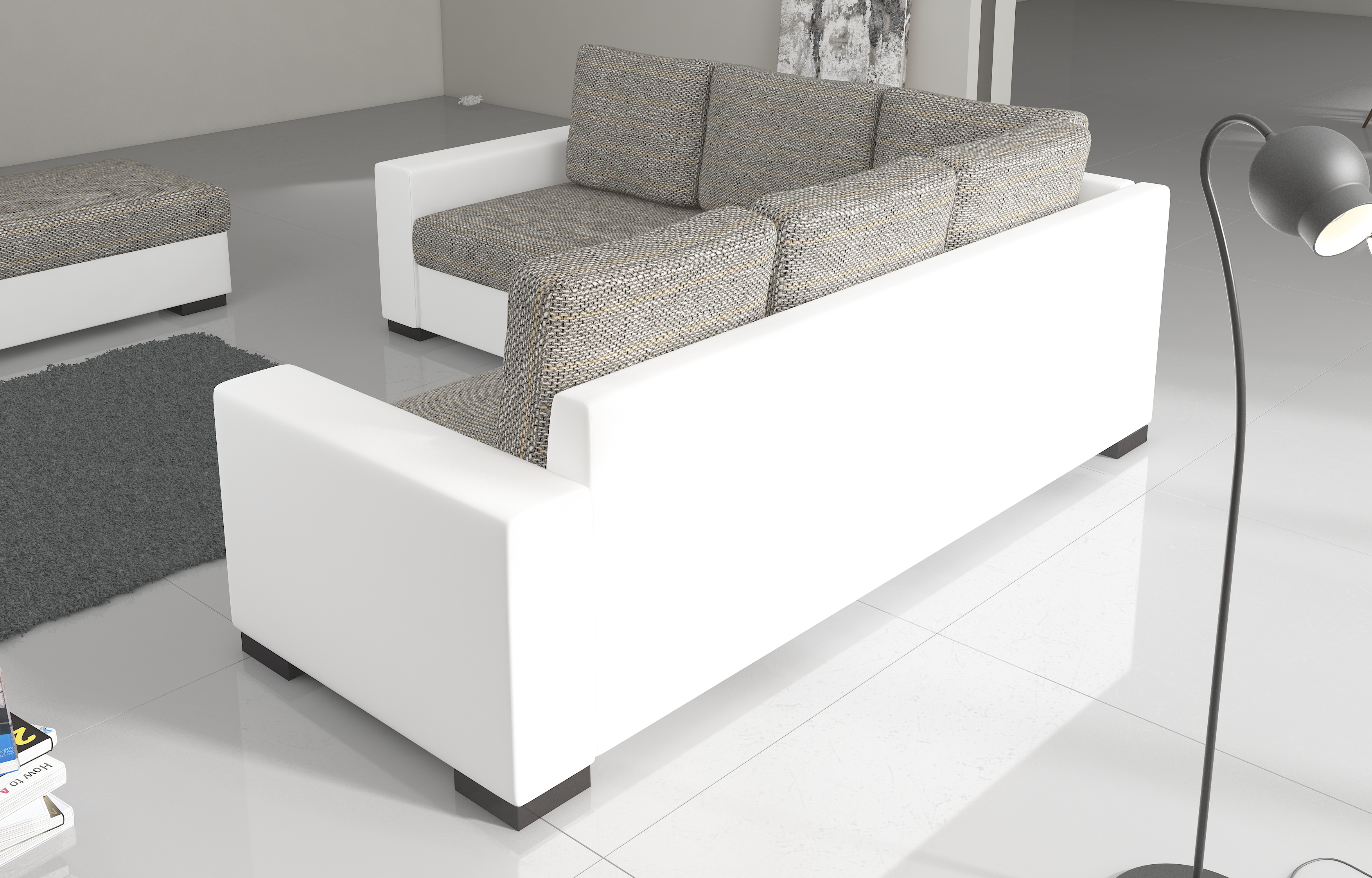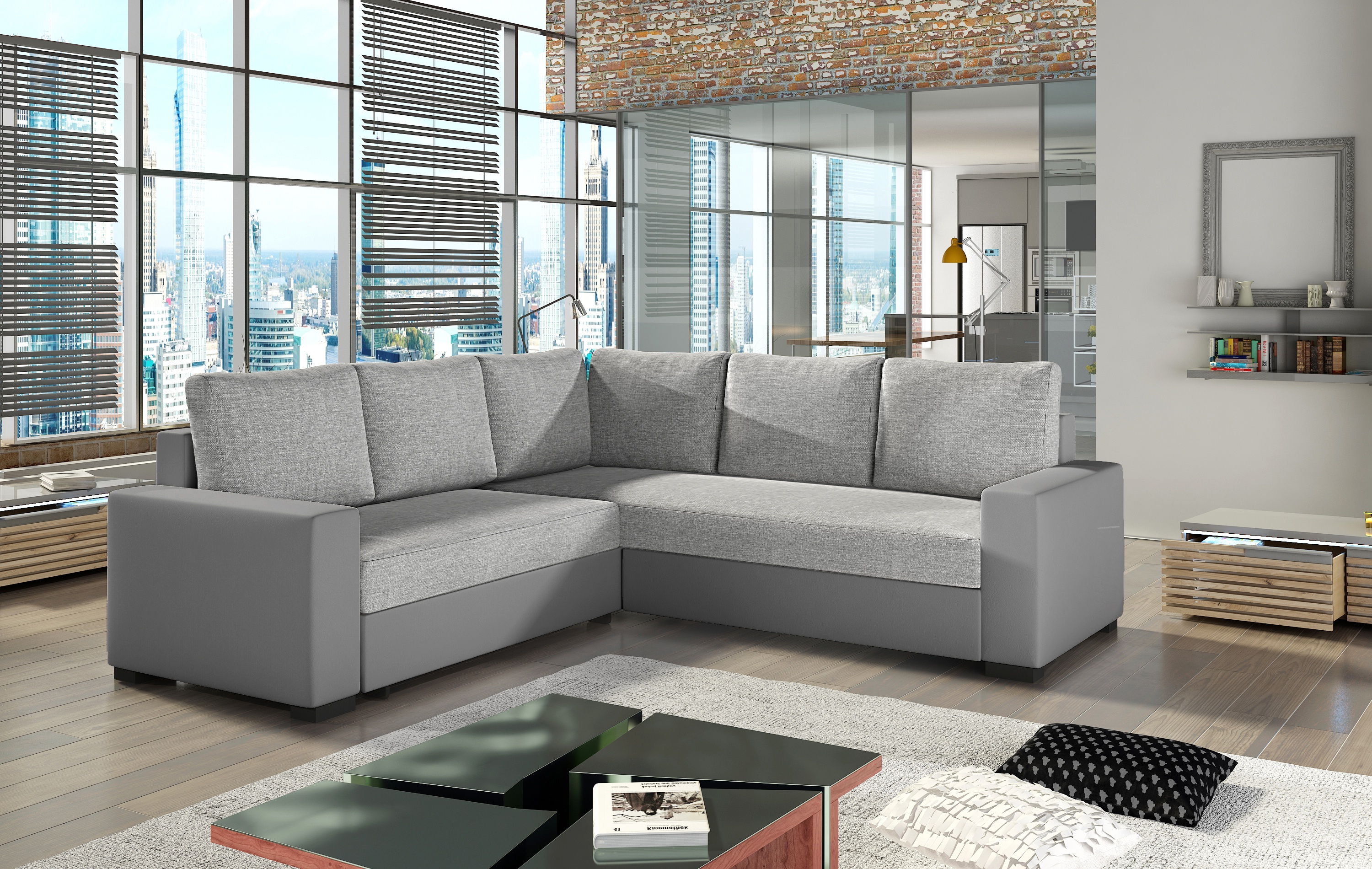 Rozkládací souprava s úložným prostorem v barevném provedení světle šedá látka/eko kůže šedá. Spací plocha 195x135 cm. Výplň sedáků je vyrobena z bonelu a T25 pěny - díky tomu je extrémně měkký, přičemž si zachovává flexibilitu a zaručuje dostatečnou podporu a stabilizaci těla během odpočinku. Sedací souprava je variabilní. Potahová látka jako na hlavní fotografii.