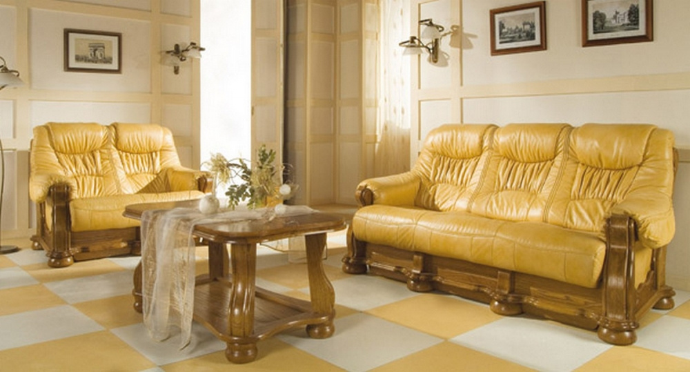 Moderní luxusní rozkládací sedací souprava je vyrobena z pravé hovězí kůže. Kostra je vyrobena z tvrdého dubového dřeva s pevnou konstrukcí. Na bocích této soupravy je ručně vyřezaný motiv. Výplň sedáků je vysoce kvalitní polyuretanová pěna s pružinou bonel. Souprava se skládá z pohovky + 2 křesel. Pohovka 3R s rozkladem na příležitostné spaní, spací plocha 140x190 cm. Možnost výběru barvy kůže i složení sedací soupravy CEZAR I. Vámi zvolenou variantu barvy kůže i dřeva (dle přiloženého vzorníku) uveďte do objednávky.