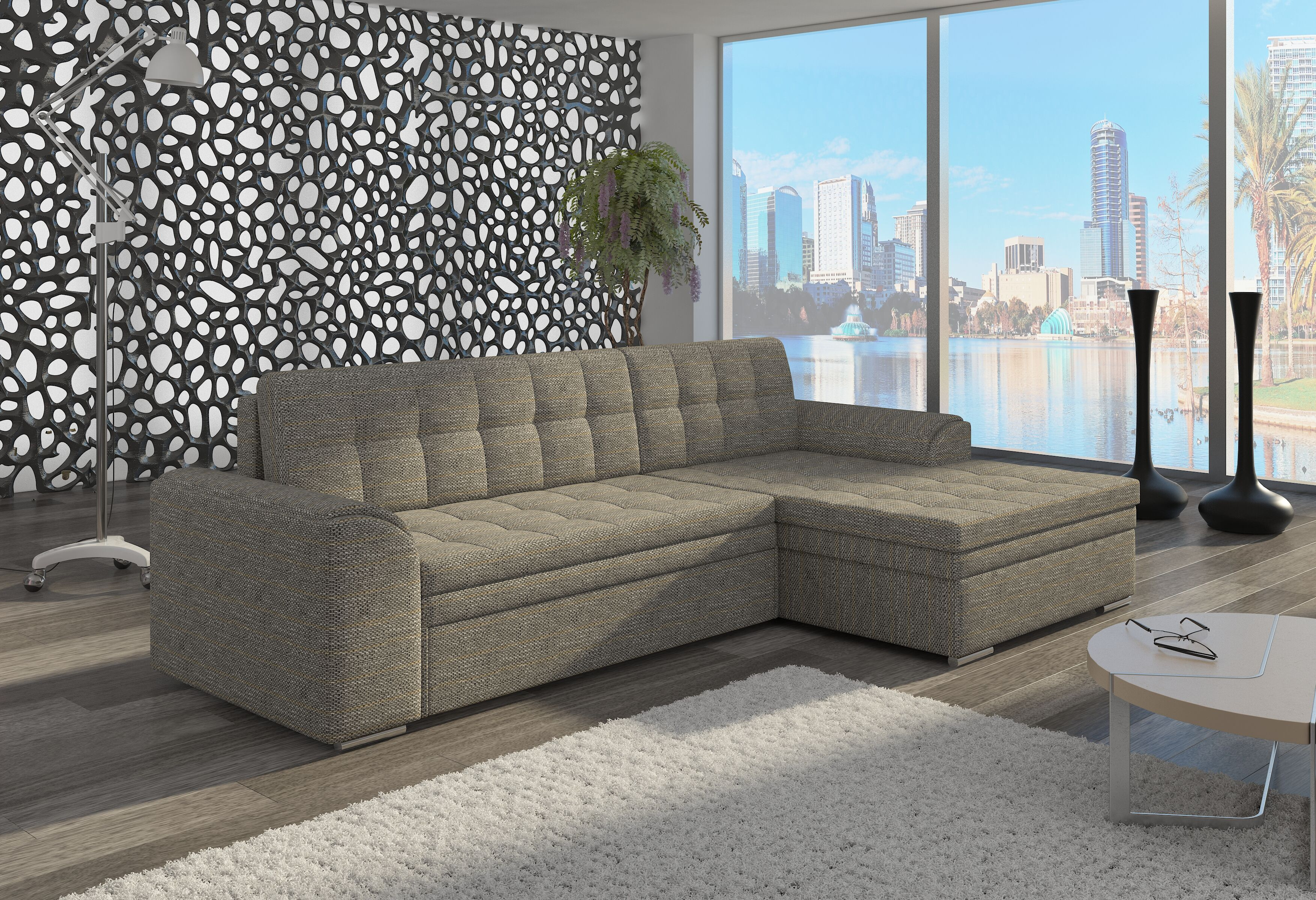 Sedací souprava Conforti v provedení Berlin 01 má rám vyrobený v borovicového dřeva. Sedák je vyplněn kvalitní pěnou HR-T30. Pomocí mechanismu DL vznikne spací plocha o rozměru 215x128 cm. Nožky jsou stříbrné plastové o výšce 5 cm. Nosnost soupravy 270 kg. Provedení rohu pravé.