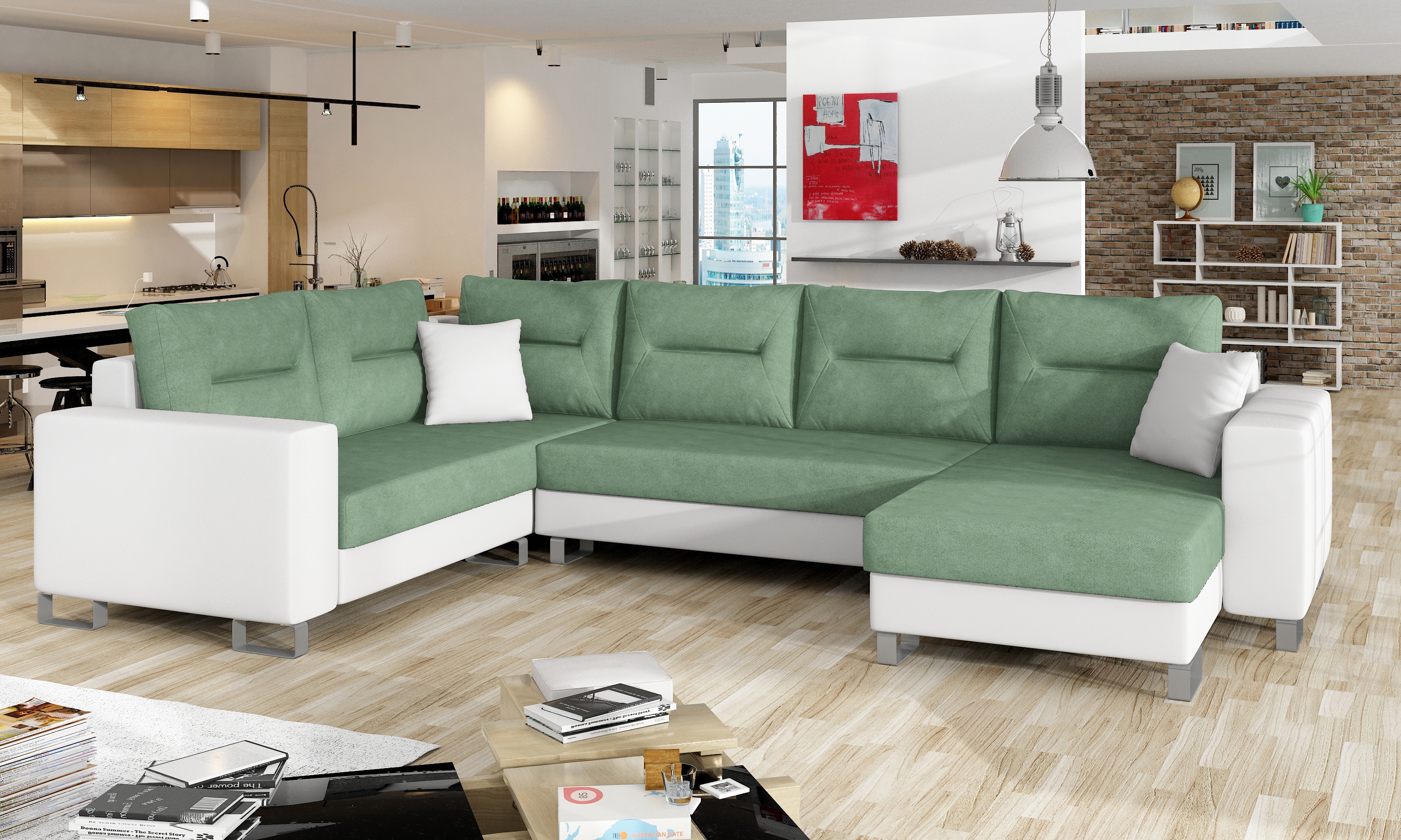 Rozkládací souprava s úložným prostorem v barevném provedení zelená/eko kůže bílá. Spací plocha 285x130 cm. Výplň sedáků je vyrobena z bonelu a T25 pěny - díky tomu je extrémně měkký, přičemž si zachovává flexibilitu a zaručuje dostatečnou podporu a stabilizaci těla během odpočinku. Vysoké područky dávají eleganci a příznivě ovlivňují pohodlí odpočinku. Stejně jako opěradlo - díky vhodnému profilování si uživatel během odpočinku udržuje správnou polohu a chrání páteř. Na druhé straně jemná dekorace ve formě prošívání středem opěradla činí model výraznějším. Potahová látka jako na hlavní fotografii, provedení pravé. Možnost výběru pravého/levého provedení.