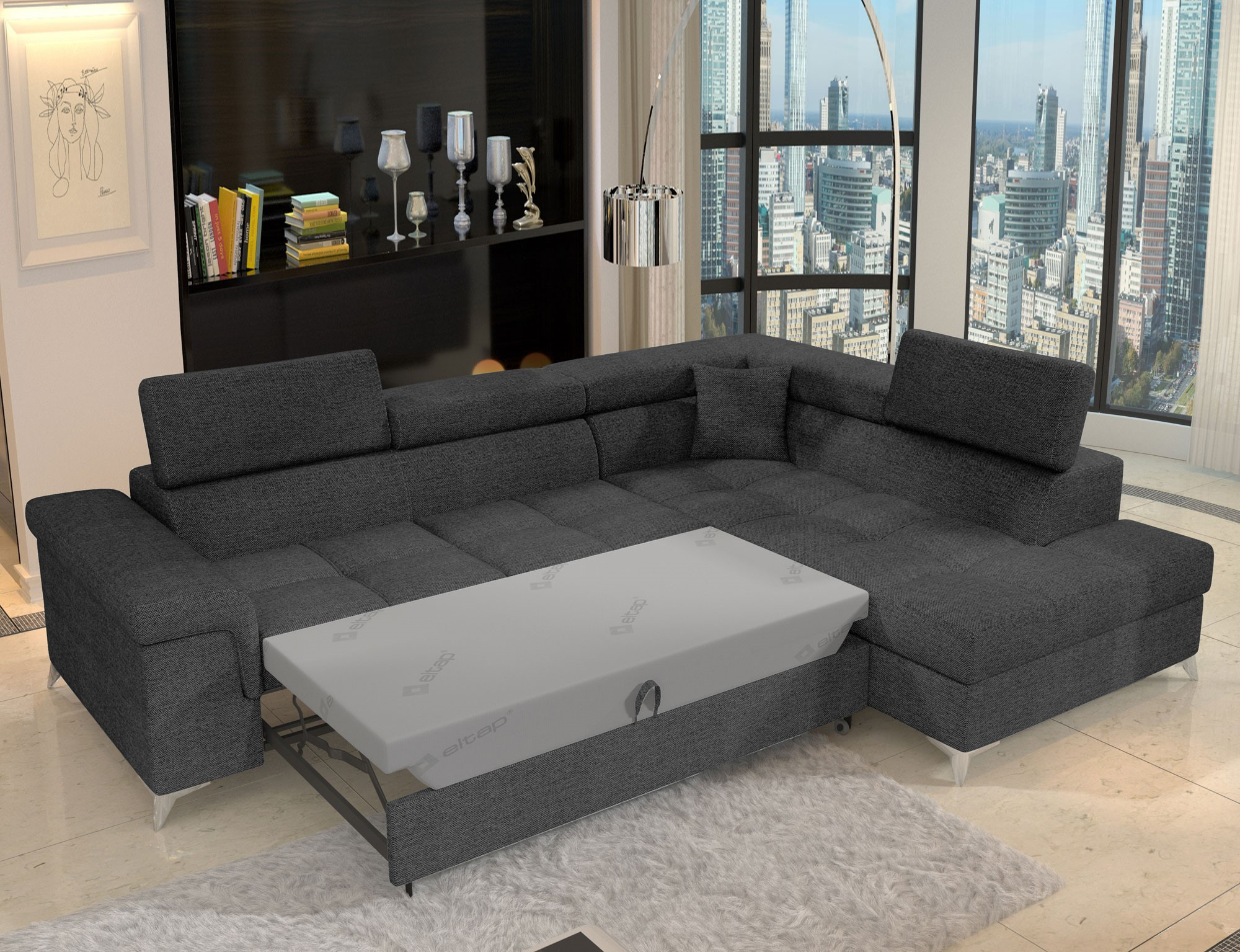Sedací souprava Eridano v provedení Inari 96 má rám z borovicového dřeva. Sedadlo je vyplněno vlnovou pružinou s pěnou T3030 a vysoce kvalitní elastickou HR pěnou. Pomocí mechanismu DL vznikne spací plocha o rozměru 193x123 cm. Nožky jsou kovové stříbrné o výšce 9 cm. Disponuje úložným prostorem. Nosnost soupravy 315 kg. Provedení rohu pravé. Dekorační polštářek je součástí. Zboží je částečně smontováno.